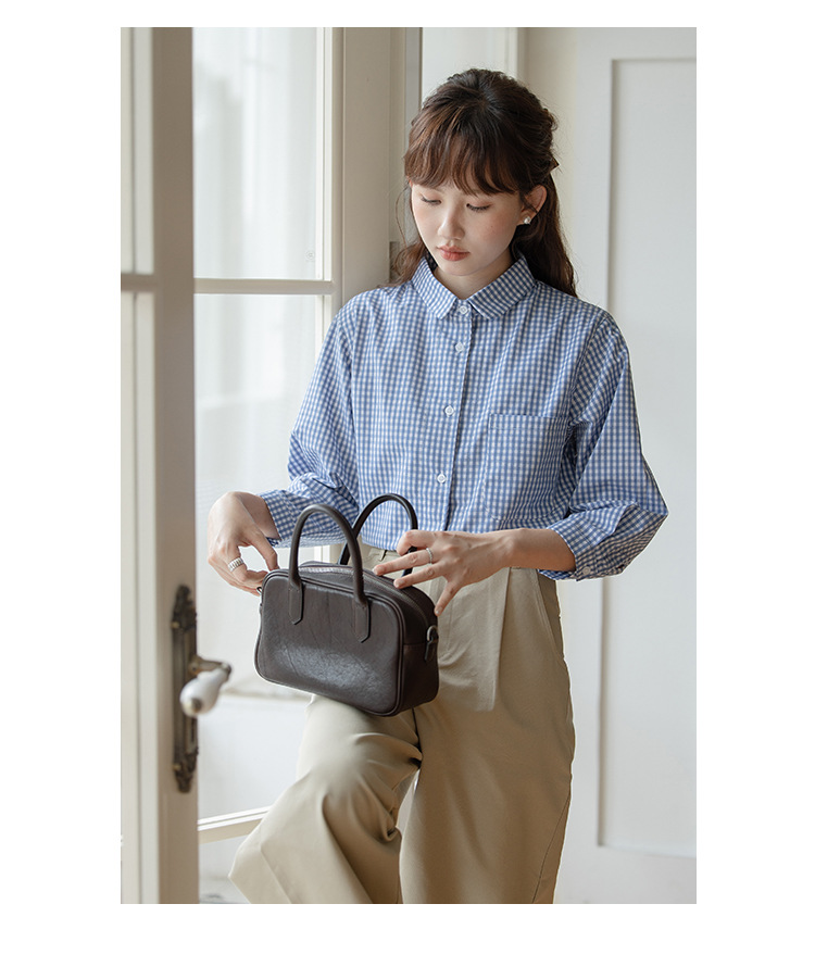 2025 봄 신상 일본풍 예술적인 폴로 칼라 체크 디자인 싱글 버튼 숏 길이 체크 긴팔 셔츠 여성용