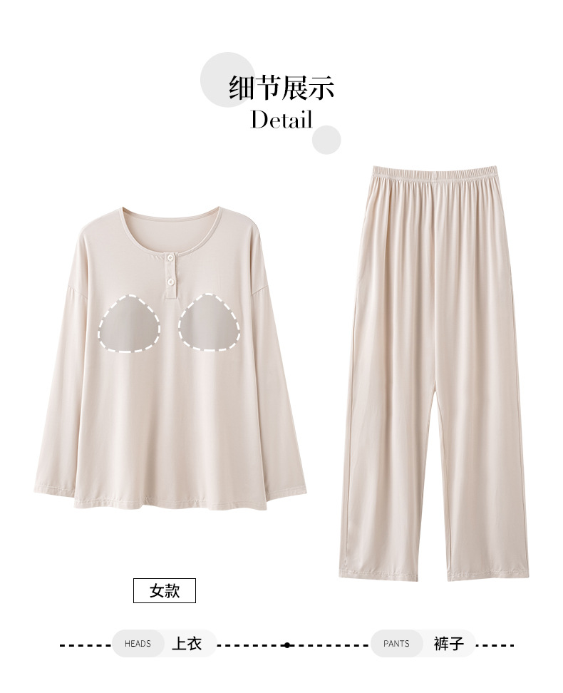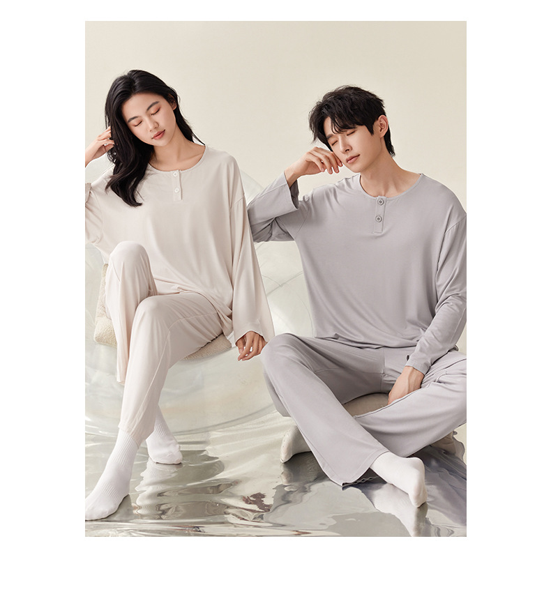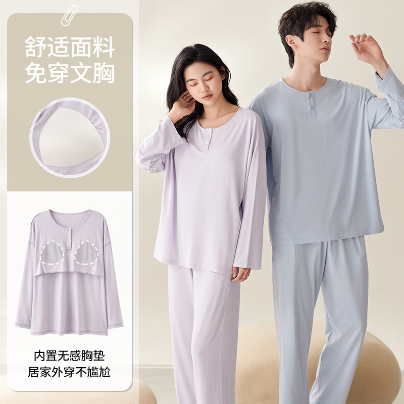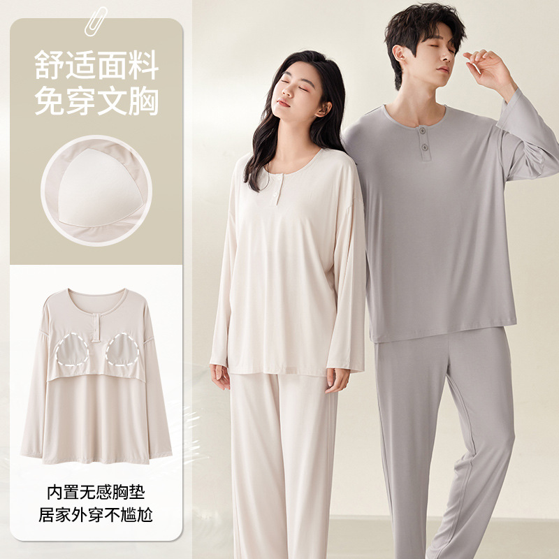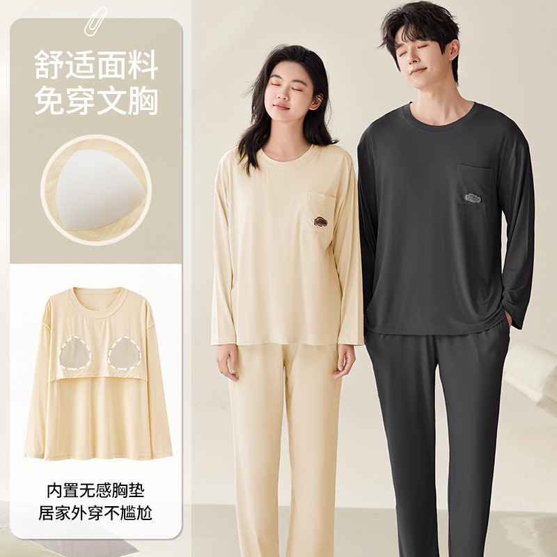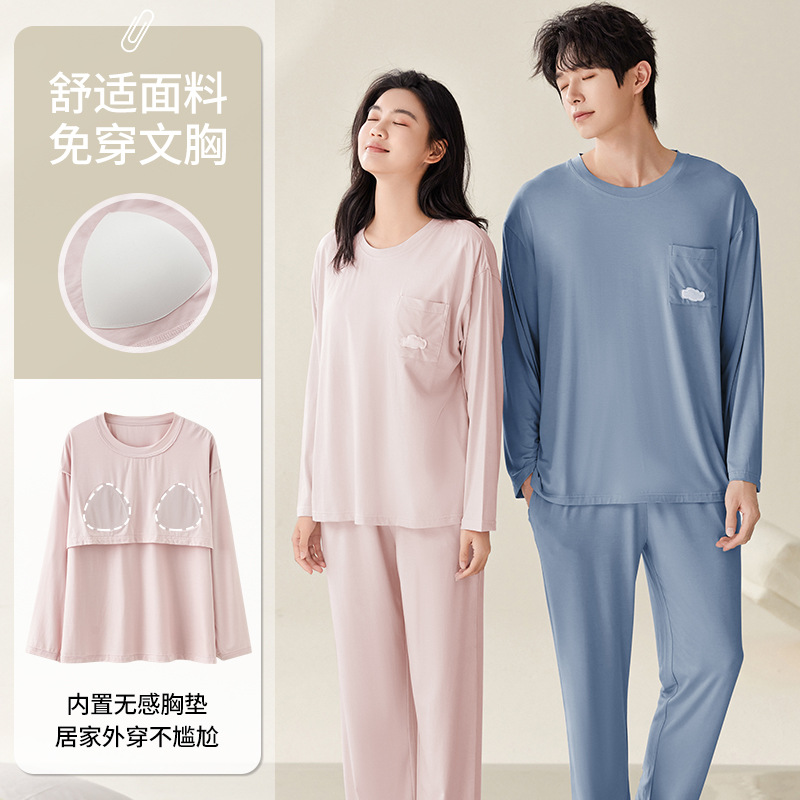 커플 잠옷 여성의 봄과 가을 모달 코튼 벨트 가슴 패드 긴 소매 둥근 목 세트 느슨한 플러스 사이즈 남성 홈 옷스토어 가기