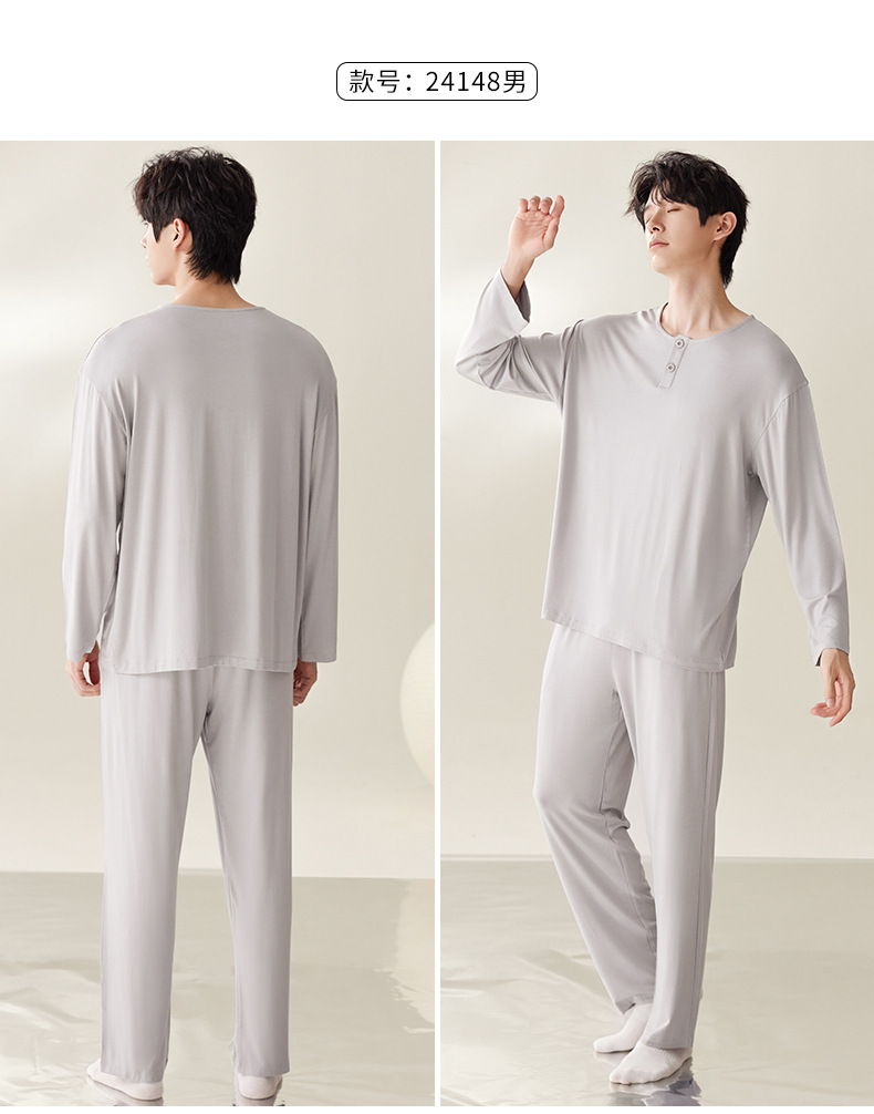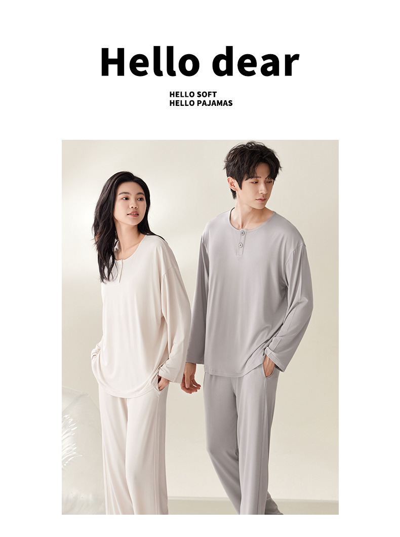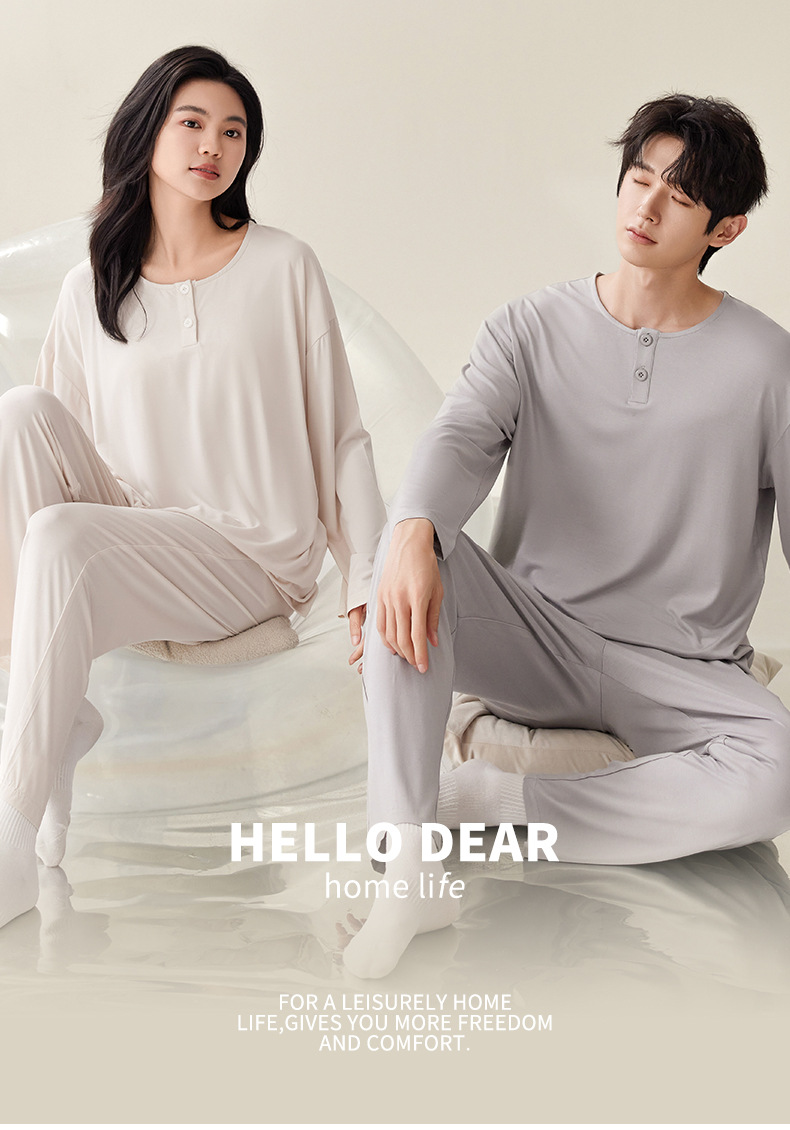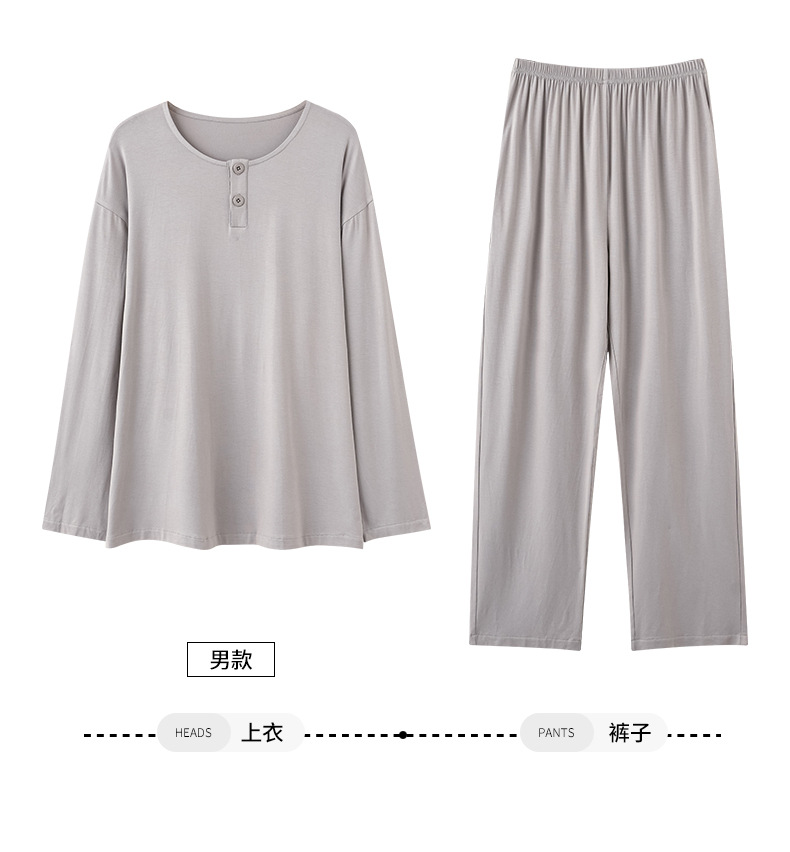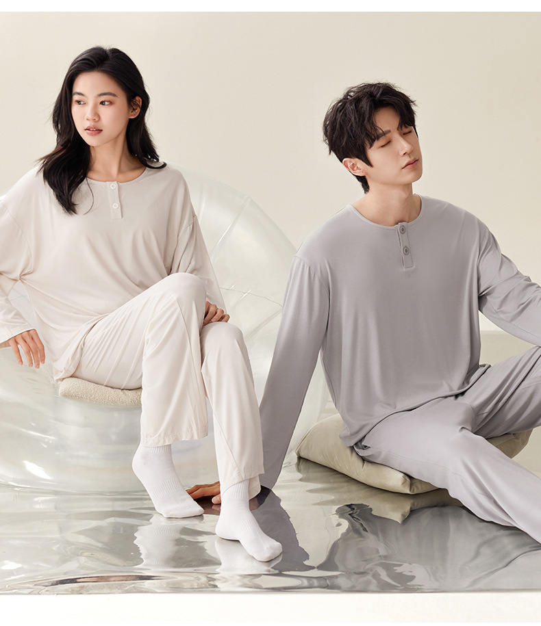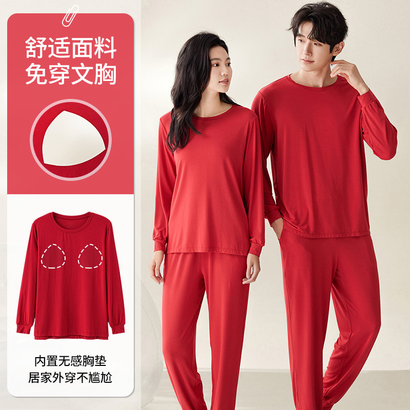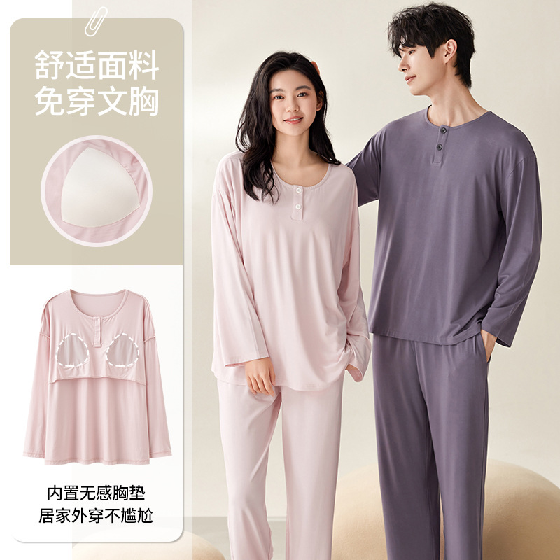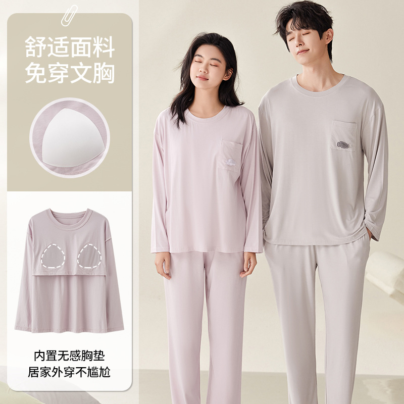 커플 잠옷 여성의 봄과 가을 모달 코튼 벨트 가슴 패드 긴 소매 둥근 목 세트 느슨한 플러스 사이즈 남성 홈 옷