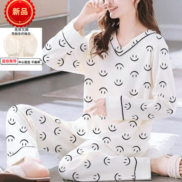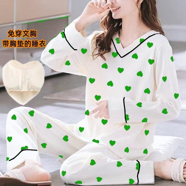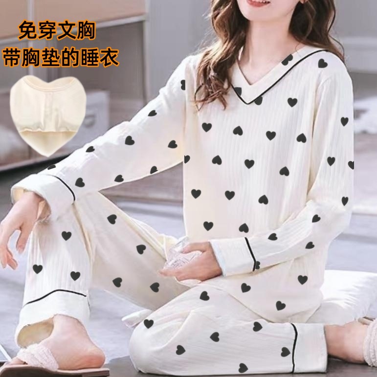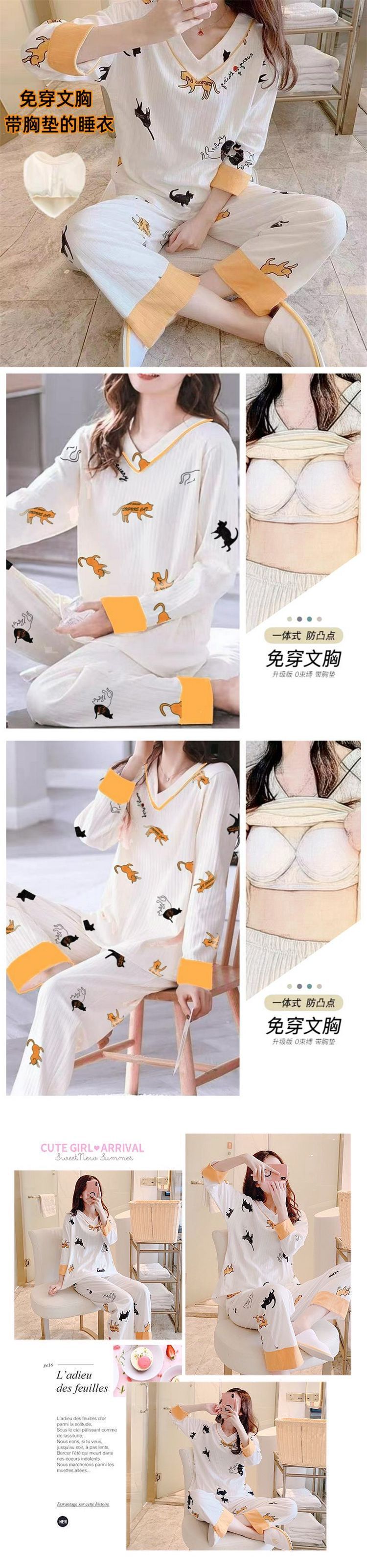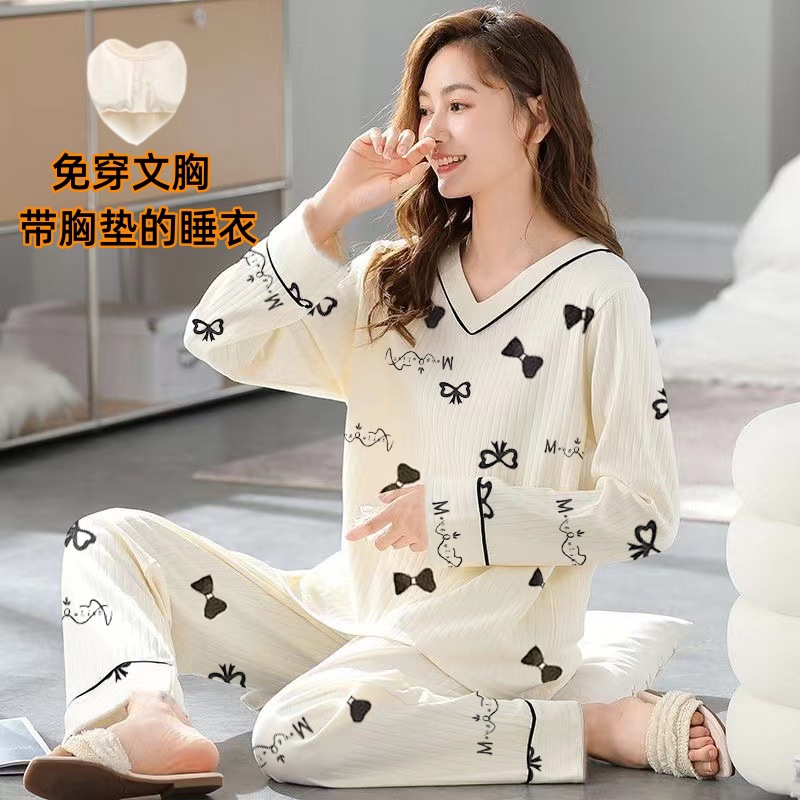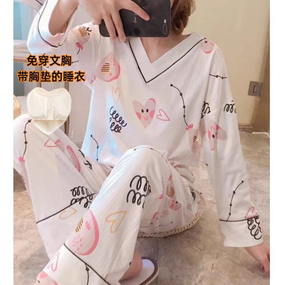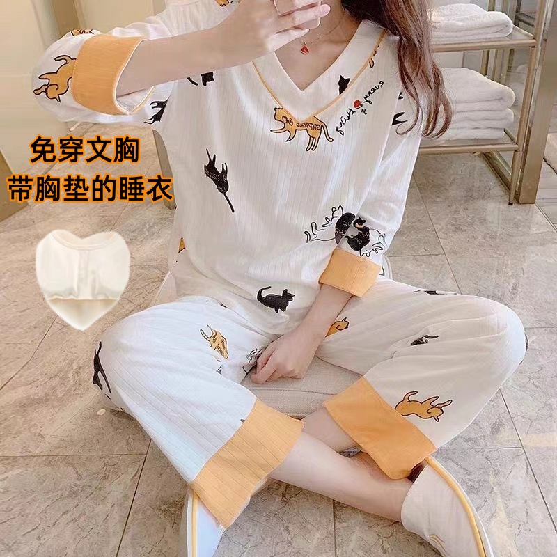 가슴 패드 여성의 봄과 가을 학생 긴 소매 달콤한 귀여운 소녀 플러스 사이즈 홈 옷 세트 입고 잠옷스토어 가기