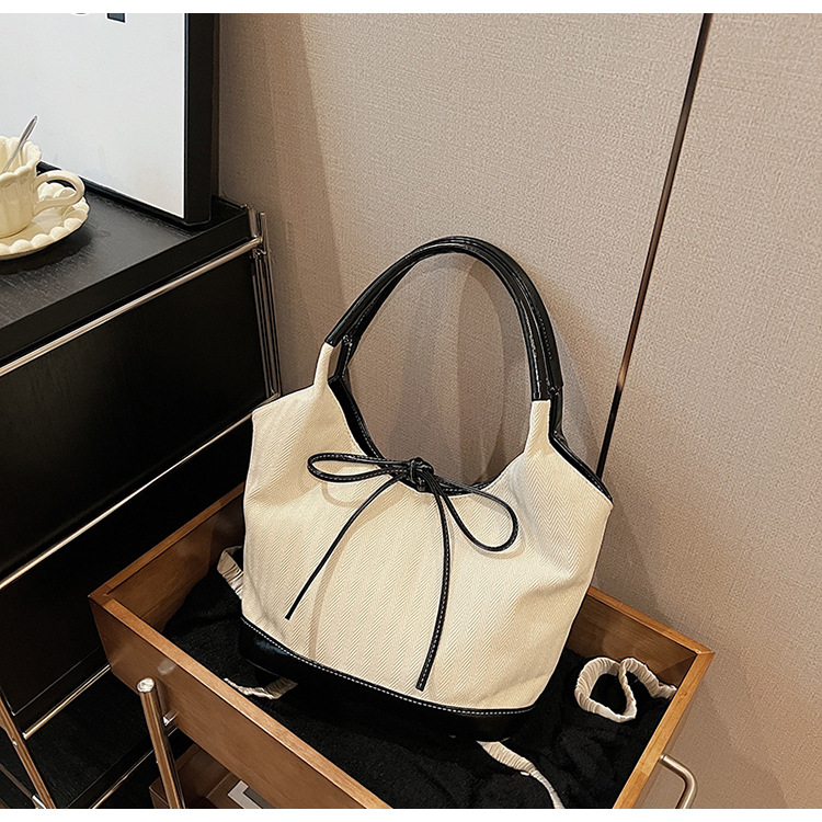 캔버스 가방 여성 가방 2024 새로운 고급 질감 폴로 도트 보우 어깨 가방 휴식 스타일 바쁜 버킷 가방스토어 가기