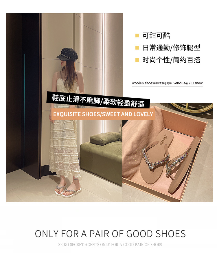 2025년 여름 신상 휴양지 스타일 라인스톤 펜던트 플랫 슬리퍼 여성용 해변 샌들스토어 가기