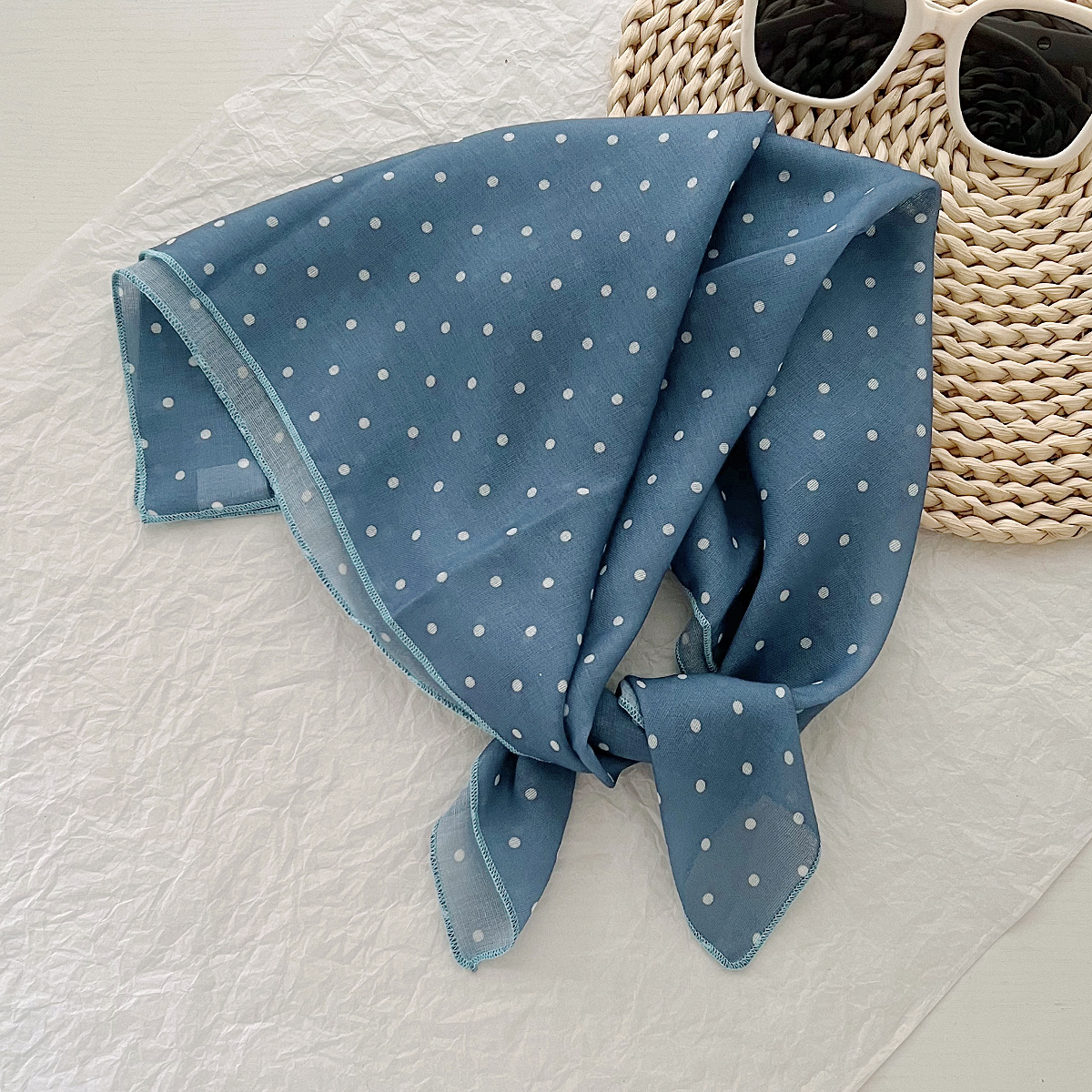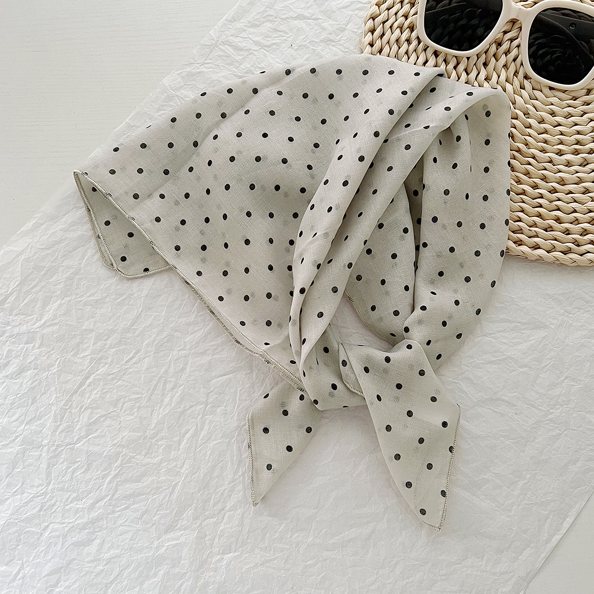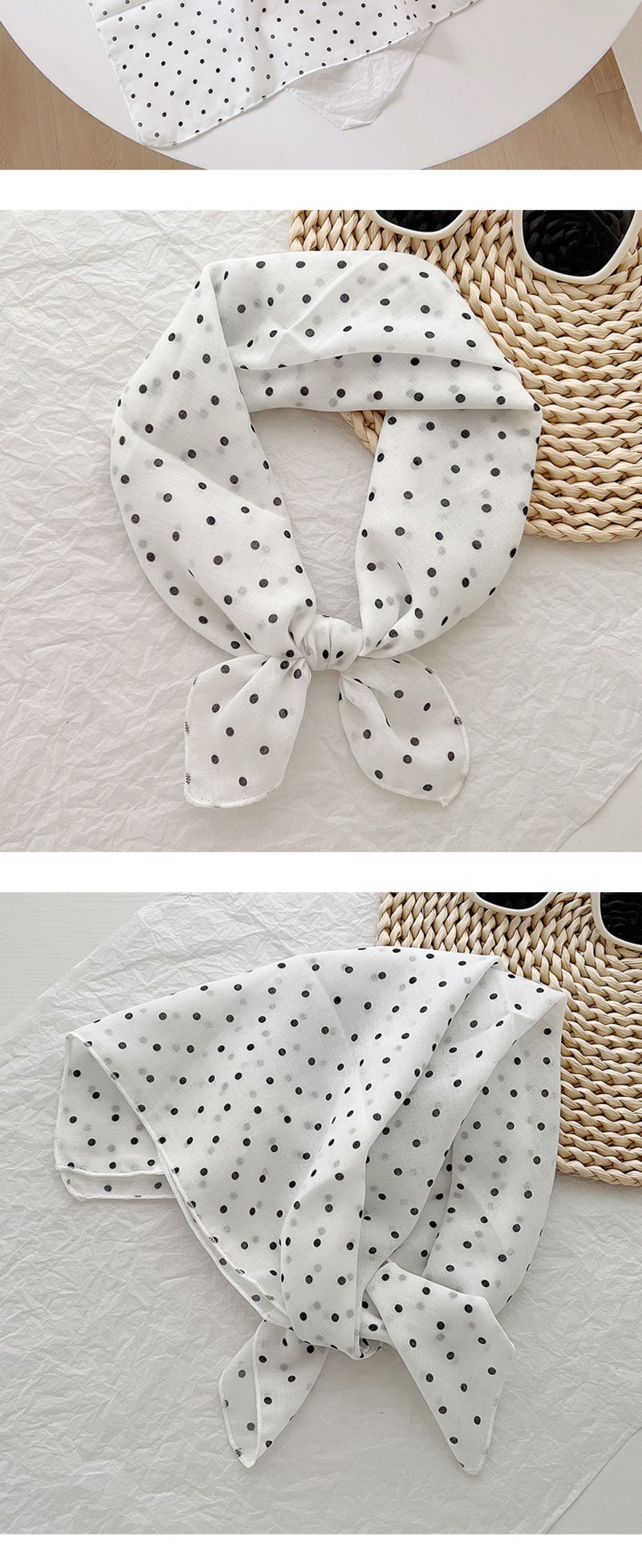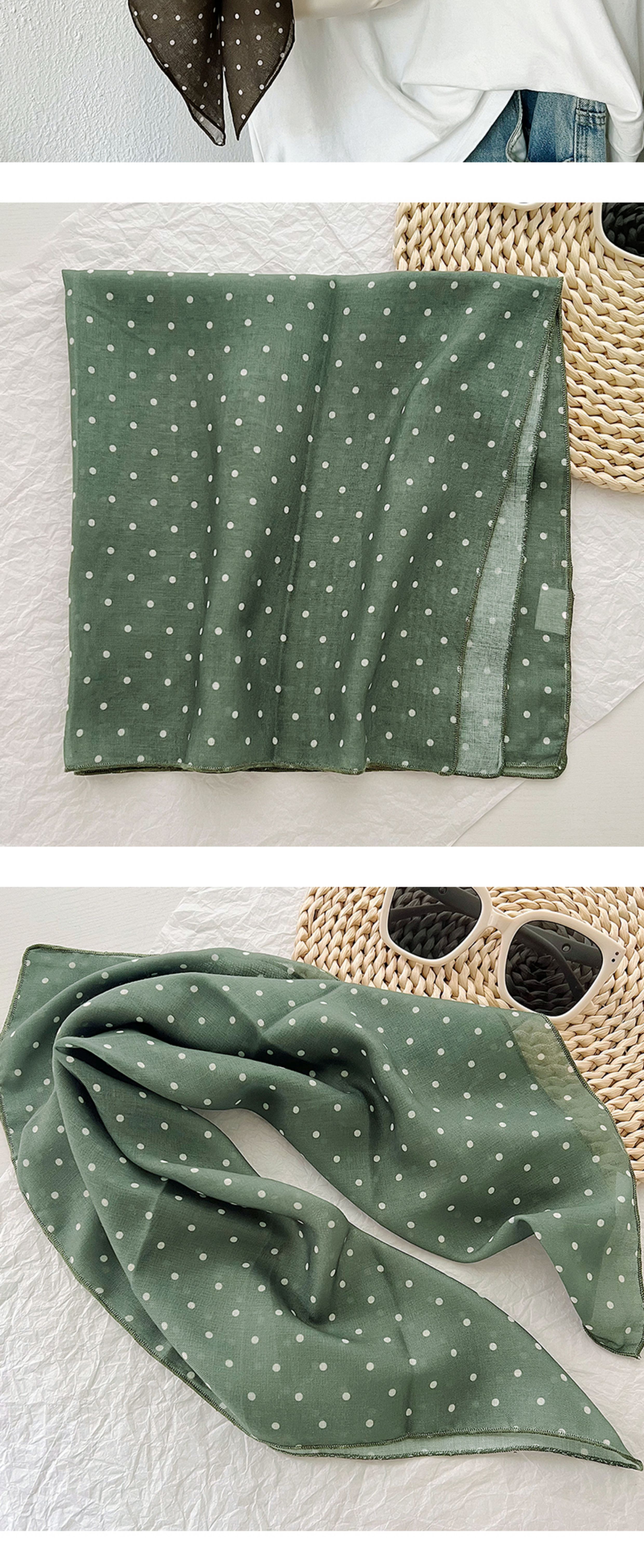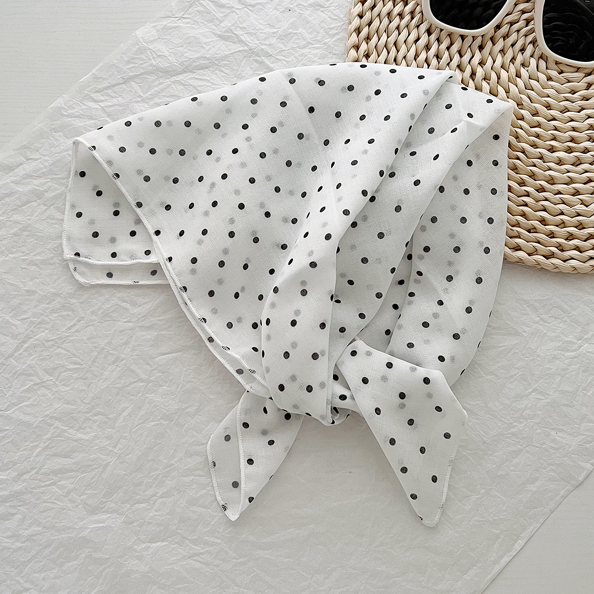 2024 한국식 새 도착 작은 웨이브 도트 코튼 및 리넨 스퀘어 스카프 여성 유행 올 매치 실크 스카프 다기능 타이 백 타이 헤어 밴드