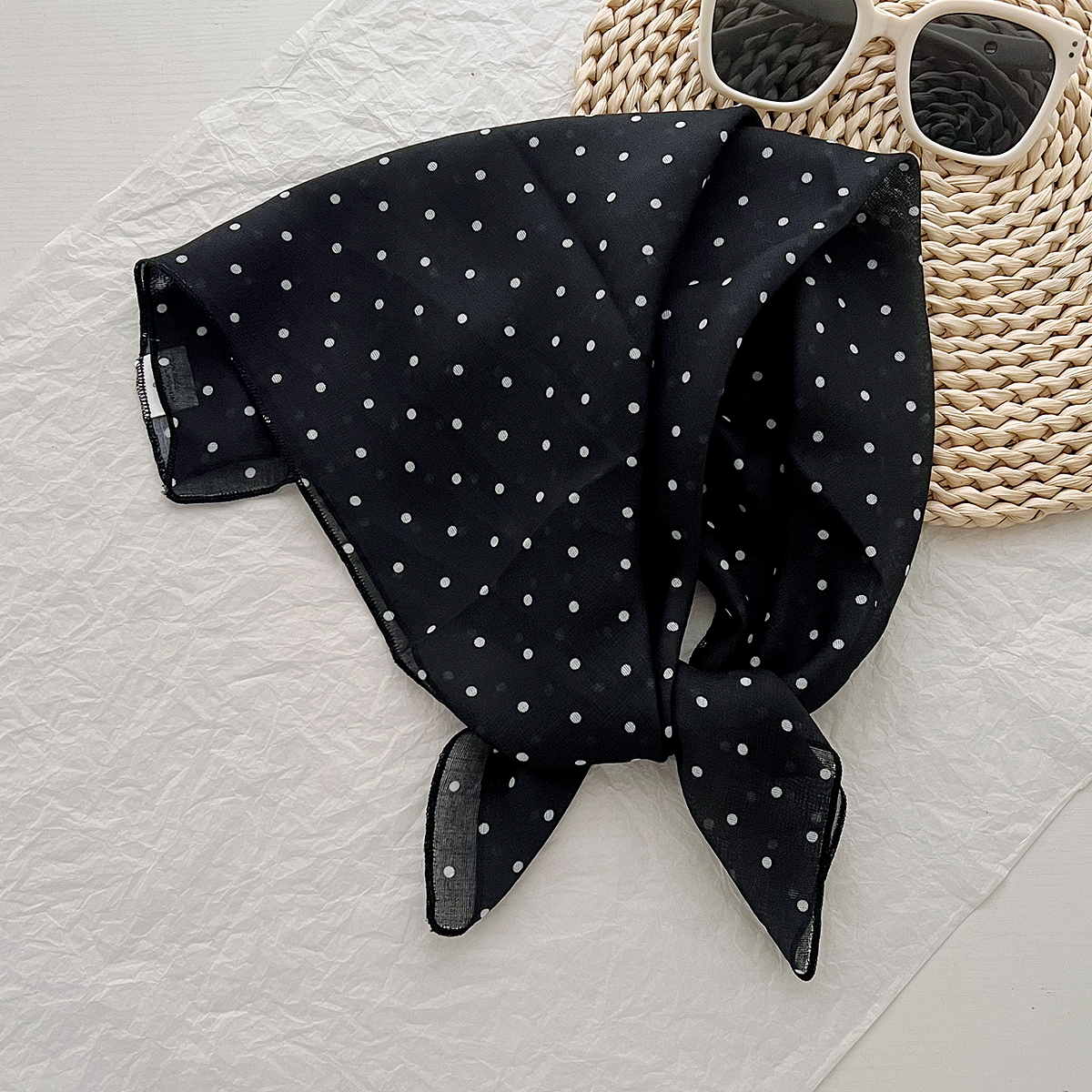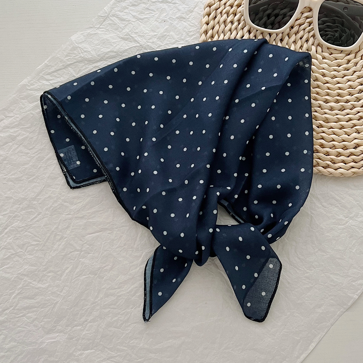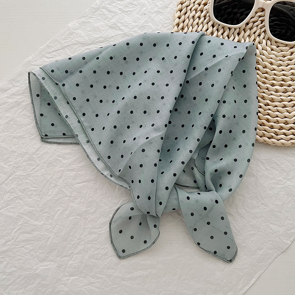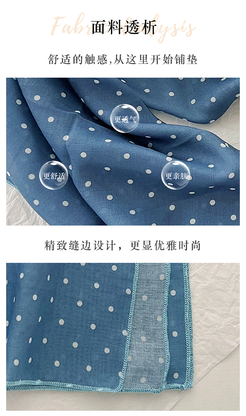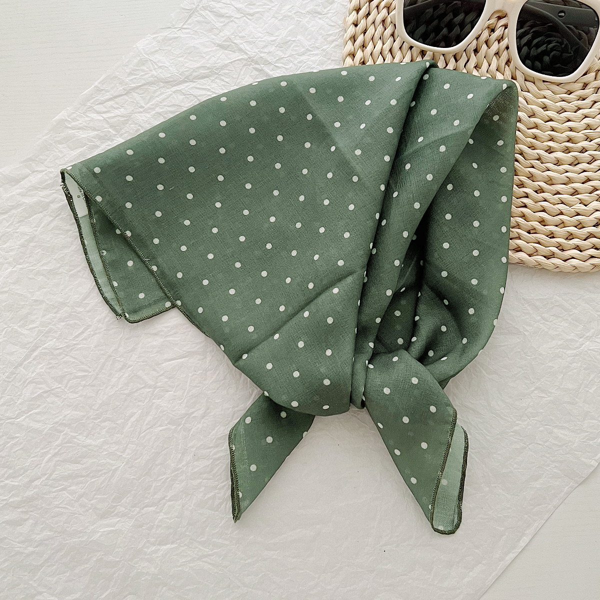 2024 한국식 새 도착 작은 웨이브 도트 코튼 및 리넨 스퀘어 스카프 여성 유행 올 매치 실크 스카프 다기능 타이 백 타이 헤어 밴드