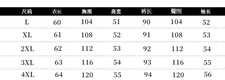 码数建议:L建议80-100斤,XL建议100-115斤,2XL建议115-135斤,3XL建议135-150斤,4XL建议150-170斤