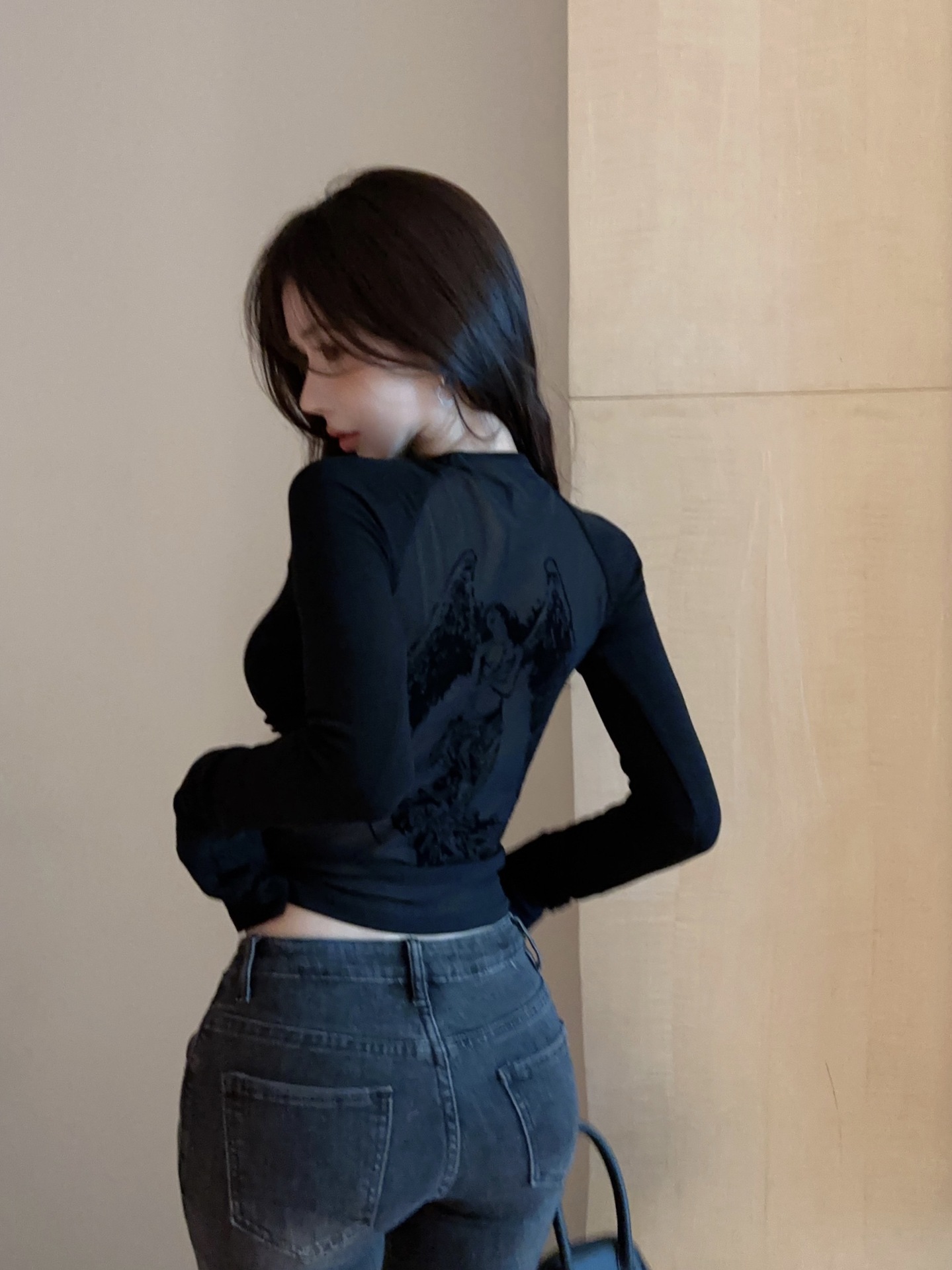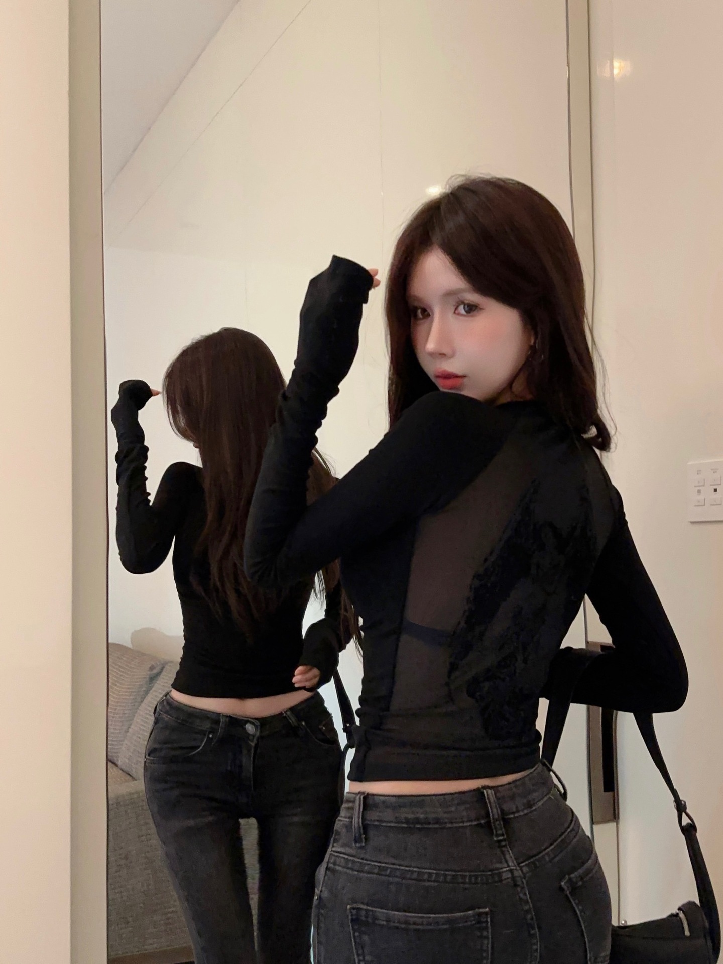 퓨어 스파이스 걸스 섹시 백리스 탑 여성의 가을과 겨울 메쉬 관점 레이스베이스 셔츠 독특한 세련된 작은 셔츠