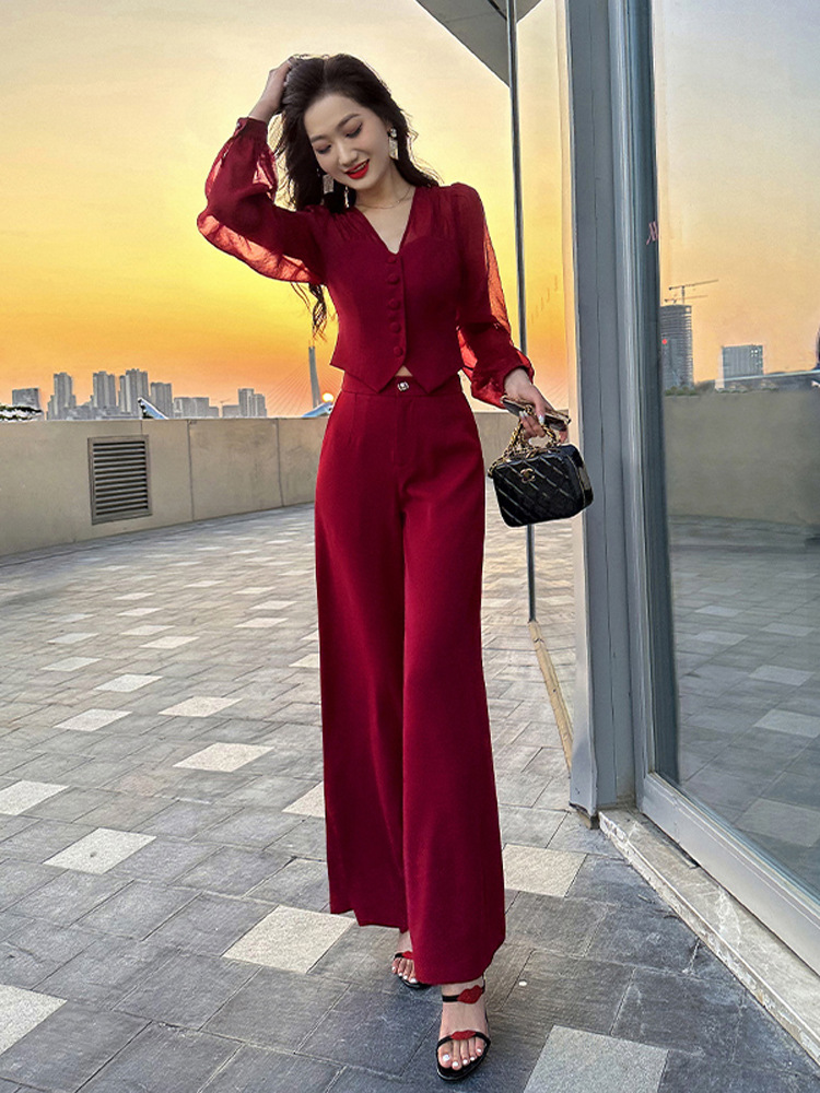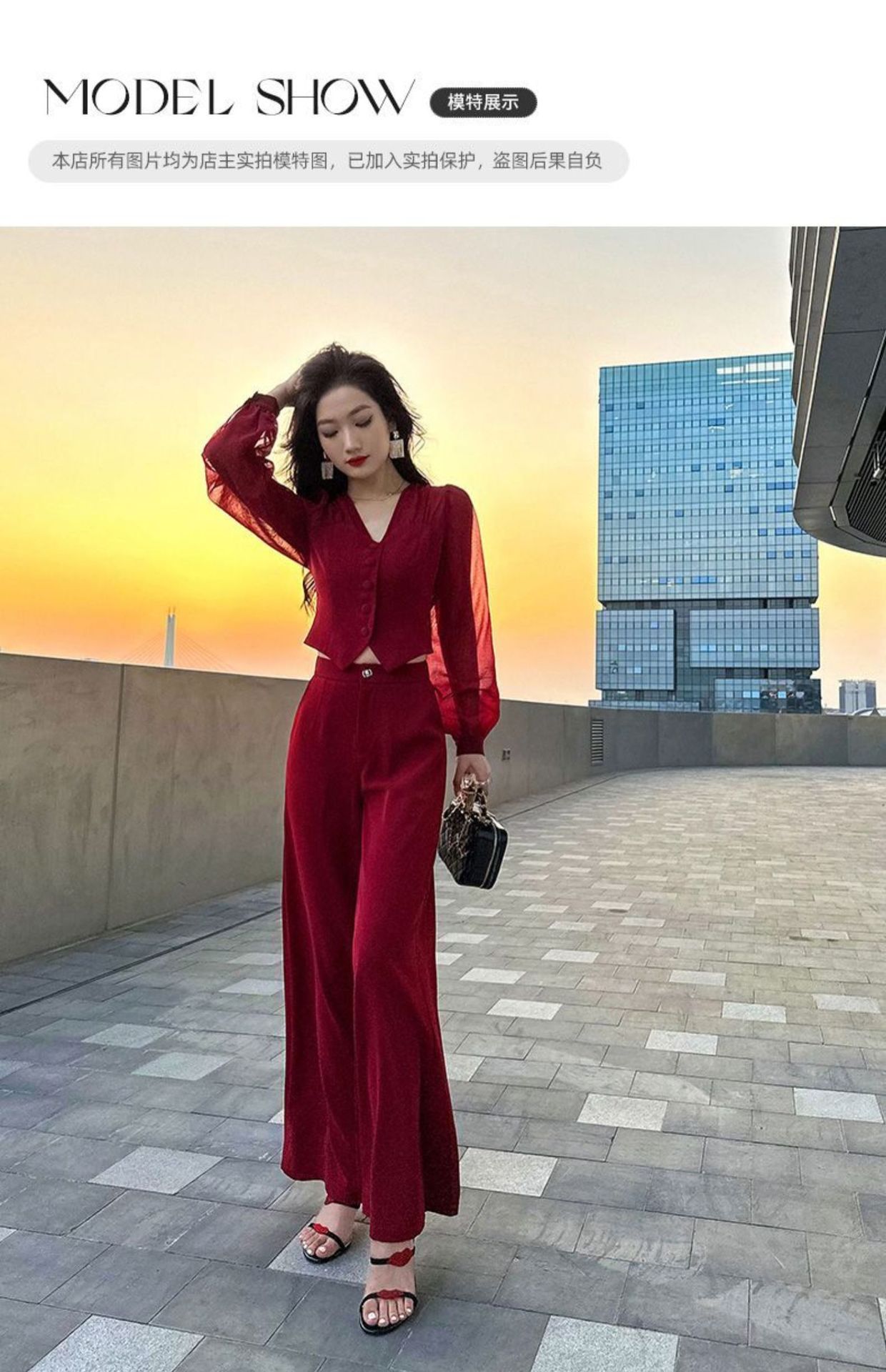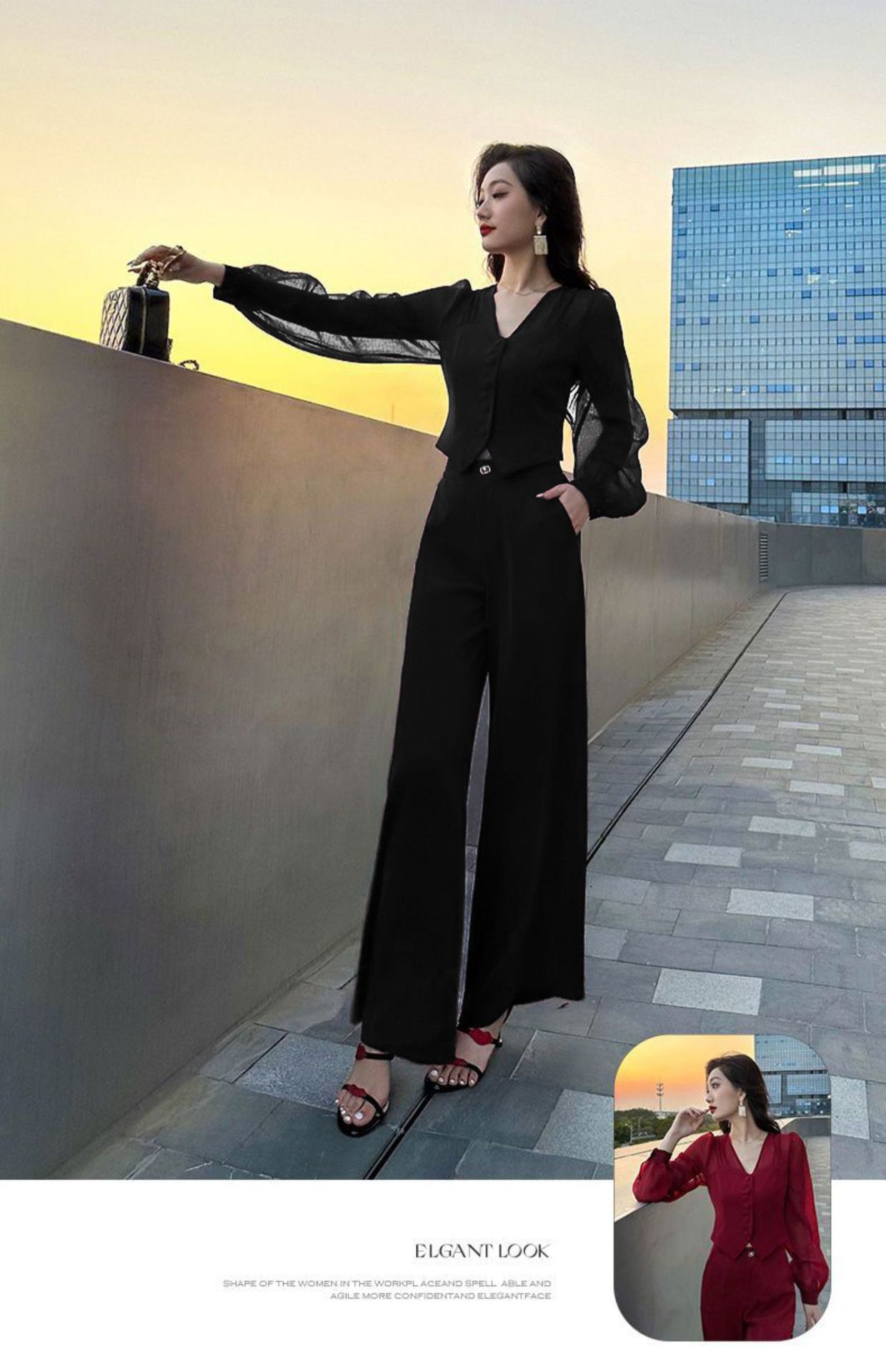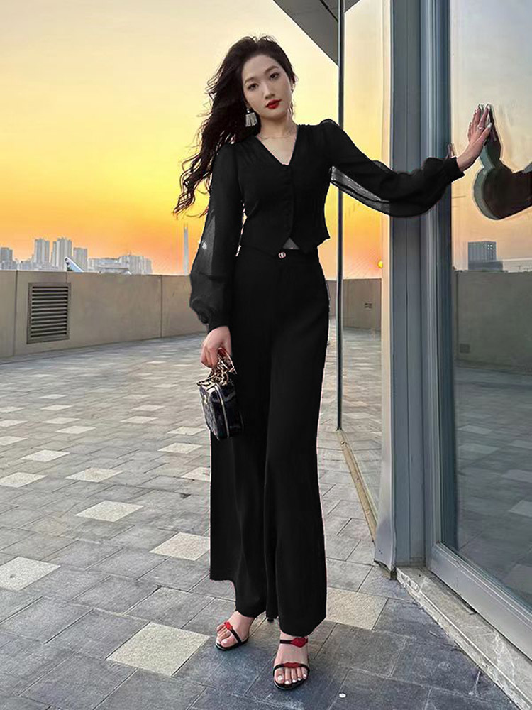 패션 세트 여성용 셔츠 탑 와이드 레그 바지 투피스 세트 2024 가을 신입 세트