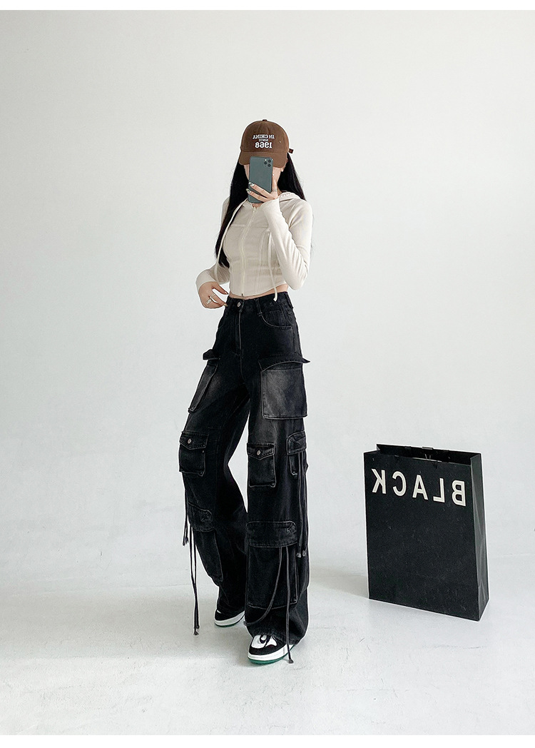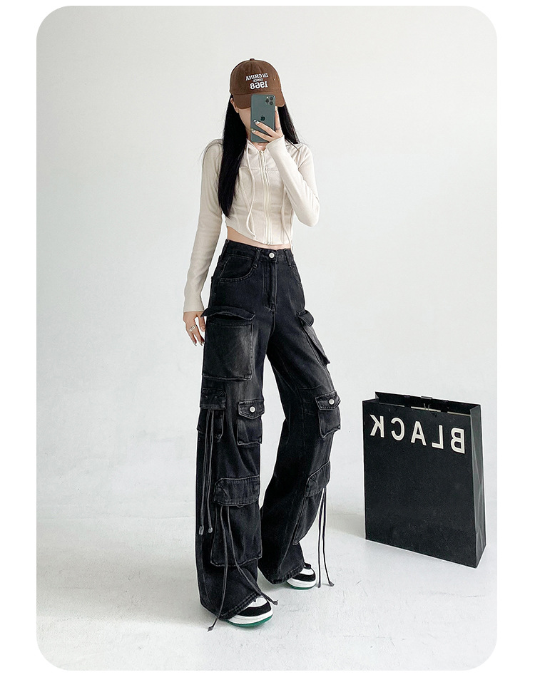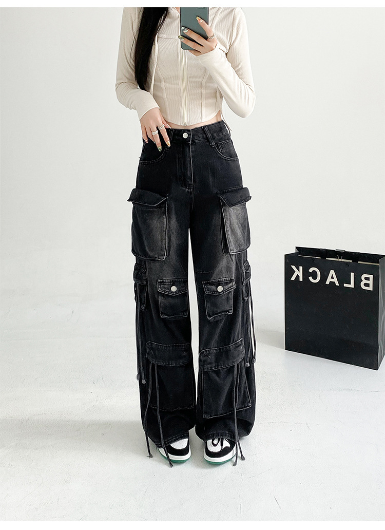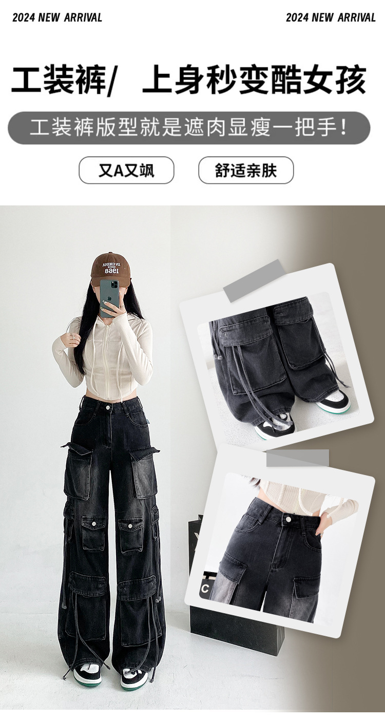 잘 생긴 멀티 포켓 캐주얼 와이드 레그 청바지 여성의 가을 2024 새로운 높은 허리 느슨한 슬리밍 스트레이트 오버볼스토어 가기