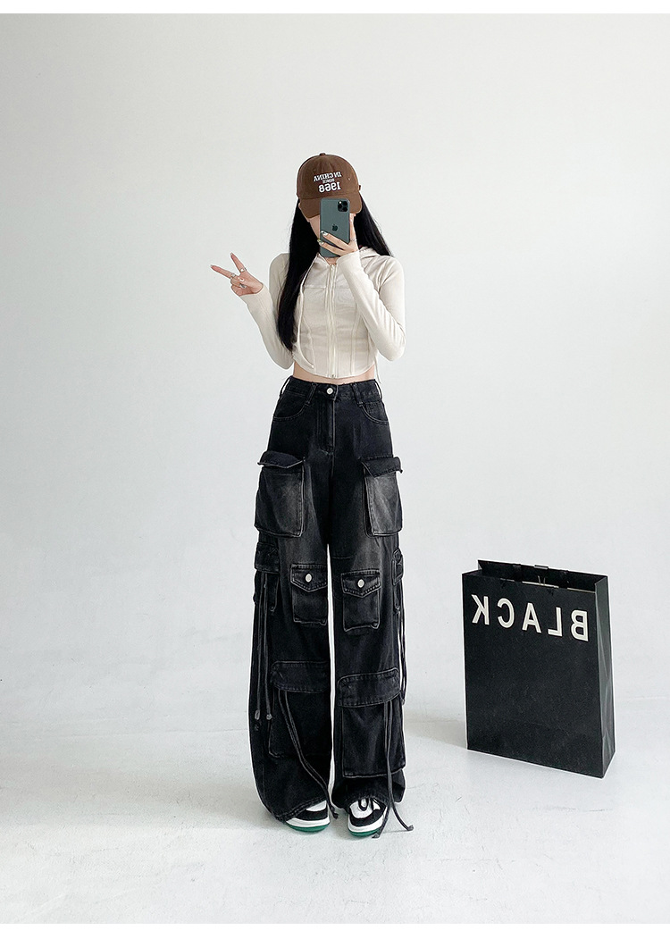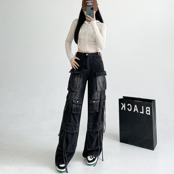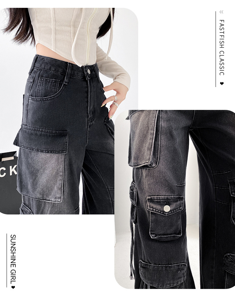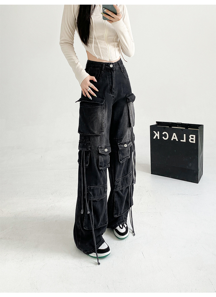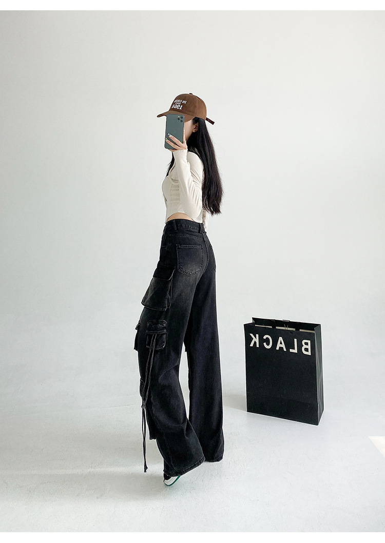 잘 생긴 멀티 포켓 캐주얼 와이드 레그 청바지 여성의 가을 2024 새로운 높은 허리 느슨한 슬리밍 스트레이트 오버볼스토어 가기