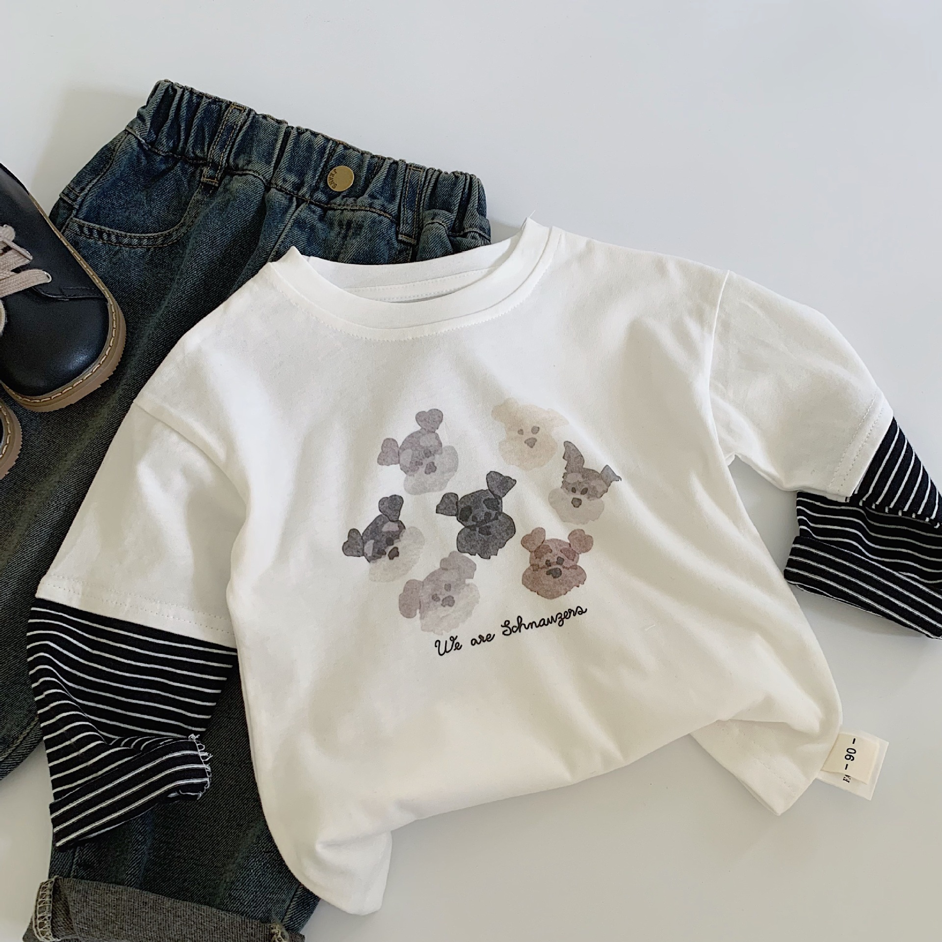 Mai Bao 어린이 티셔츠 2025 봄 새로운 스타일 소년과 소녀 라운드 넥 만화 강아지 가짜 투피스 바닥 탑 드롭 배송