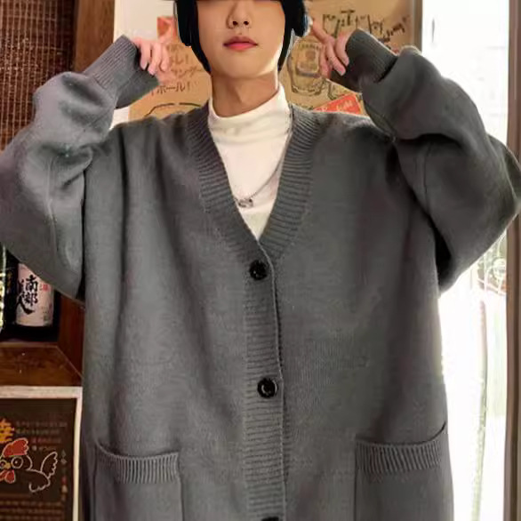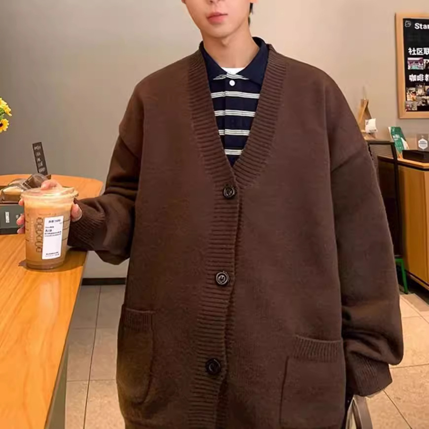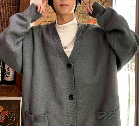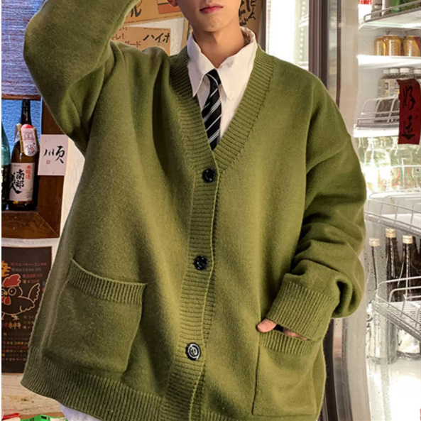 V-Neck 카디건 니트 스웨터 남자의 예술적 가을과 겨울 홍콩 스타일 게으른 스타일 니트 스웨터 유행 루즈 아우터 스웨터