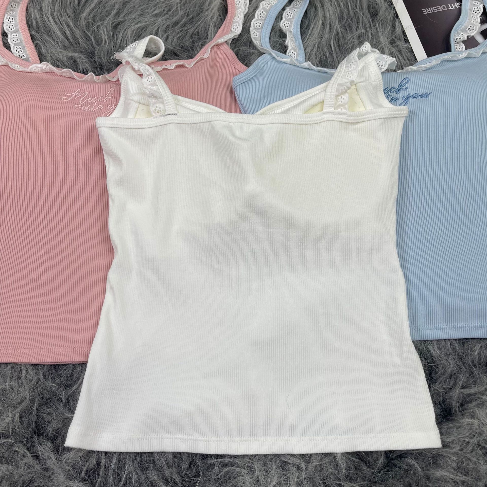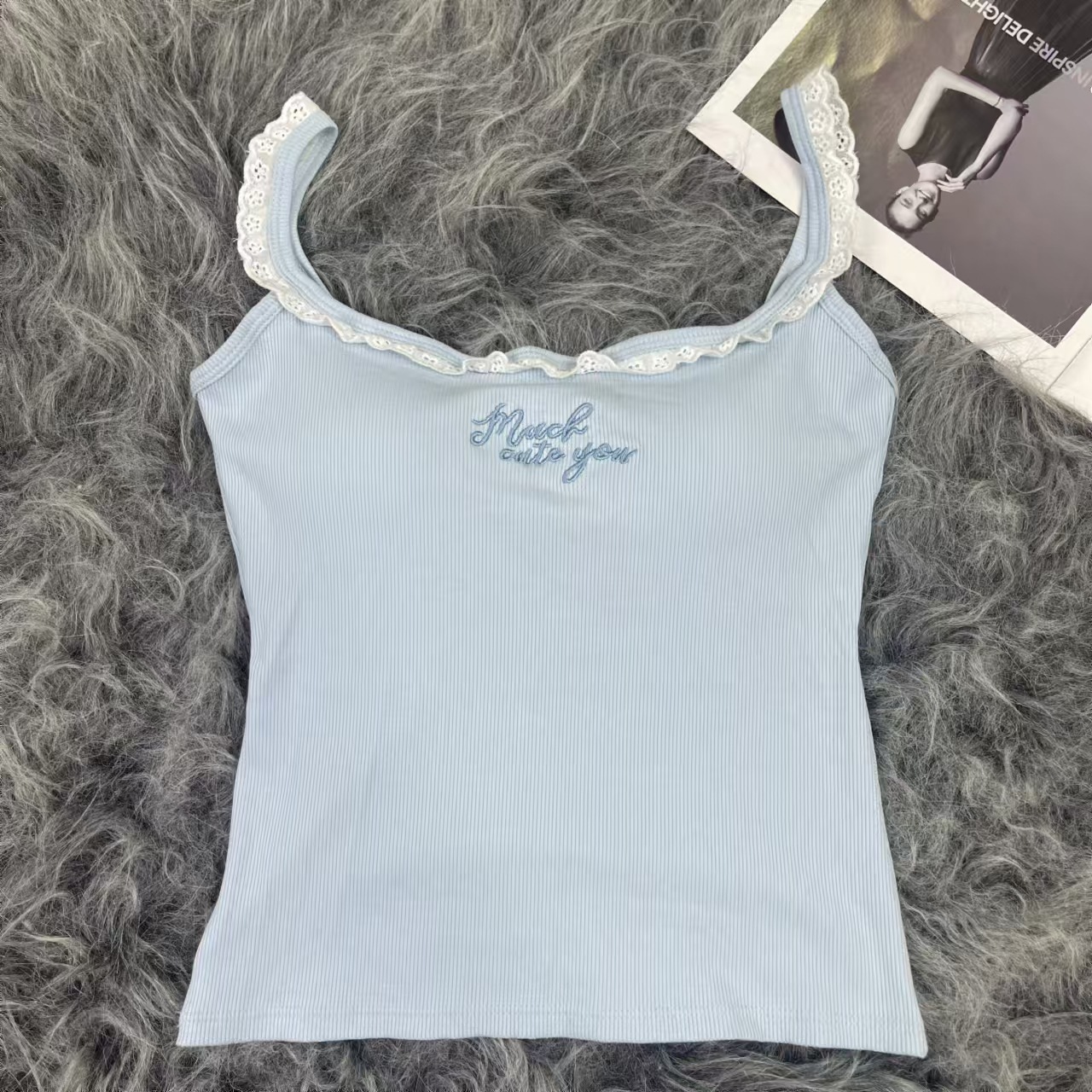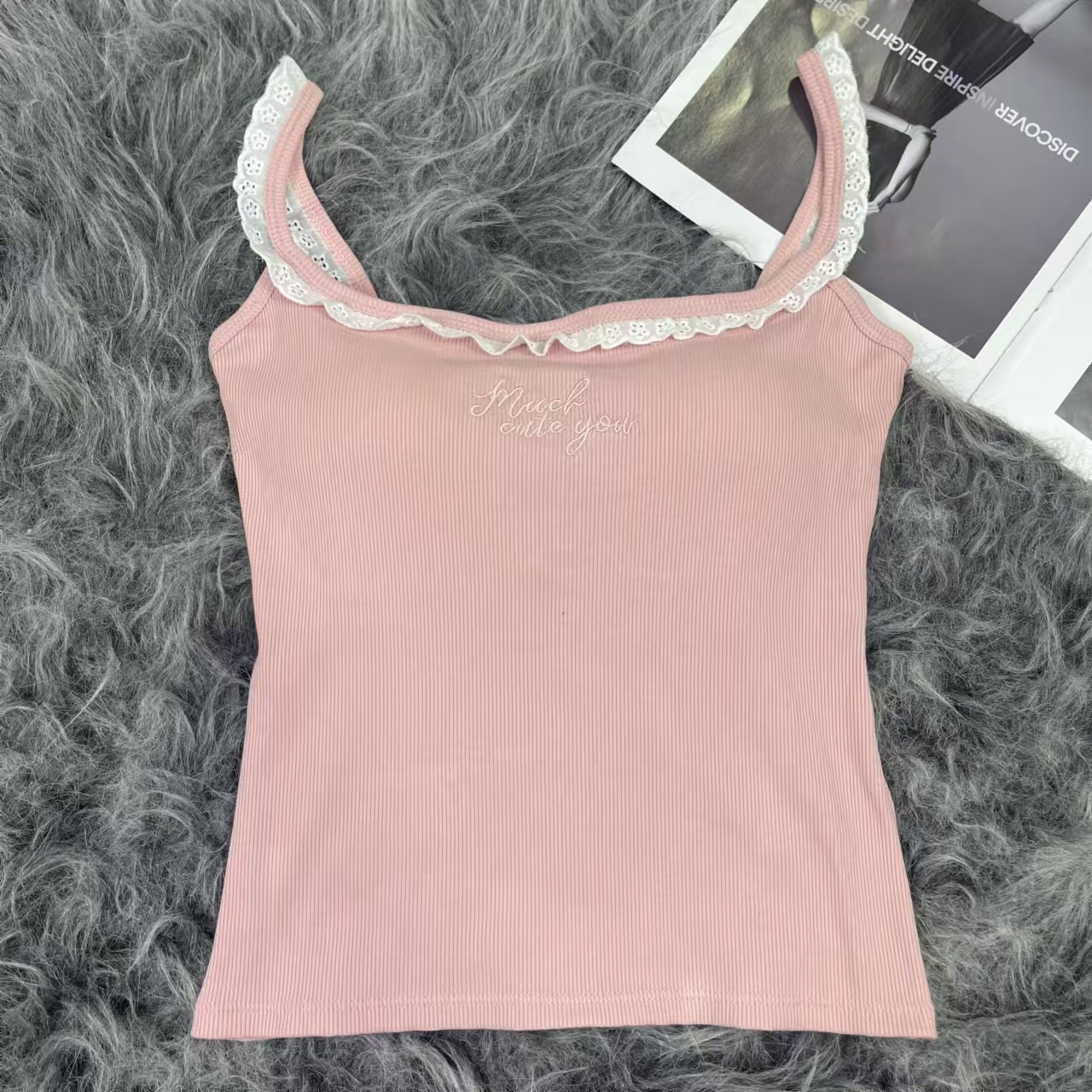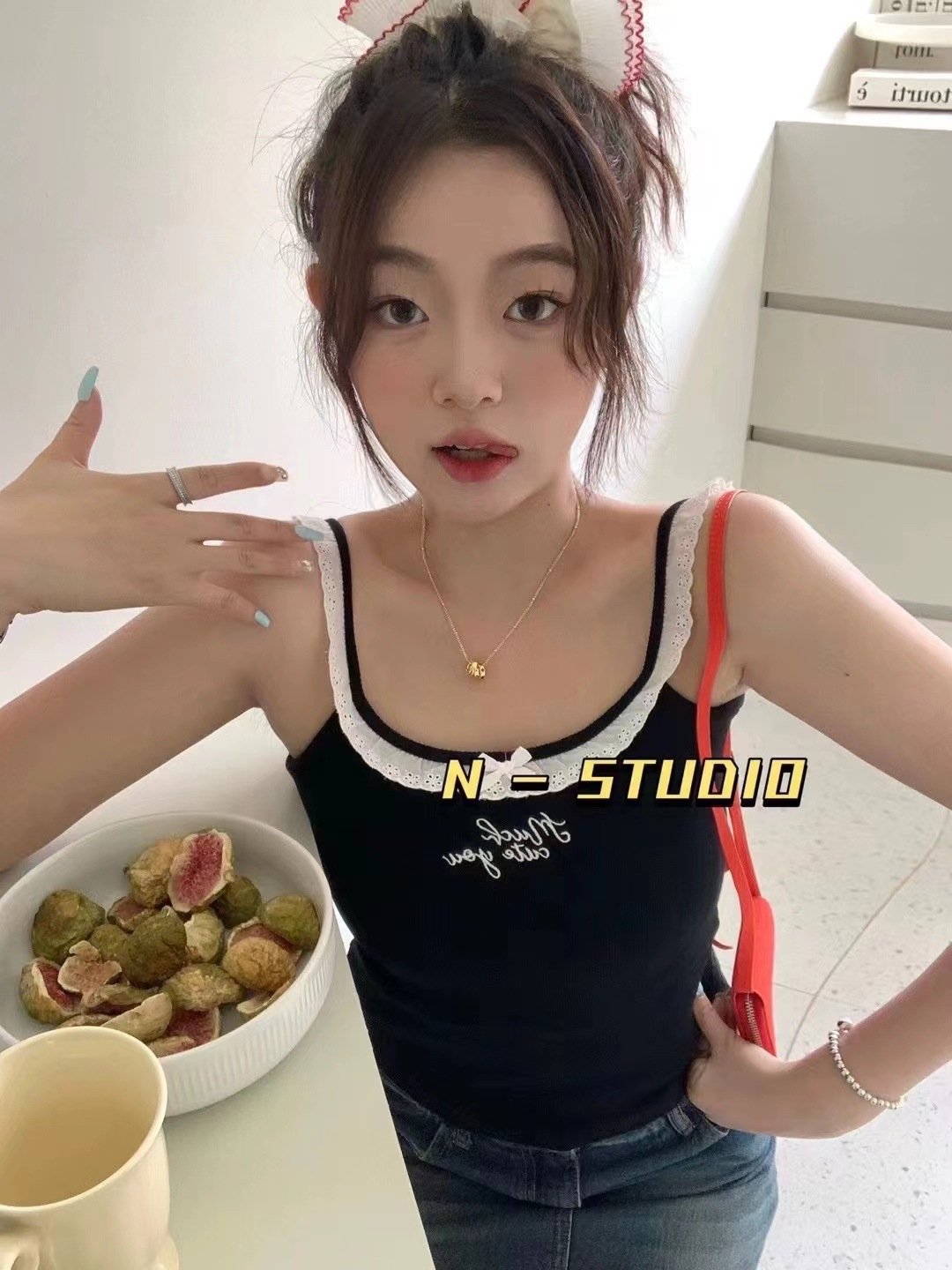 6621 여름 새로운 순수 멜빵 조끼 레이스 U 칼라 디자인 미적 백 원피스 컵은 탑을 입을 수 있습니다스토어 가기