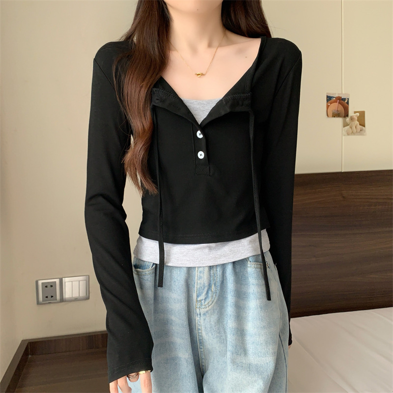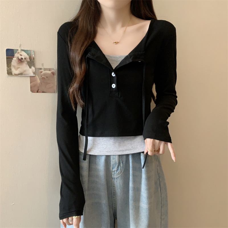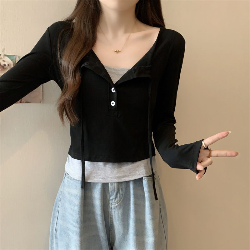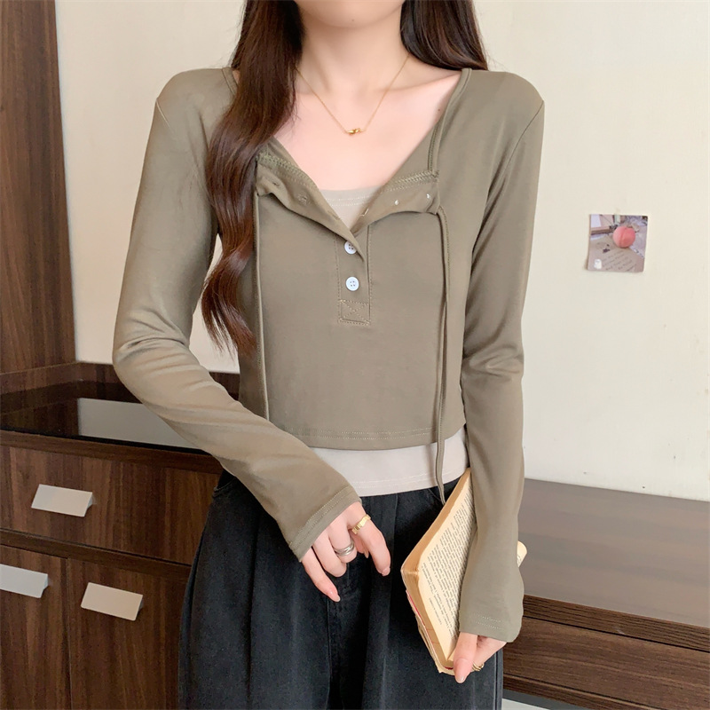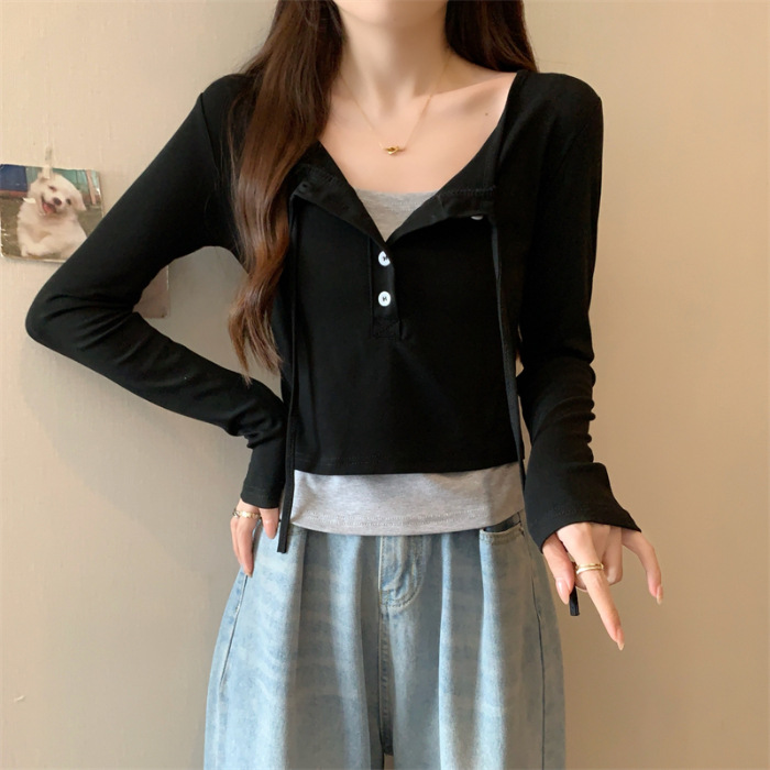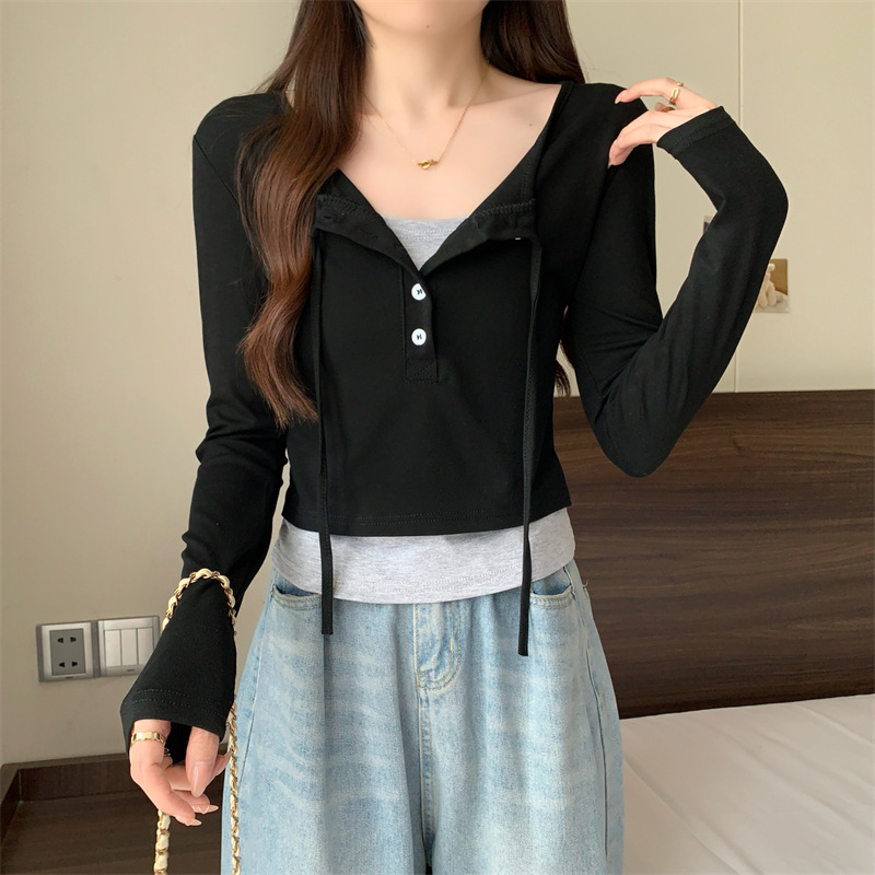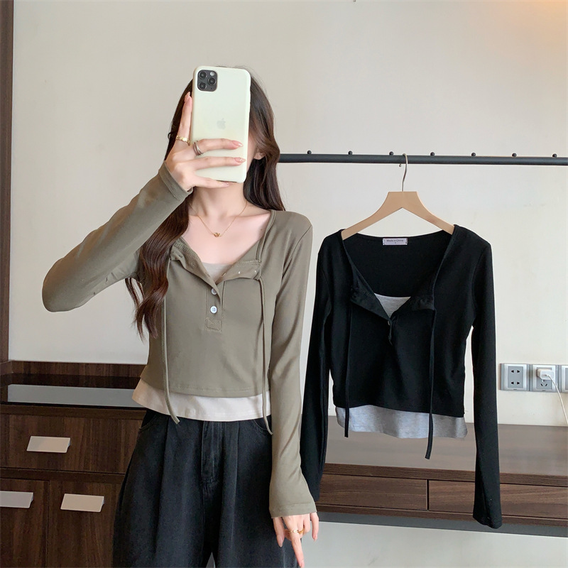 틈새 디자인 센스 패션 스티칭 가짜 투피스 긴팔 티셔츠 여성 가을 새로운 슬림 핏 슬리밍 쇼트 탑인
