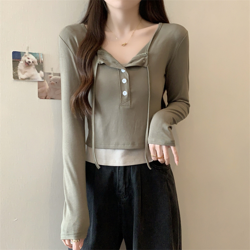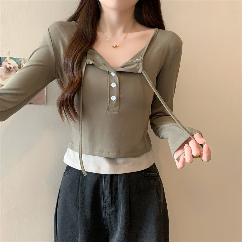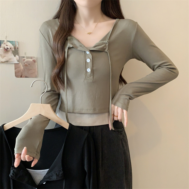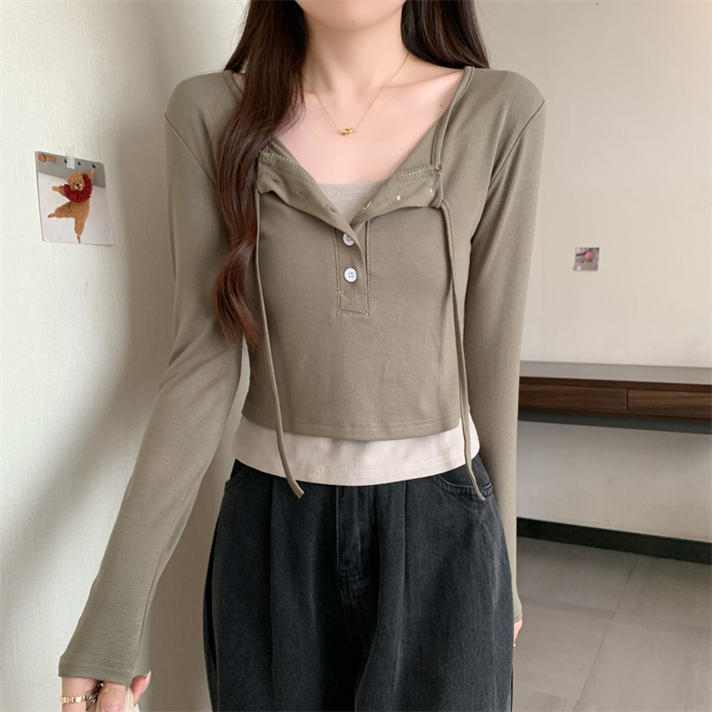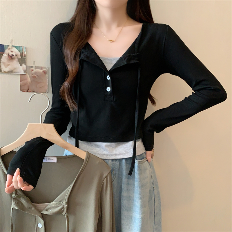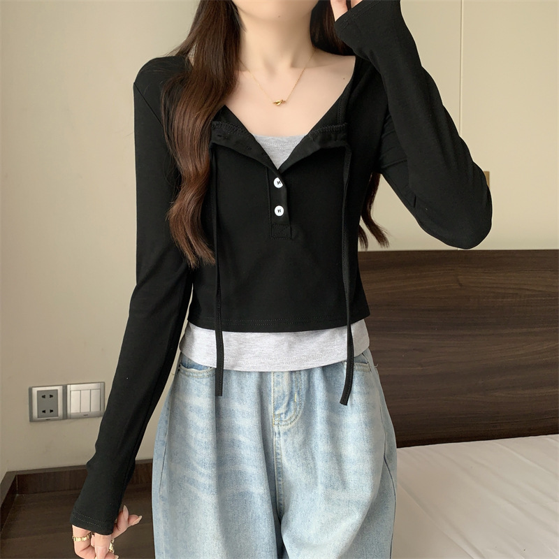 틈새 디자인 센스 패션 스티칭 가짜 투피스 긴팔 티셔츠 여성 가을 새로운 슬림 핏 슬리밍 쇼트 탑인