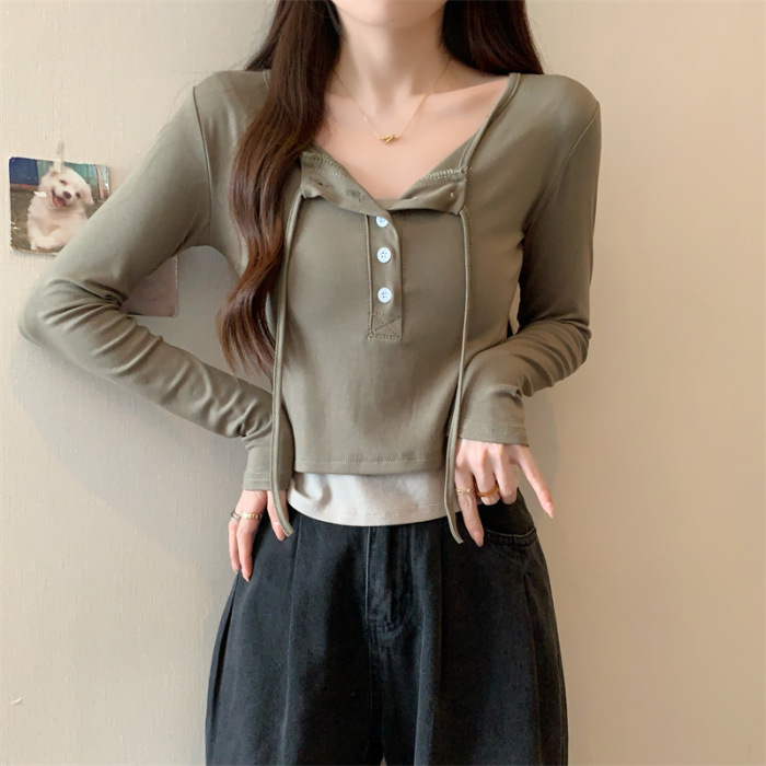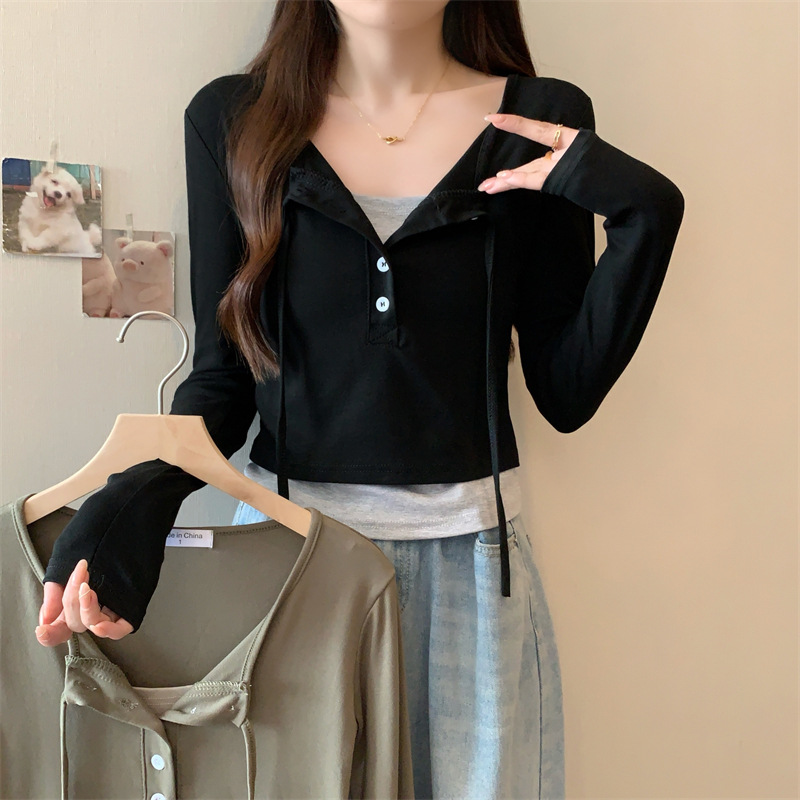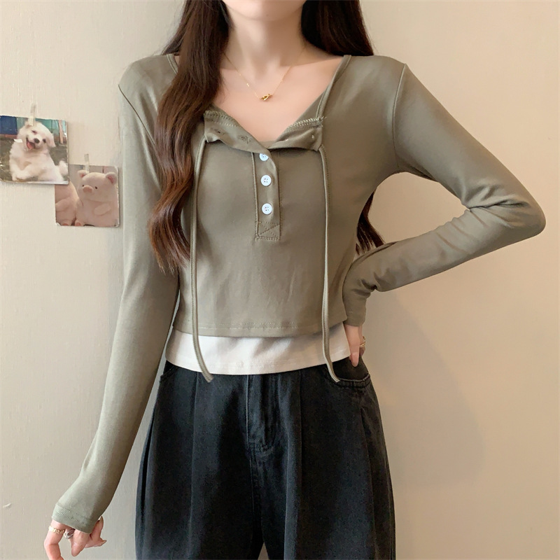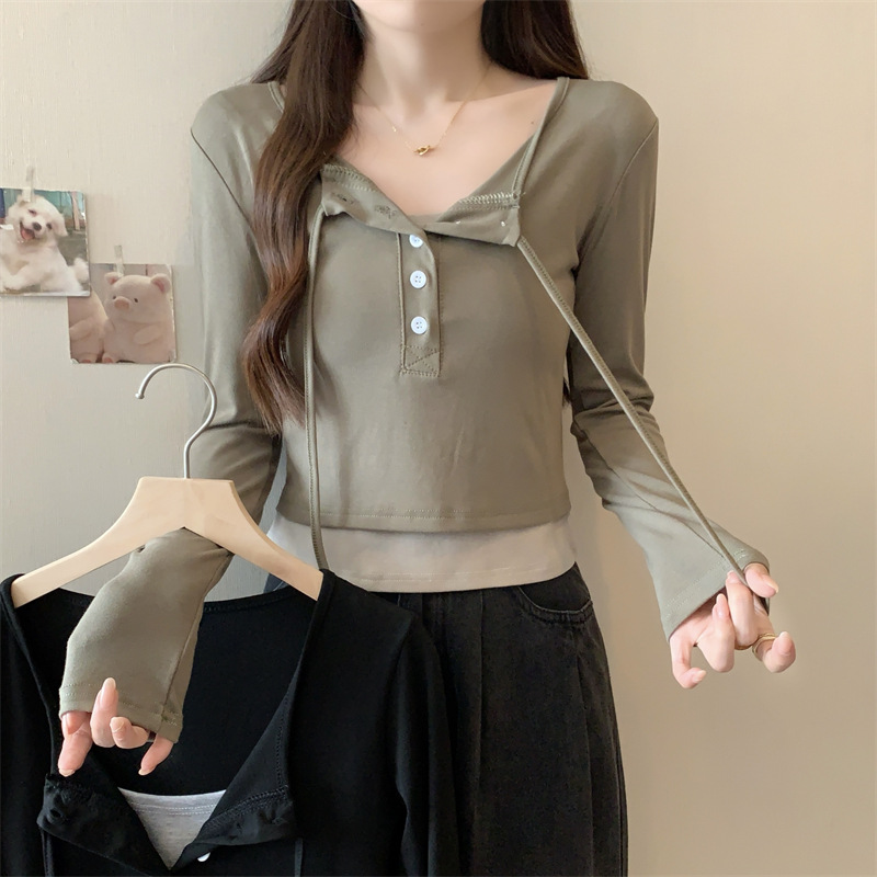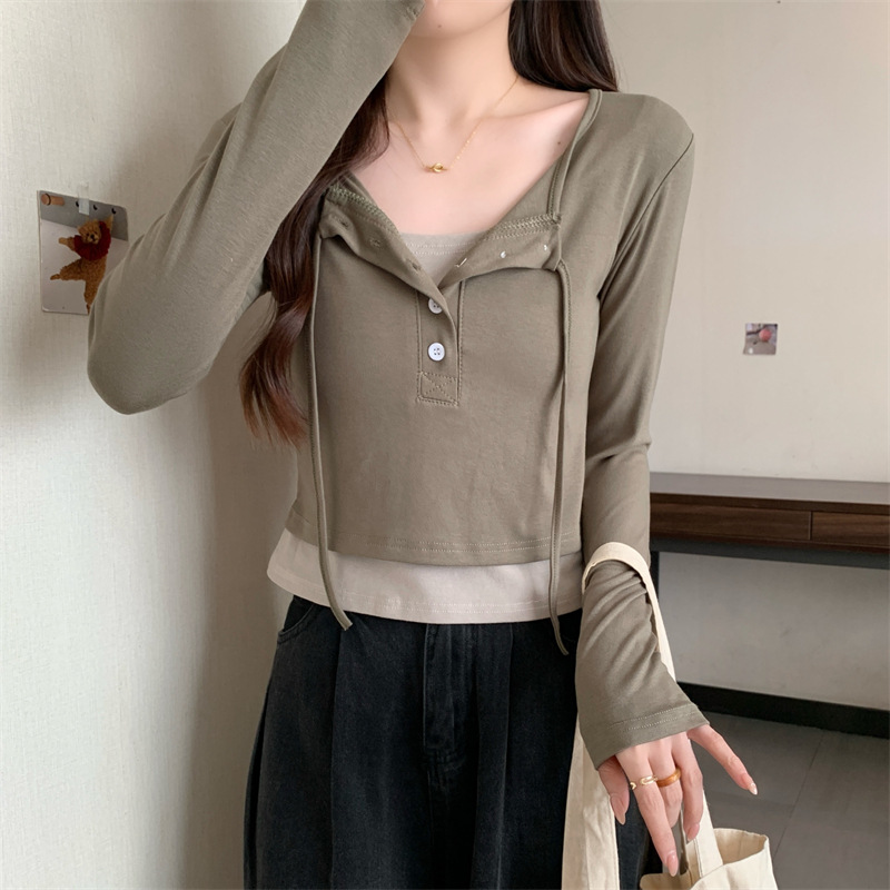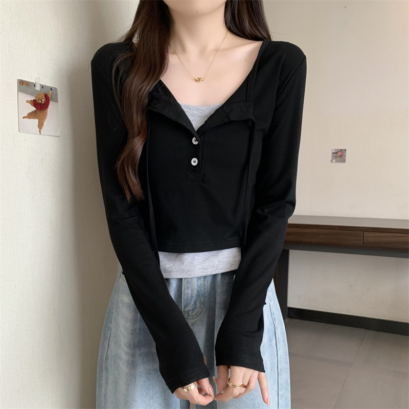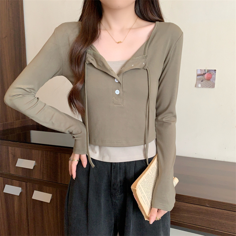틈새 디자인 센스 패션 스티칭 가짜 투피스 긴팔 티셔츠 여성 가을 새로운 슬림 핏 슬리밍 쇼트 탑인