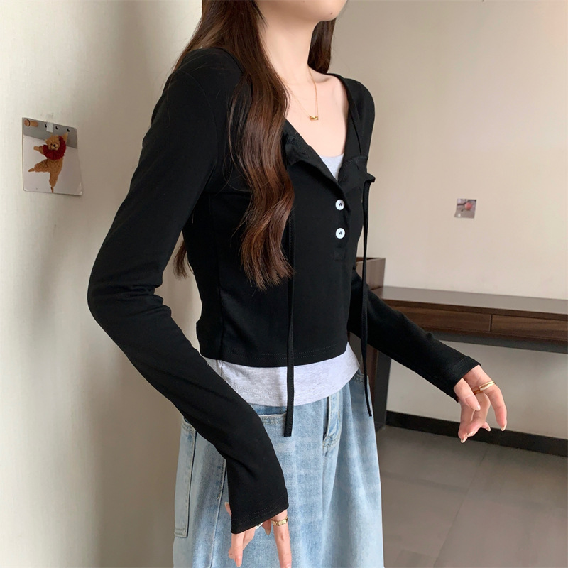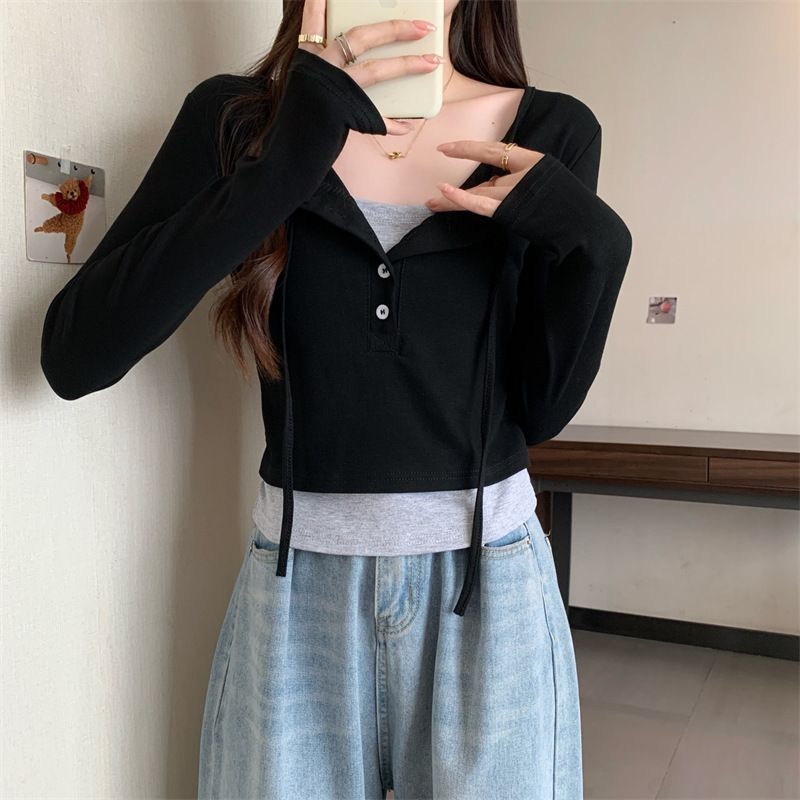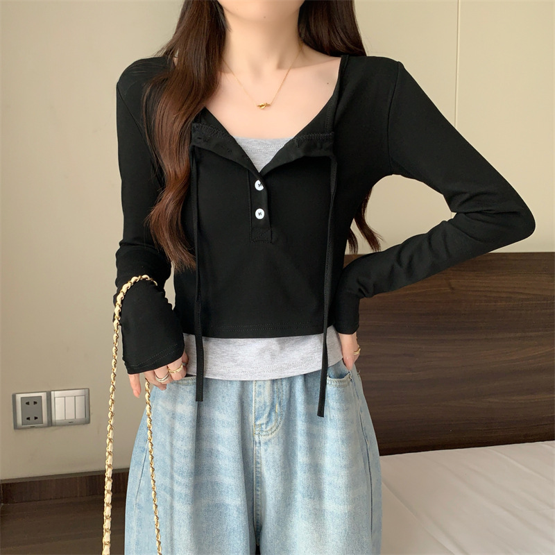 틈새 디자인 센스 패션 스티칭 가짜 투피스 긴팔 티셔츠 여성 가을 새로운 슬림 핏 슬리밍 쇼트 탑인스토어 가기