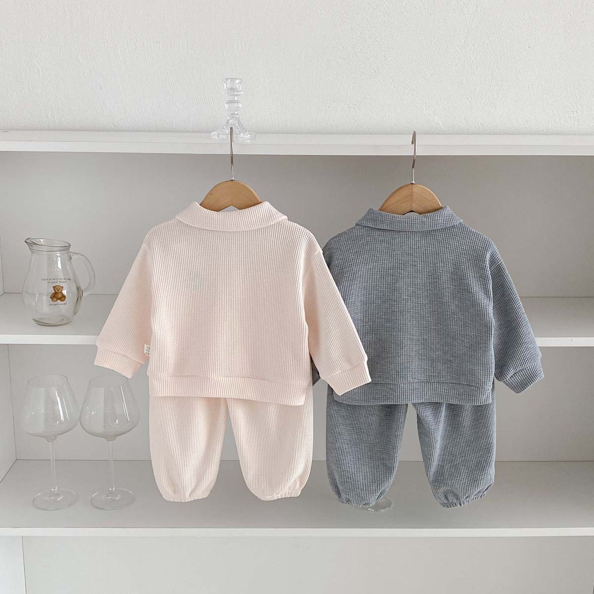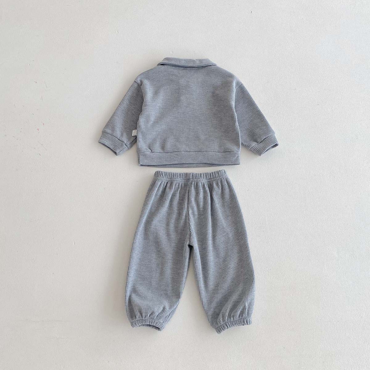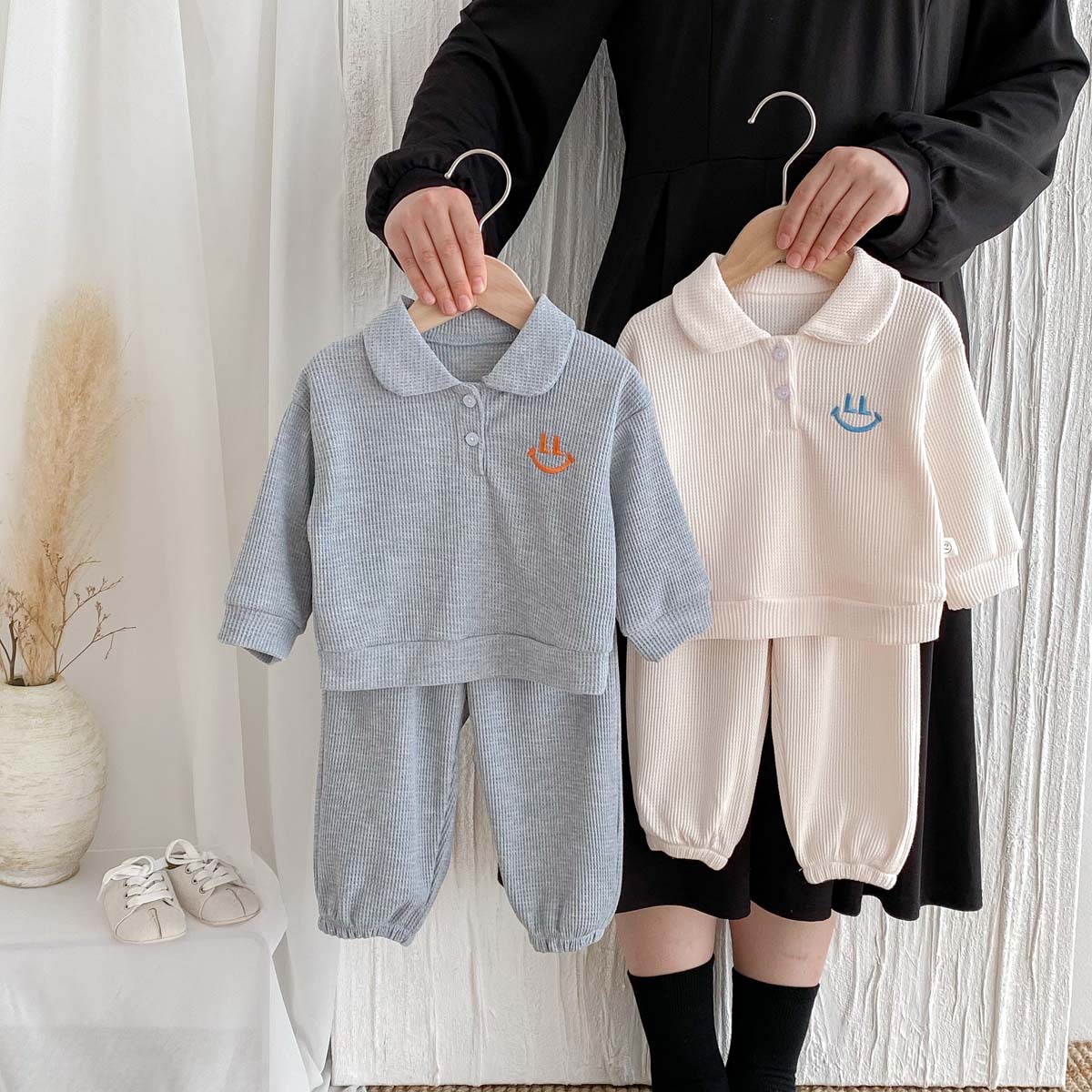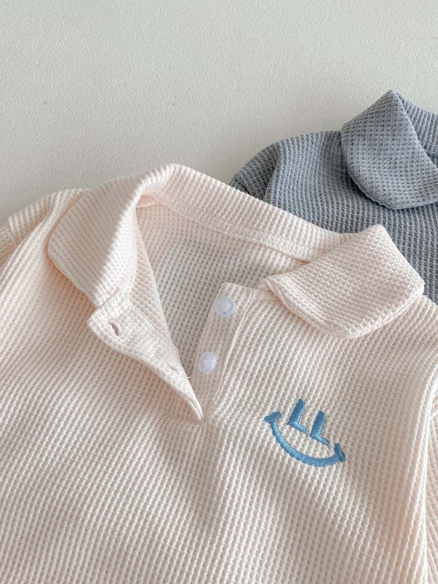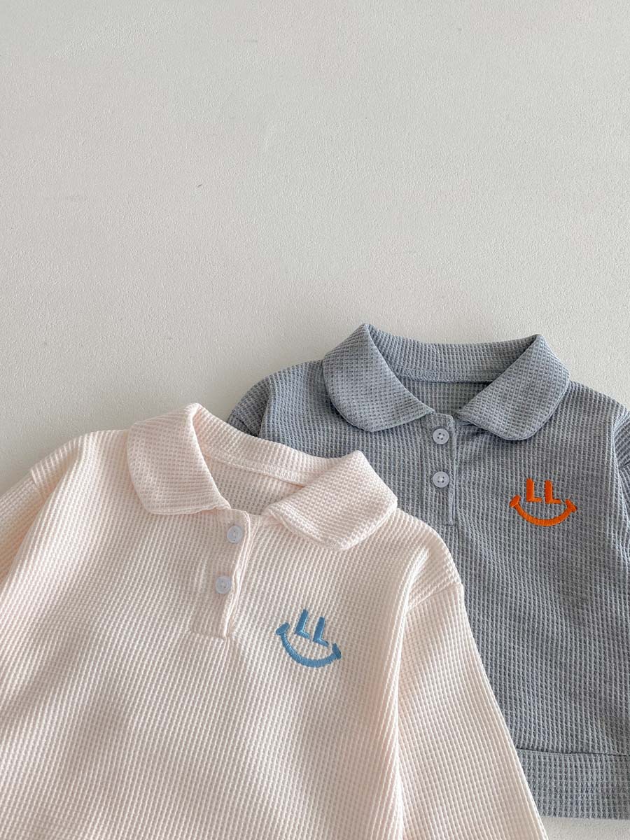 어린이용 봄, 가을 한국 스타일 폴로 칼라 긴팔 세트, 남아, 여아용 와플 체크 스마일 자수 투피스 세트스토어 가기