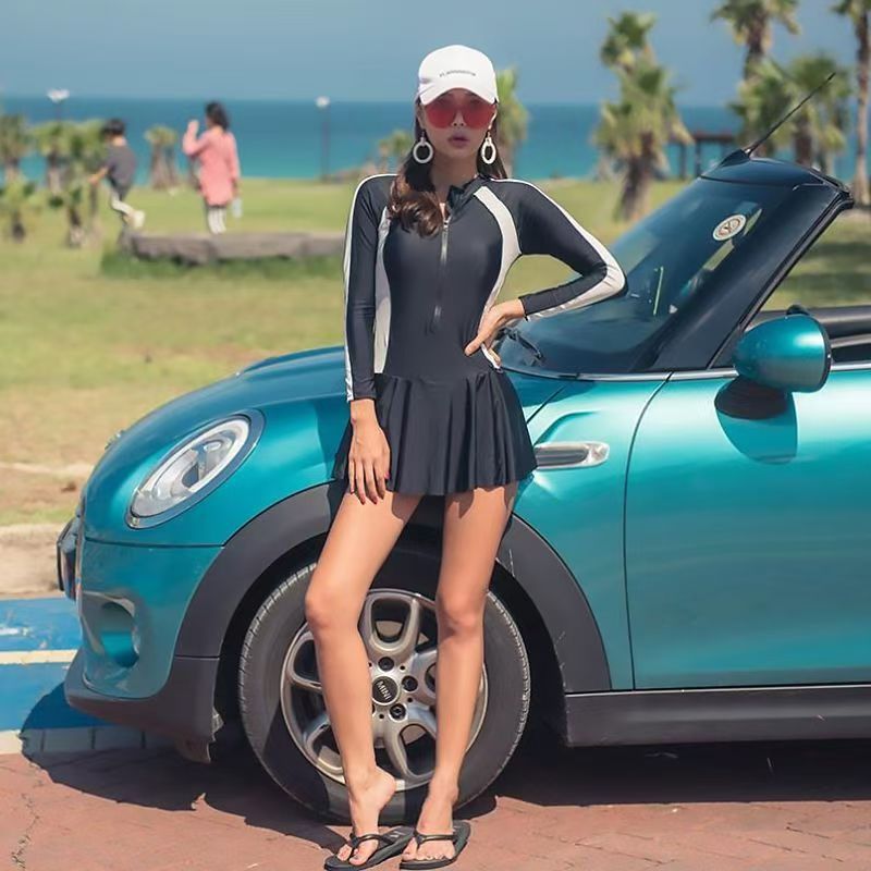 여성 수영복 제조업체 새로운 한국식 대형 온천 긴팔 수영복 원피스 스커트 스타일 보수적인 배 커버 슬리밍 수영복