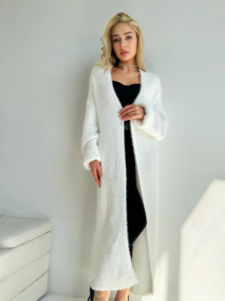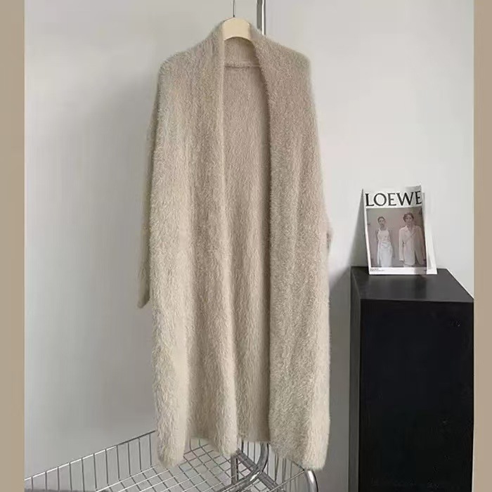 모조 밍크 양털 무릎 긴 니트 카디건 코트 여성용 2024 가을 및 겨울 느슨한 게으른 스타일 긴팔 스웨터 코트스토어 가기