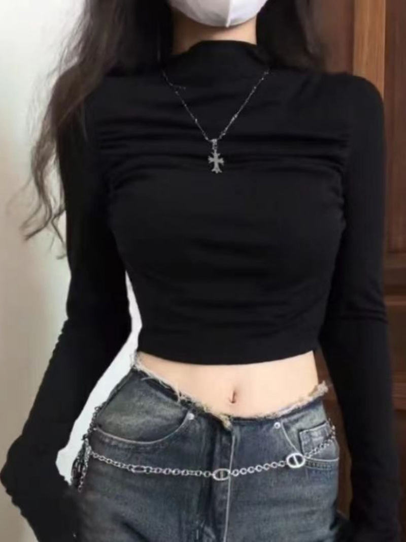 디자인 센스 틈새 주름 바지 셔츠 긴팔 티셔츠 여성용 가을 새로운 순수 슬림 핏 짧은 내부 탑