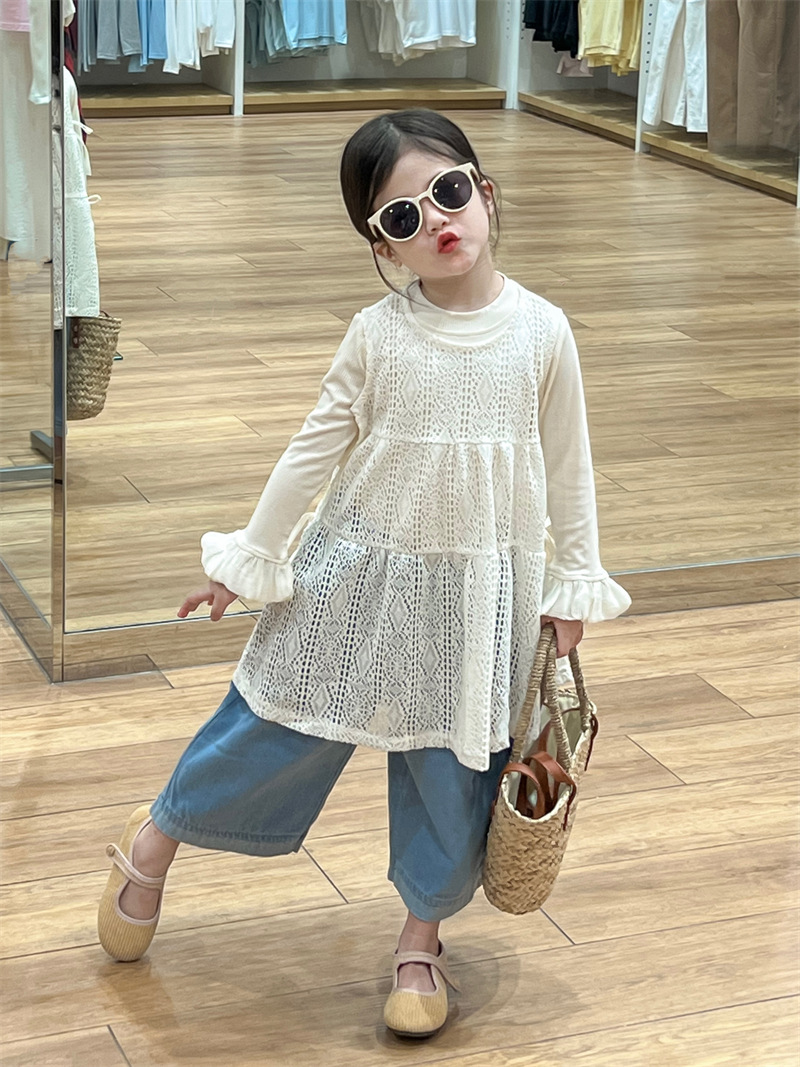 한국식 소녀의 봄과 가을 중공 스트랩 조끼 스커트 거즈 슬리브 베이스 2 피스 스커트 세트 별도 샷