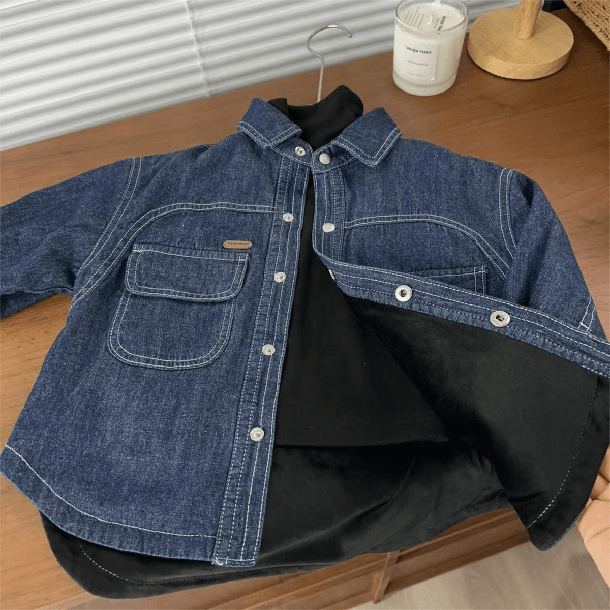 남아용 한국 스타일 데님 플리스 안감 긴팔 셔츠 2026 가을 겨울 신상 중대형 아동용 세련되고 따뜻한 싱글 버튼 상의