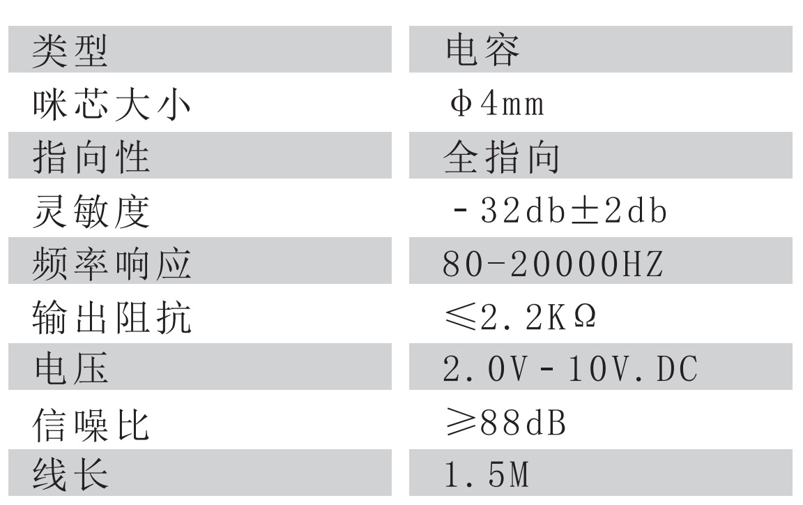 灵敏度:22 mv / Pa (-32 db±2 db)