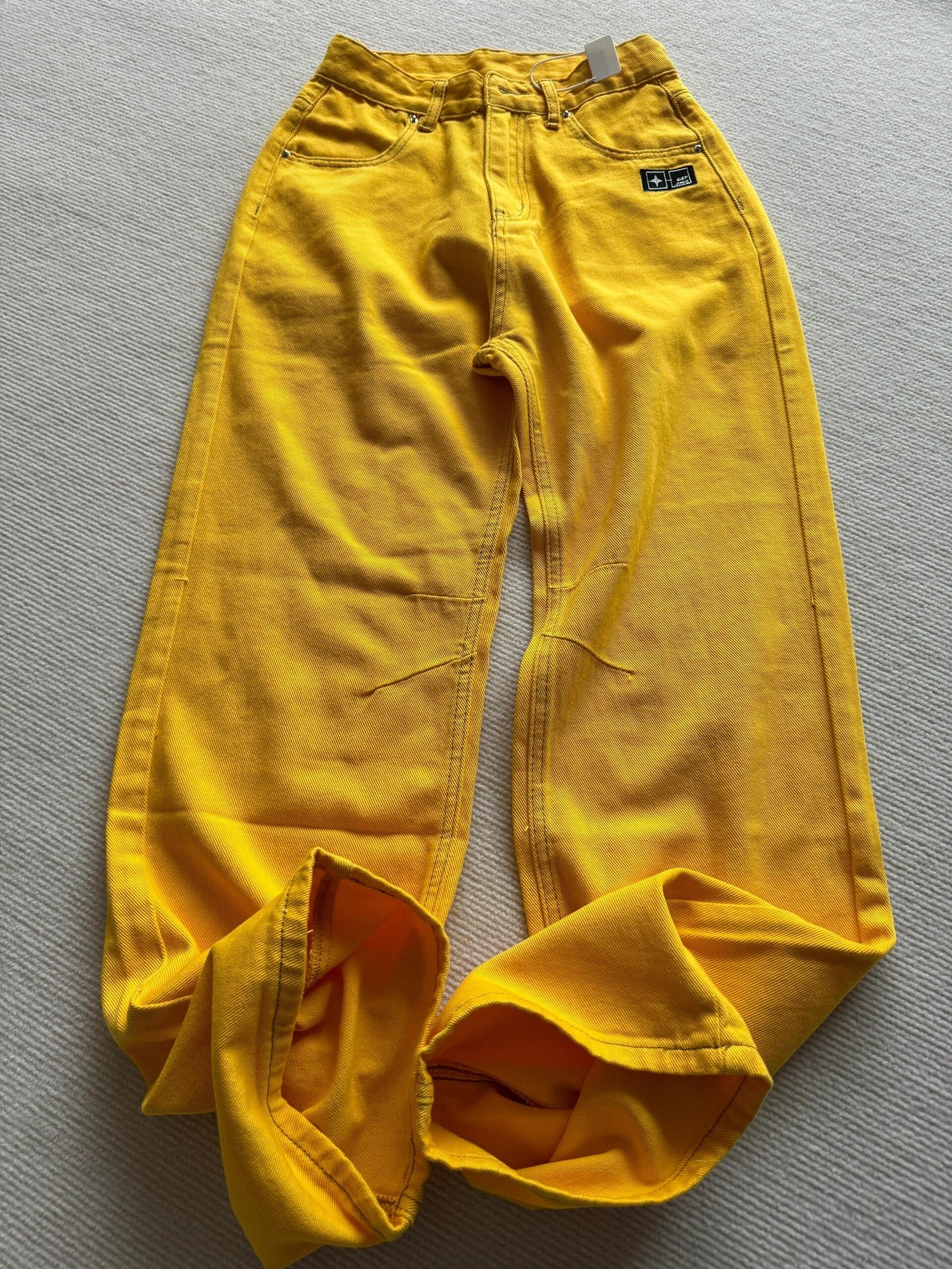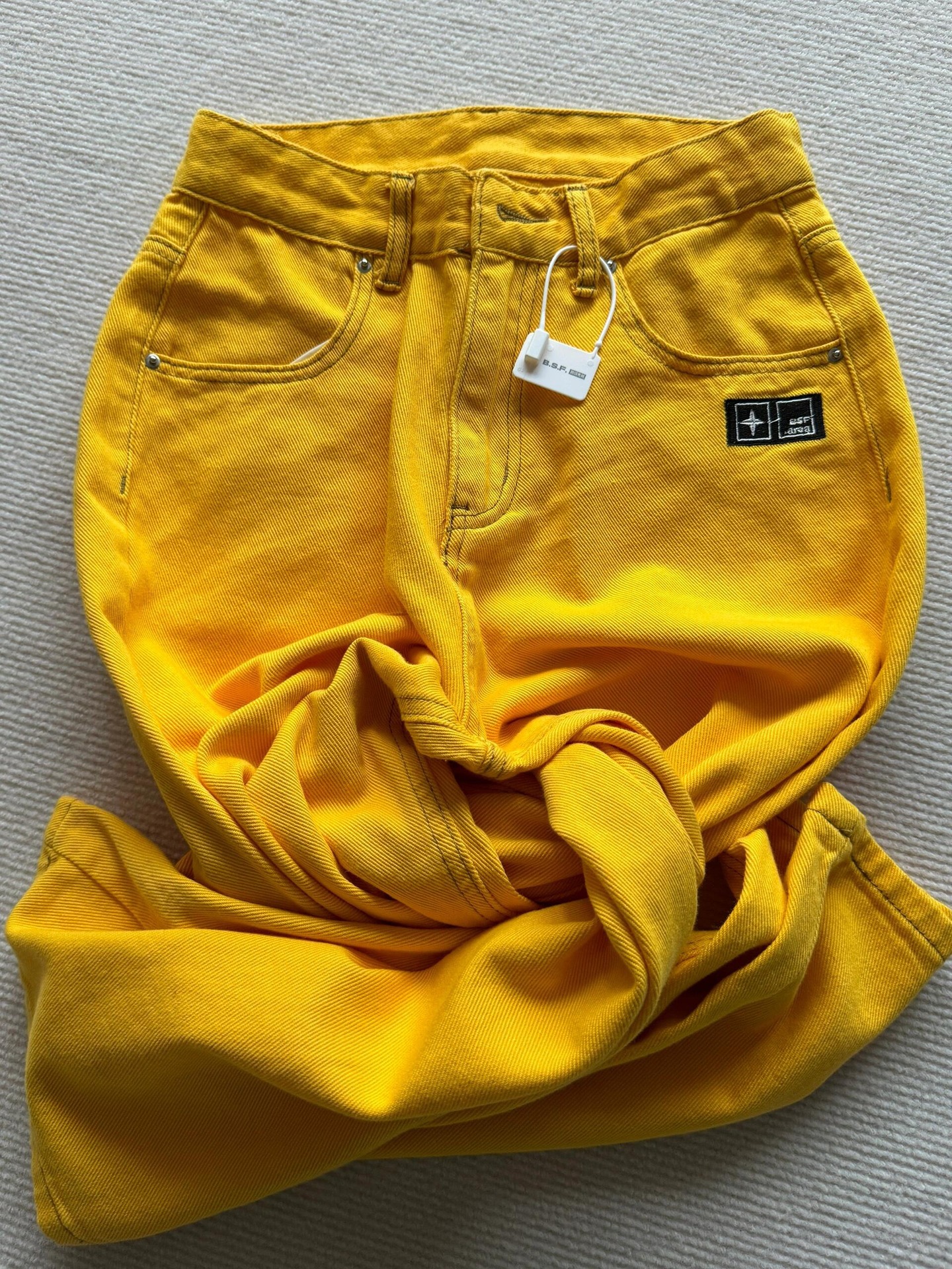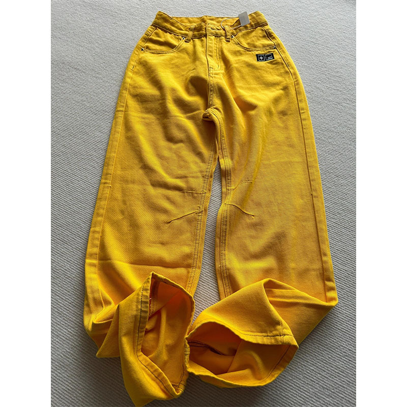 노란 청바지 여성의 높은 허리 바지 스트레이트 레그 넓은 다리 바지 슬리밍 느슨한 캐주얼 하이 스트리트 올 매치 스트레이트 레그 팬츠