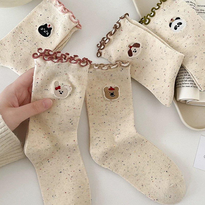 나무 귀 만화 머리 양말 여성의 중간 튜브 양말 봄과 여름 얇은 레이스 긴 튜브 만화 곰 강아지 귀여운 양말