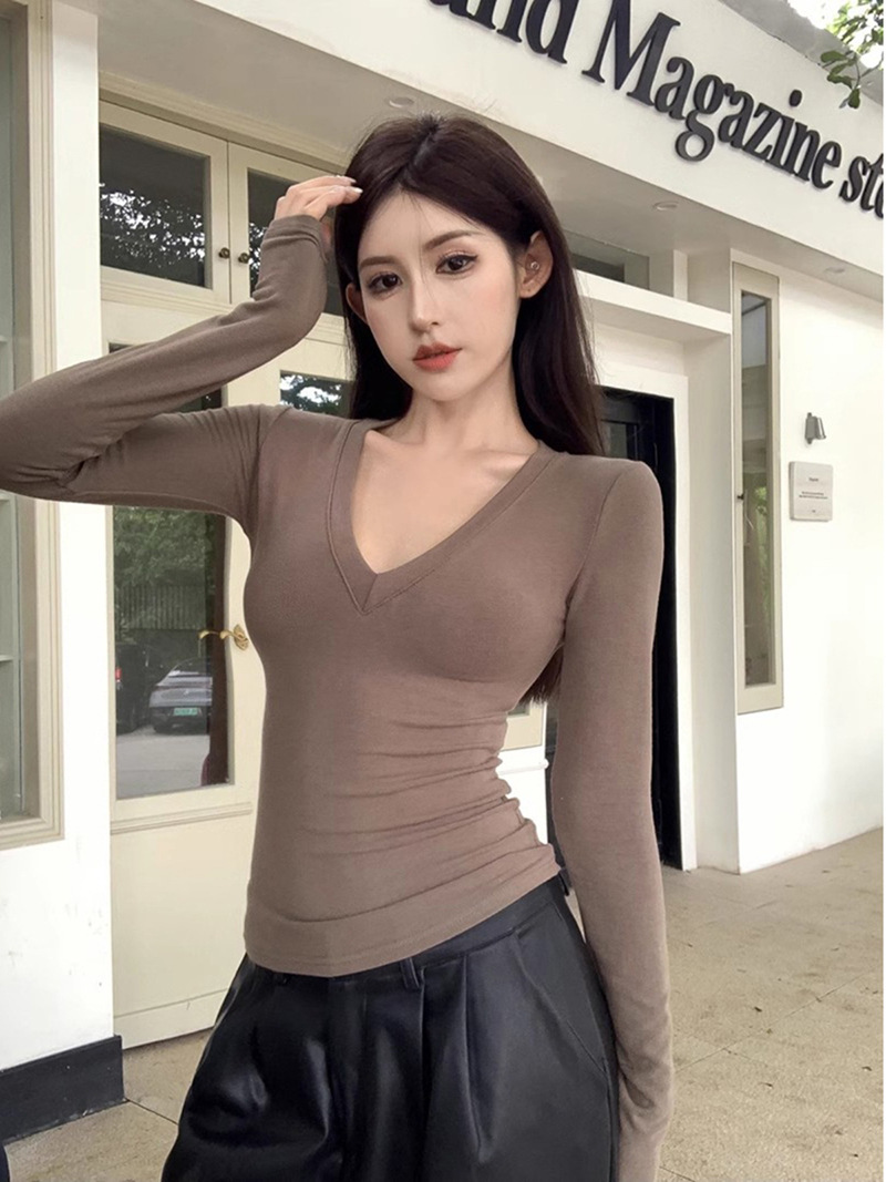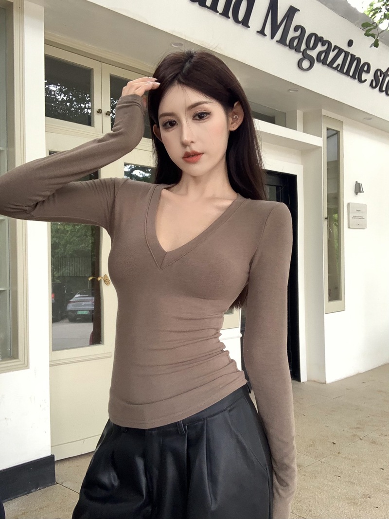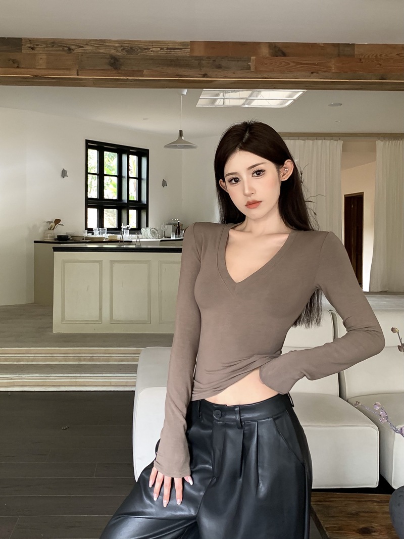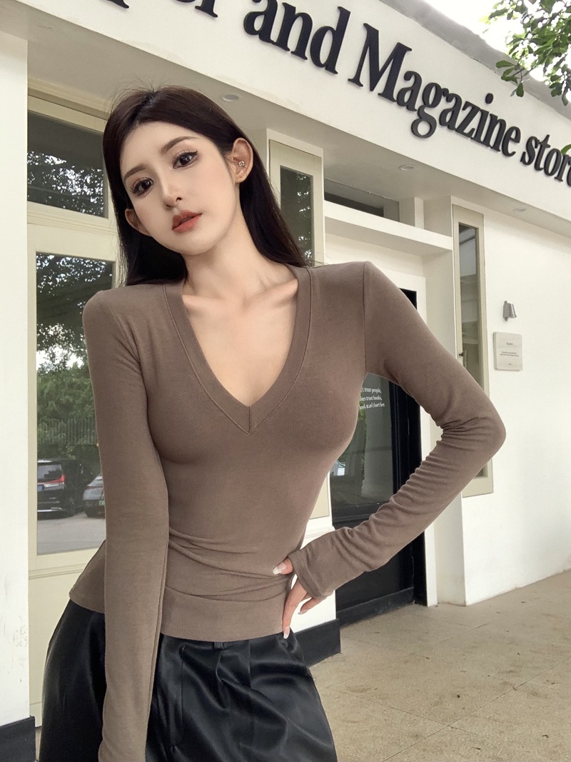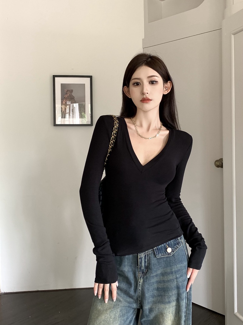 스파이스 걸 스타일 V 넥 긴팔 티셔츠 가을 겨울 2024 여성을위한 새로운 우아한 슬림핏 슬리밍 짧은 내베이스 셔츠 탑