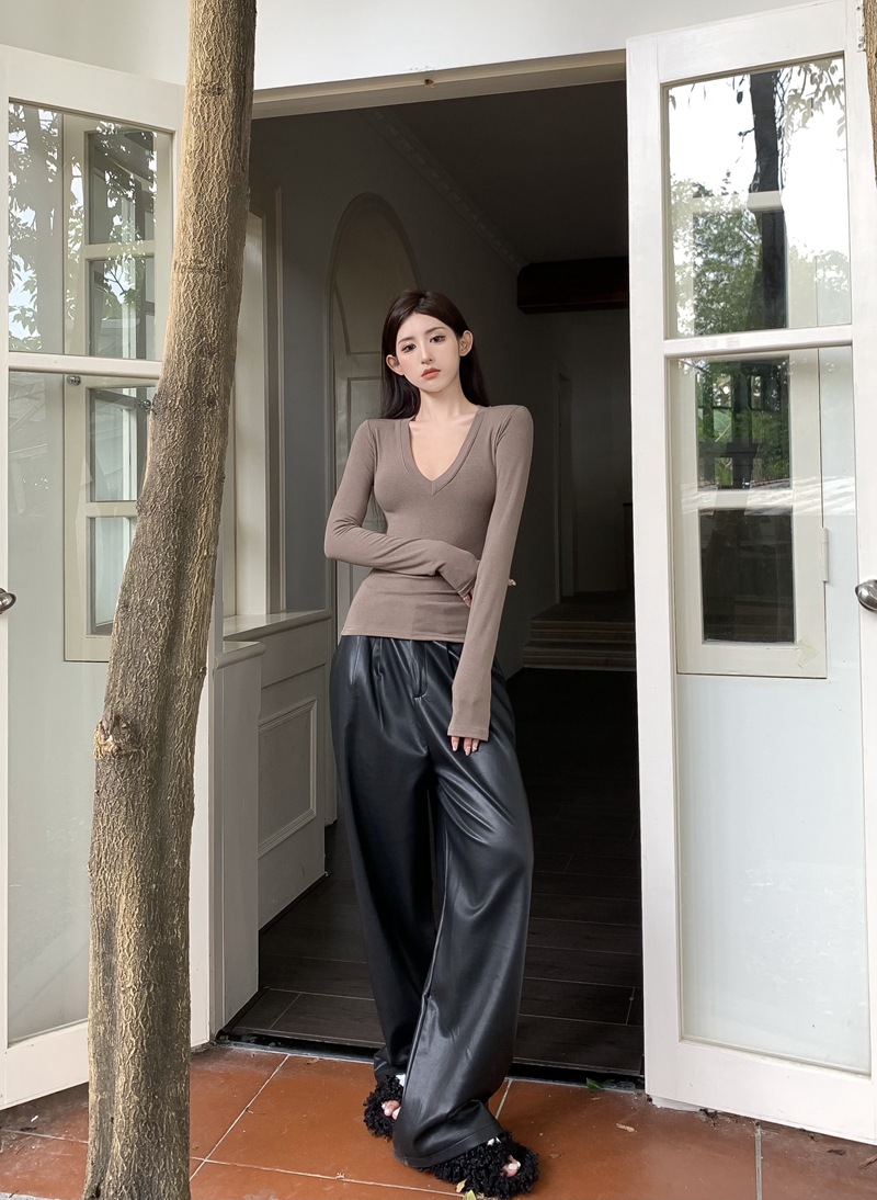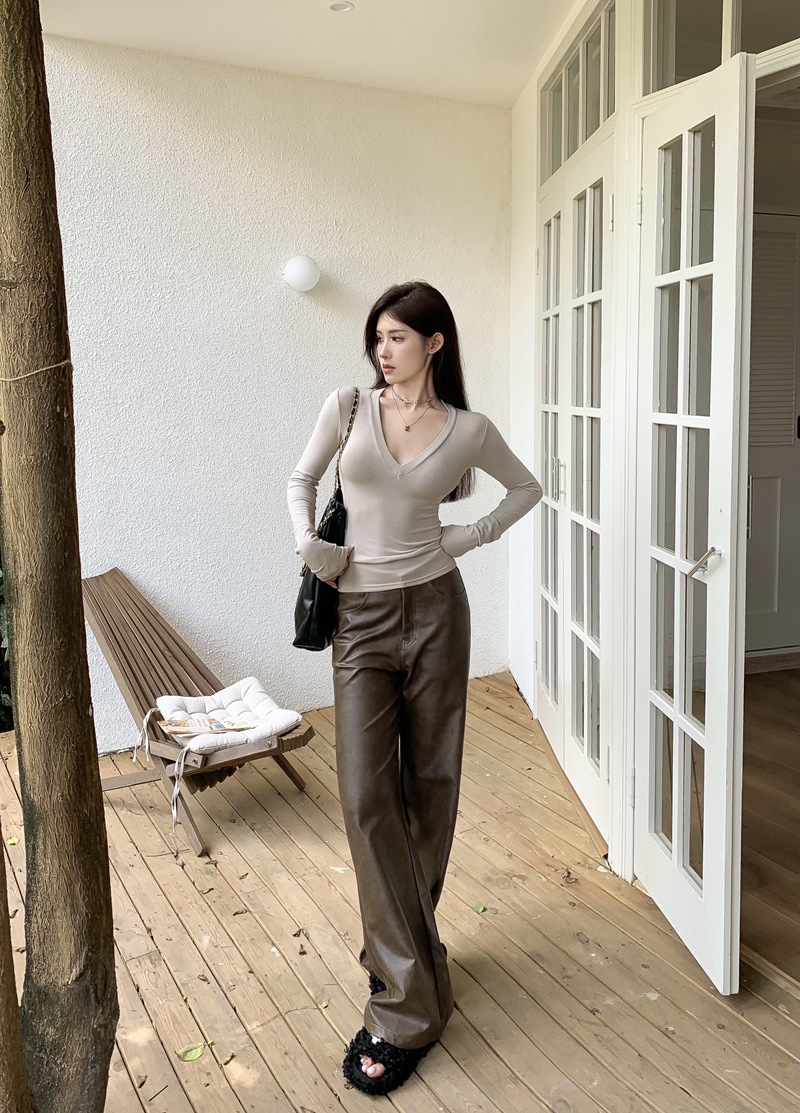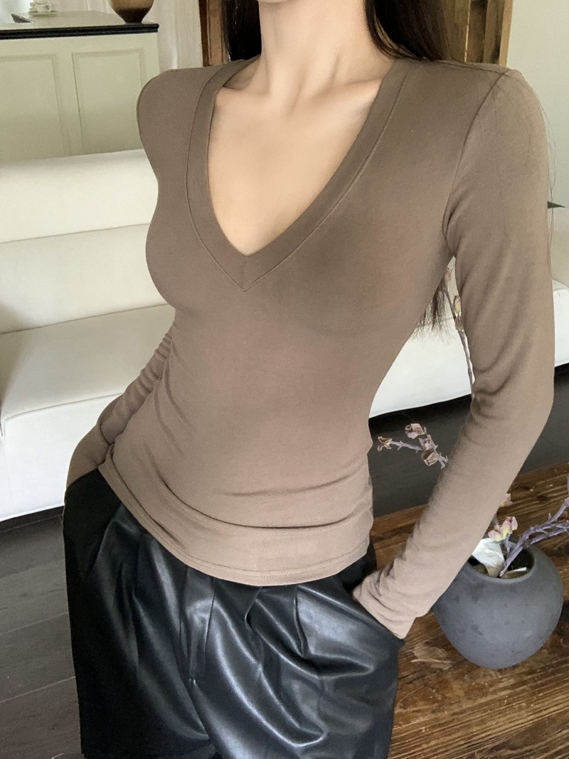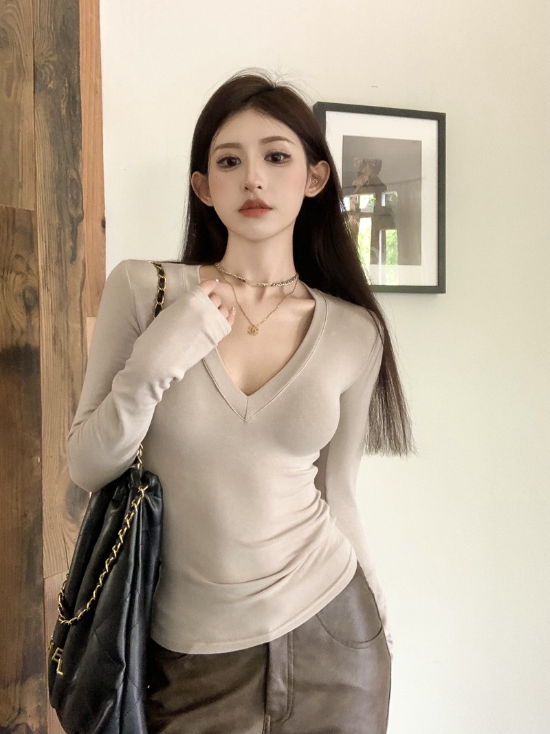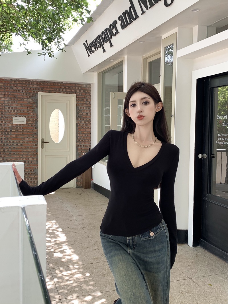 스파이스 걸 스타일 V 넥 긴팔 티셔츠 가을 겨울 2024 여성을위한 새로운 우아한 슬림핏 슬리밍 짧은 내베이스 셔츠 탑