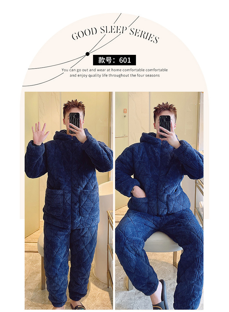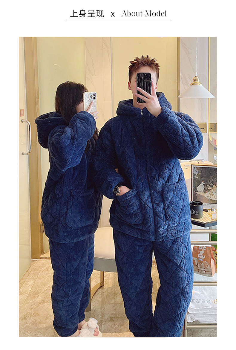 후드 블루 커플 잠옷 남성과 여성의 플란넬 3 층 겨울 따뜻한 산호 양털 홈 기모 두껍게