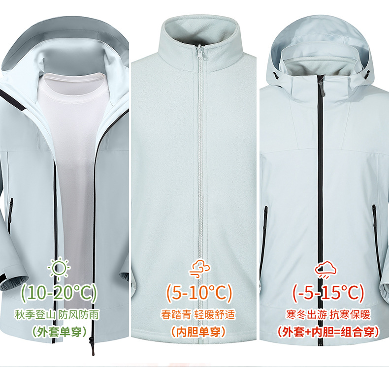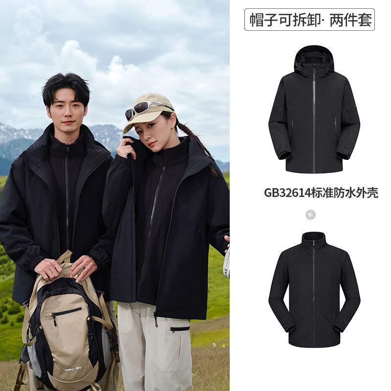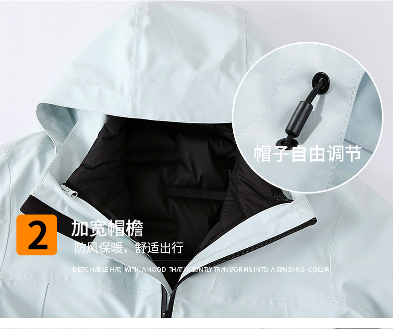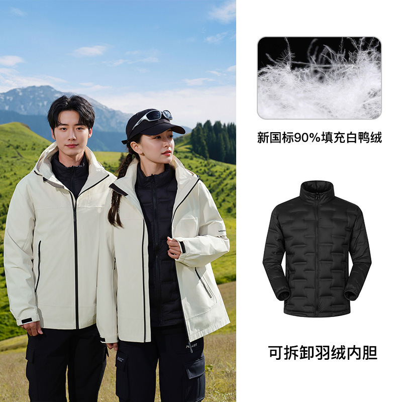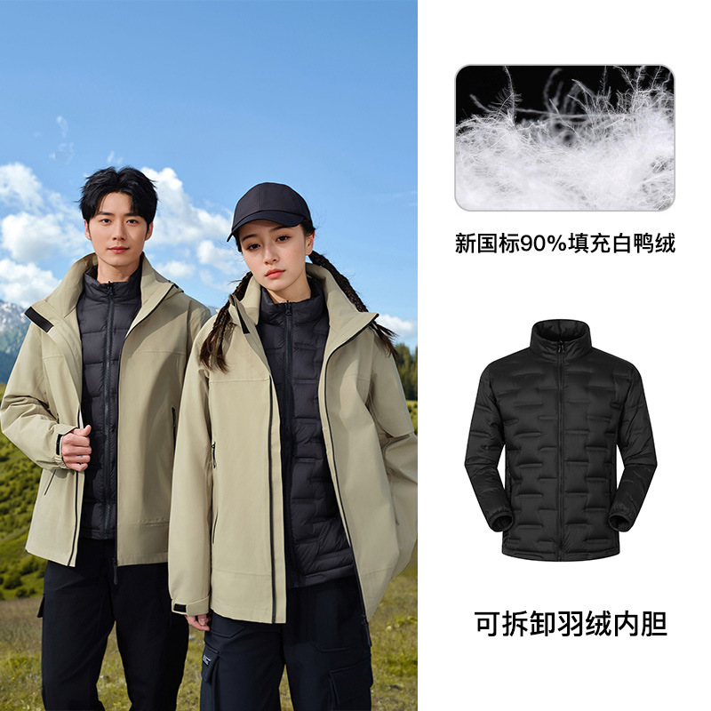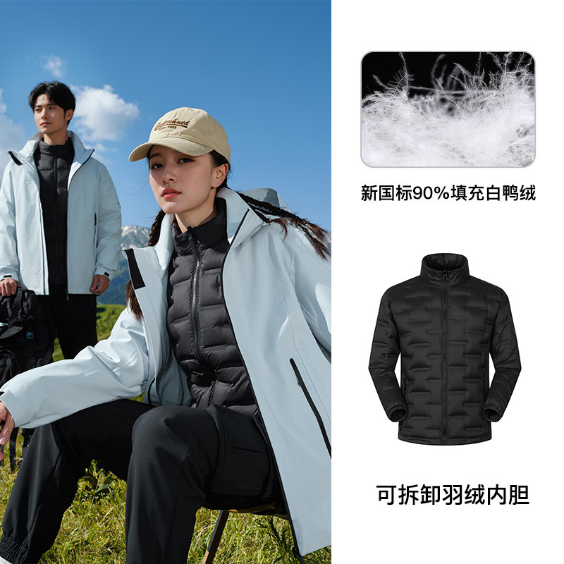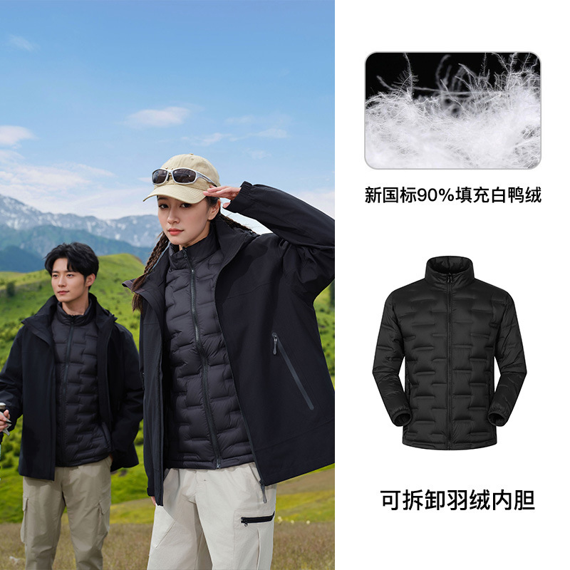 국가 표준 90 벨벳 남성용 3-in-1 쉐이크 다운 재킷, 폭풍우 등급 방수 및 방풍 재킷, 여성용 하이킹 및 등산 재킷