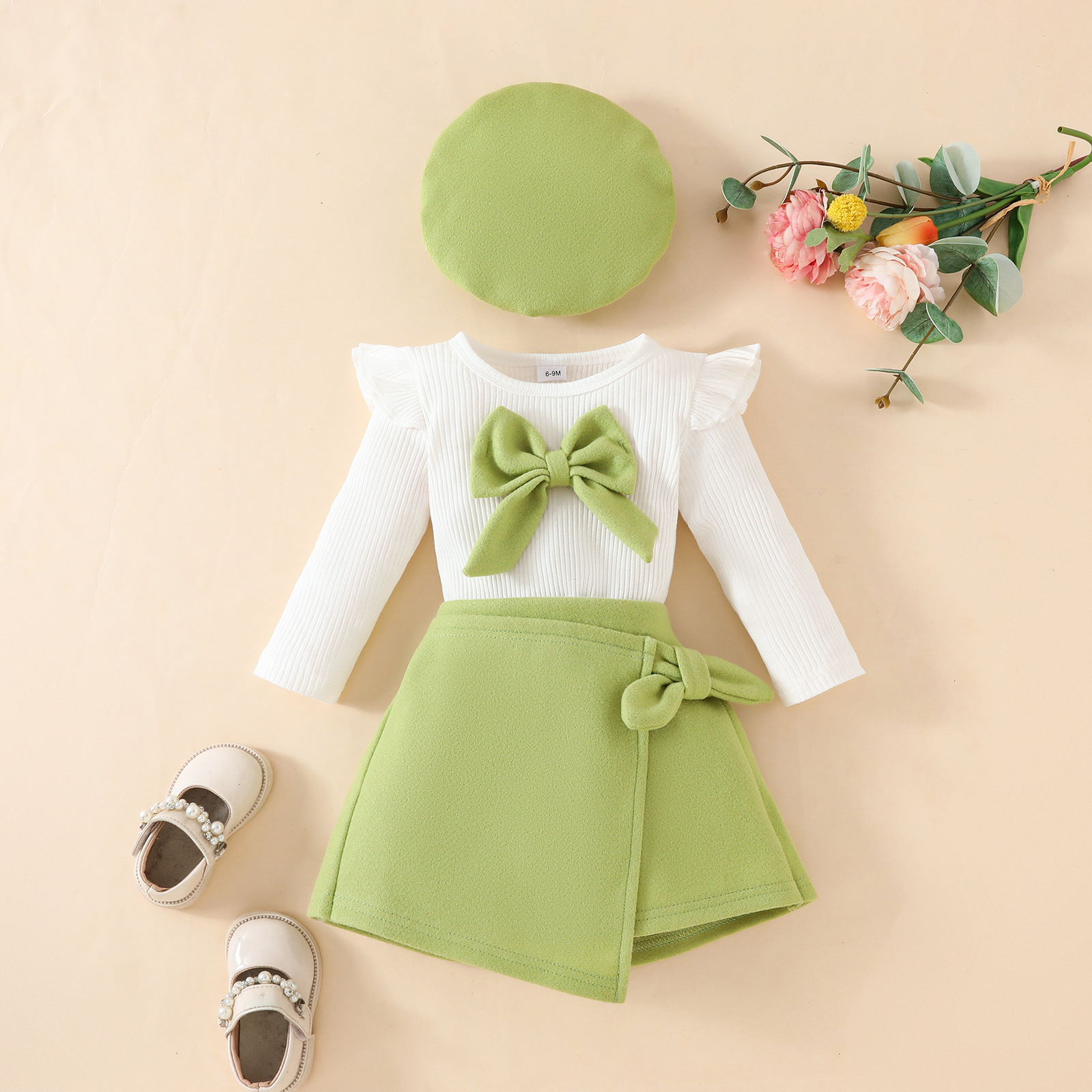 아마존 패션 유아 소녀 큰 활 베레모 긴 소매 최고 기모 스커트 가을과 겨울 3 피스 세트
