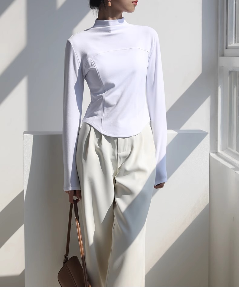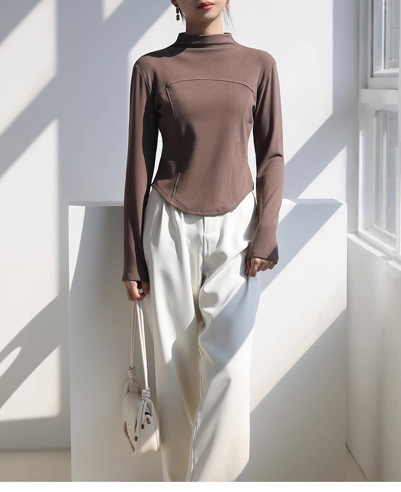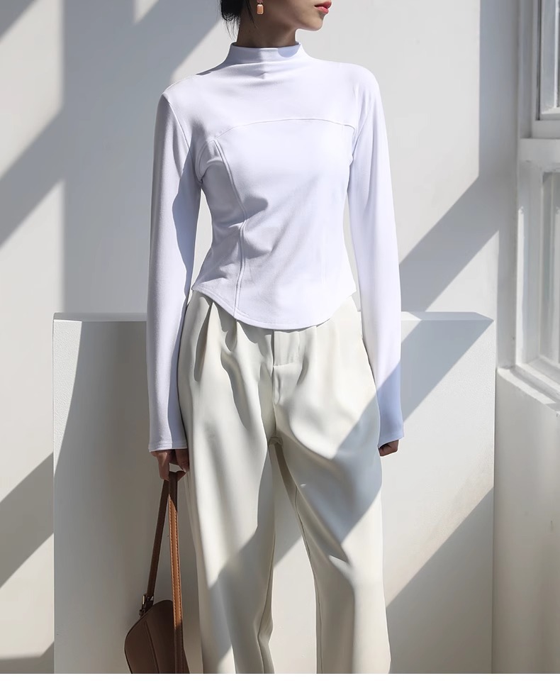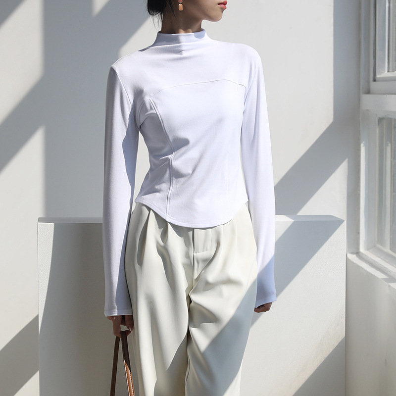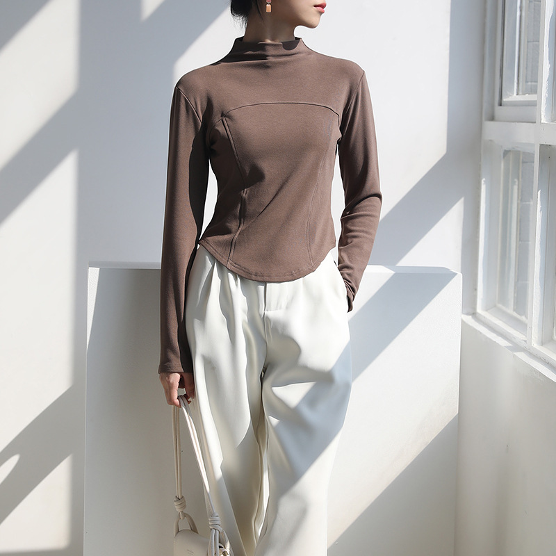 2024 가을과 겨울 여성의 세미 하이 칼라 긴 소매 따뜻한 내면베이스 셔츠 얇은 슬림 티셔츠를 꿰매는 곡선 형 밑단스토어 가기