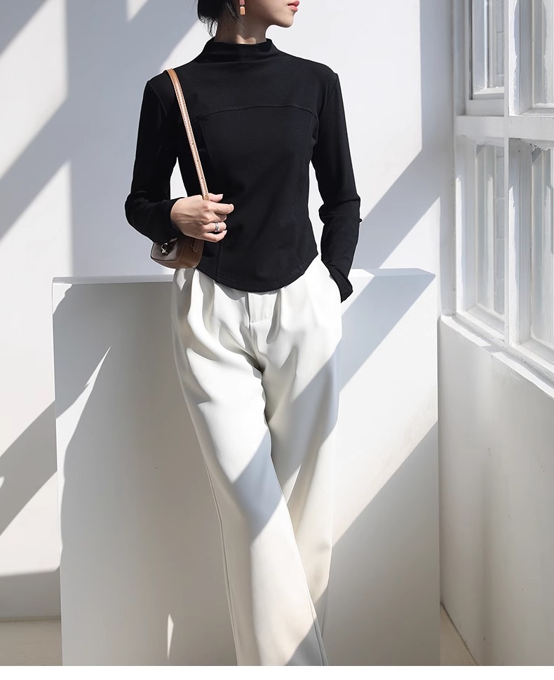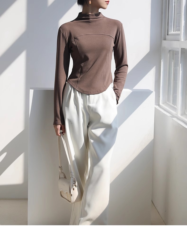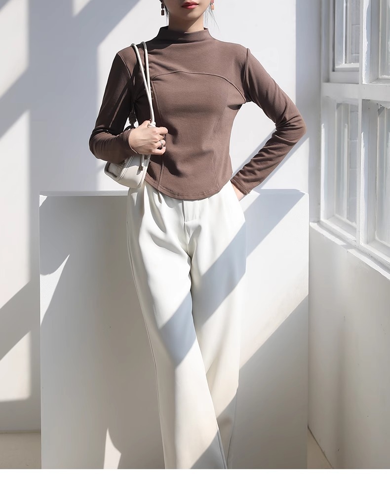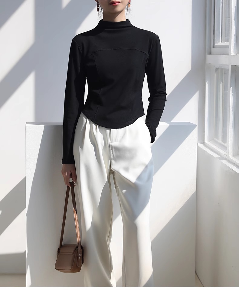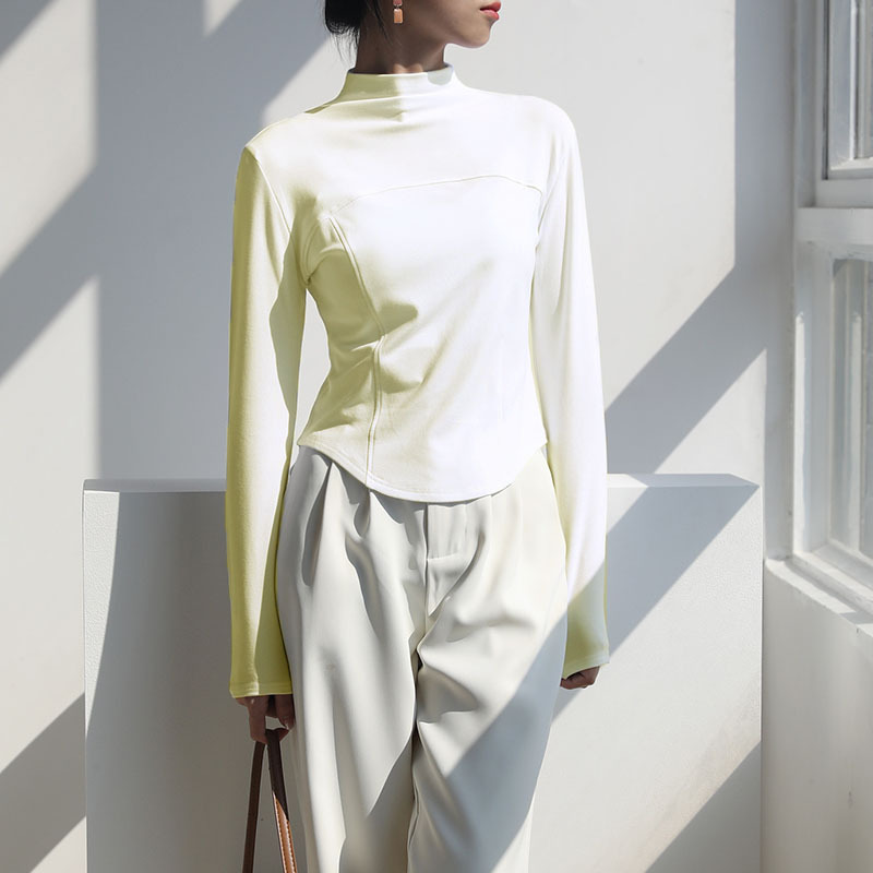 2024 가을과 겨울 여성의 세미 하이 칼라 긴 소매 따뜻한 내면베이스 셔츠 얇은 슬림 티셔츠를 꿰매는 곡선 형 밑단스토어 가기