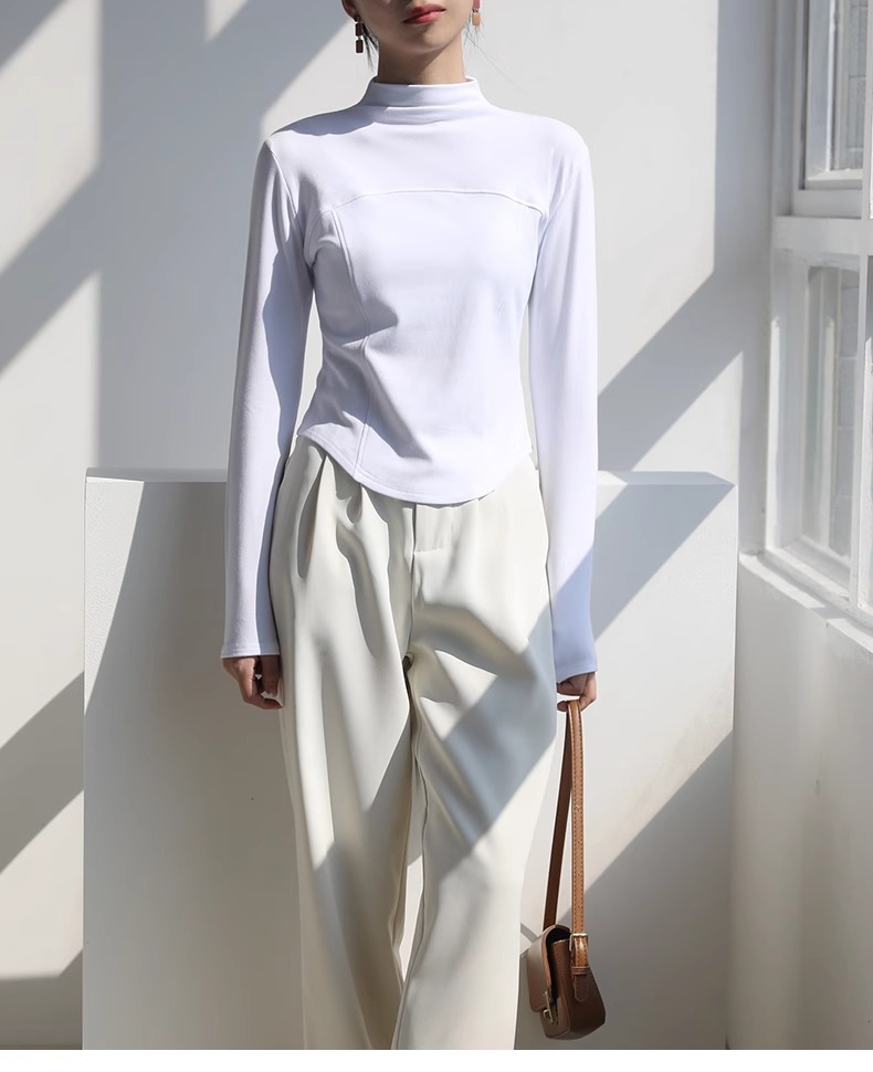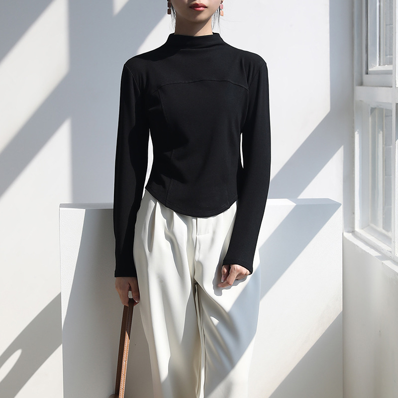 2024 가을과 겨울 여성의 세미 하이 칼라 긴 소매 따뜻한 내면베이스 셔츠 얇은 슬림 티셔츠를 꿰매는 곡선 형 밑단