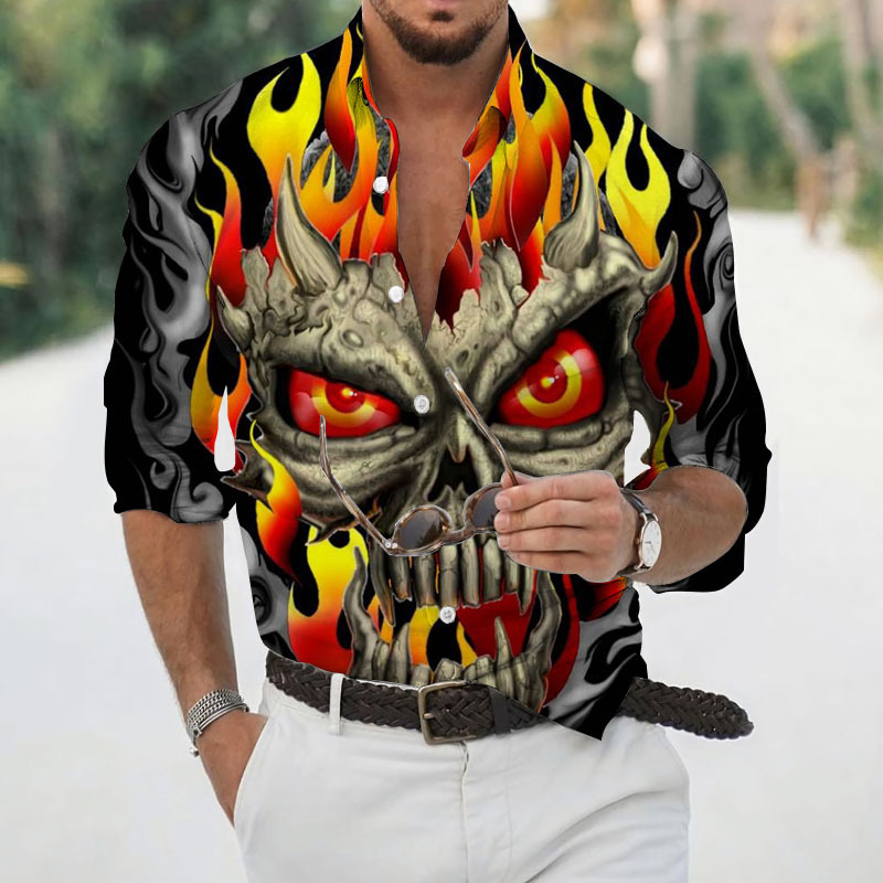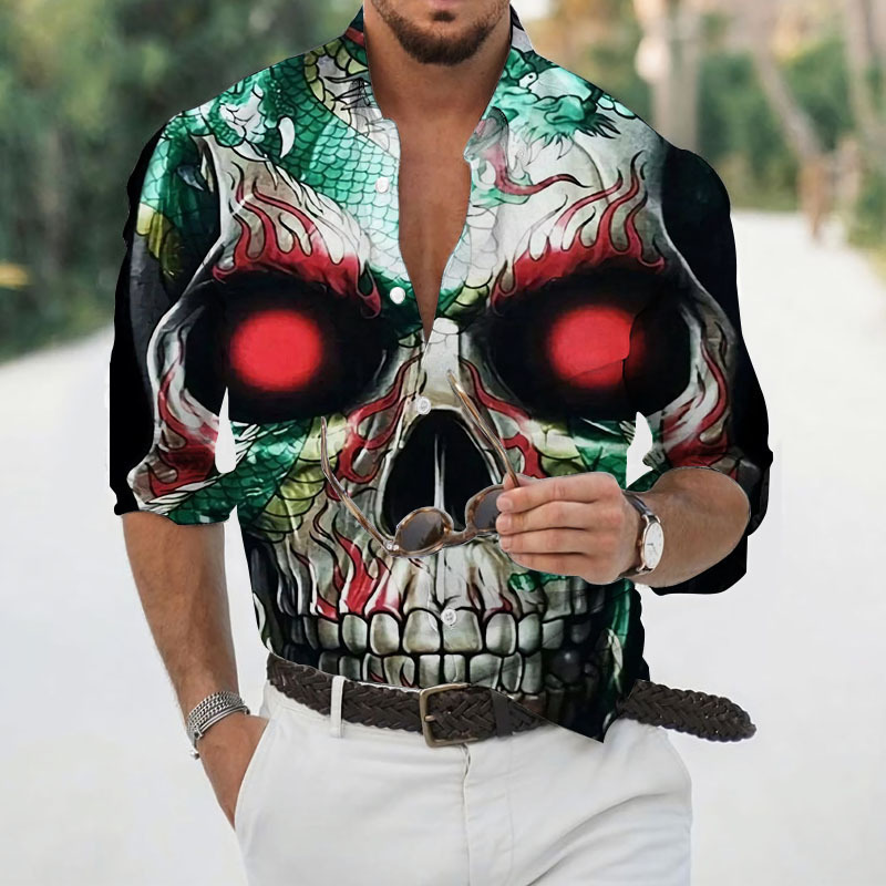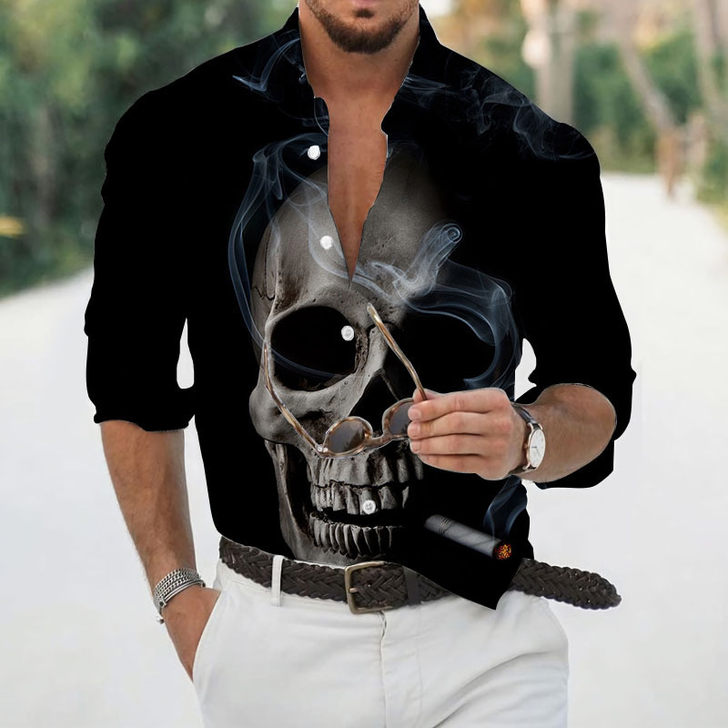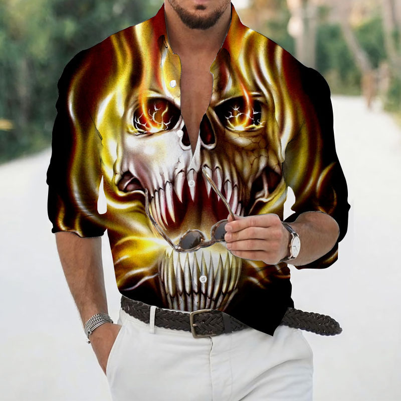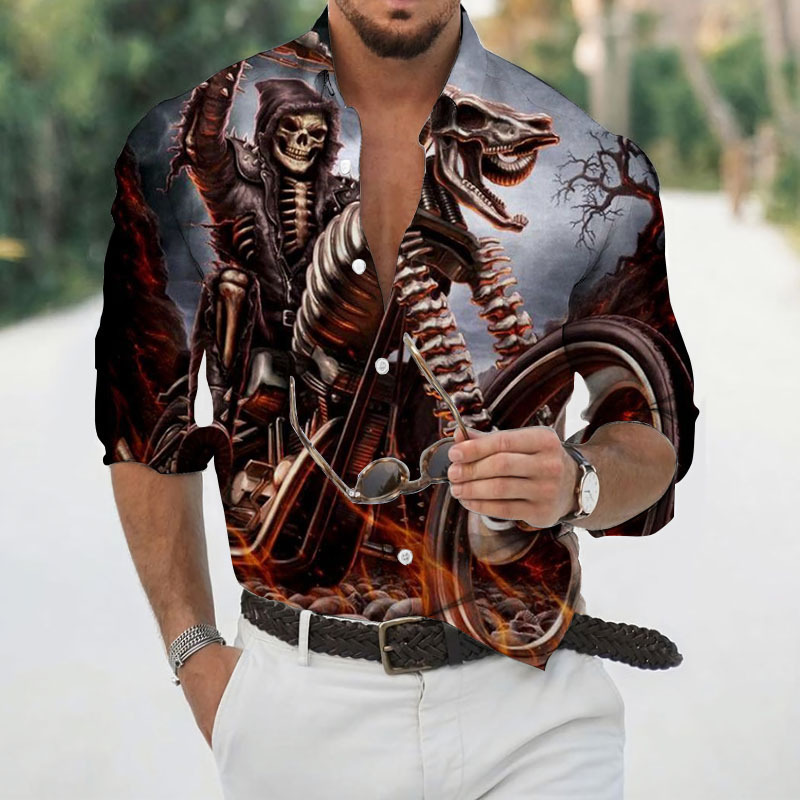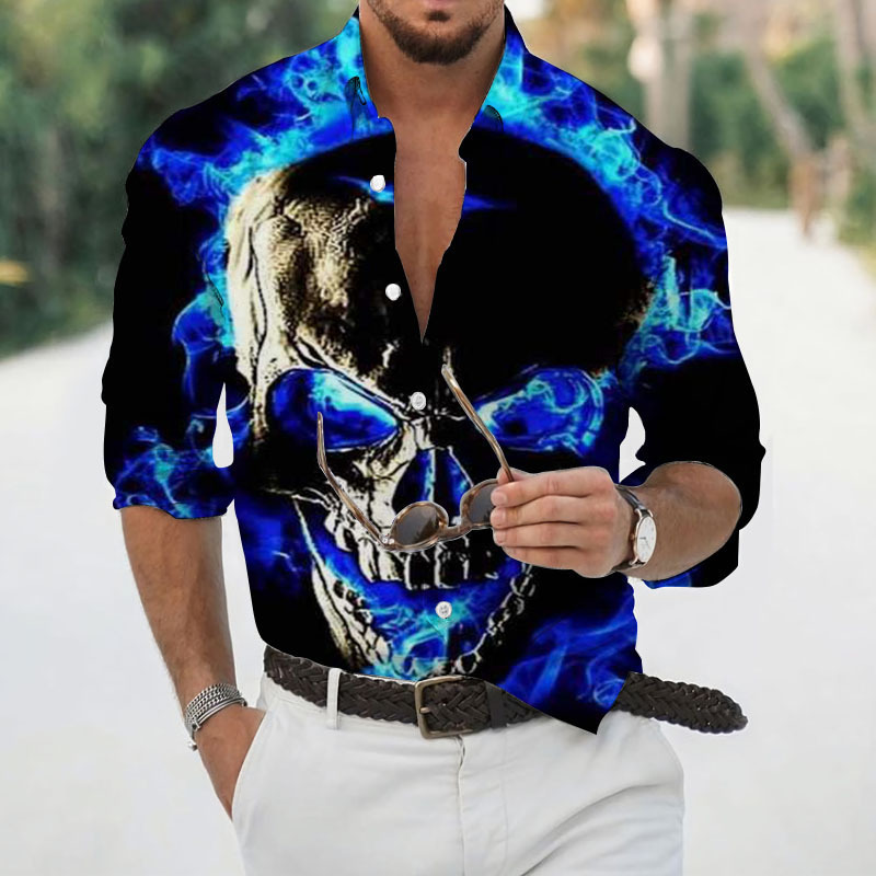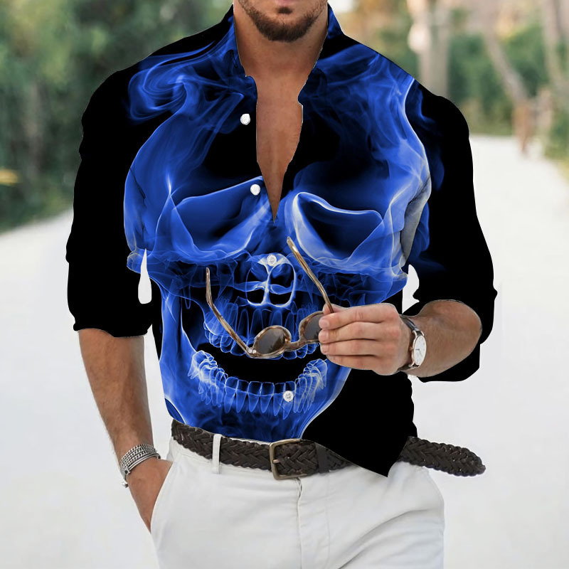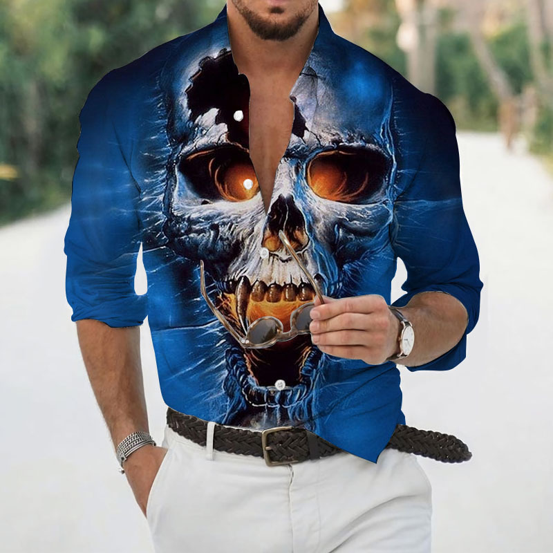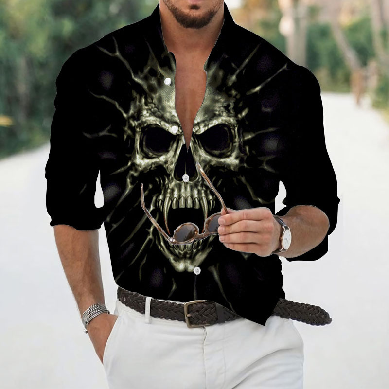 2024 크로스 국경 핫 세일 남자의 해골 셔츠 3D 프린트 긴 소매 하와이 셔츠 캐주얼 릴 긴 소매