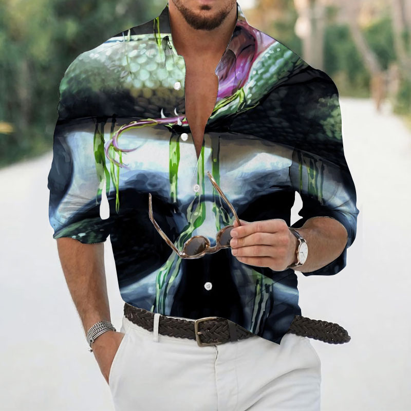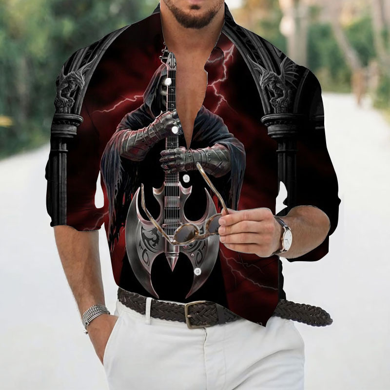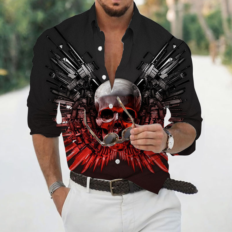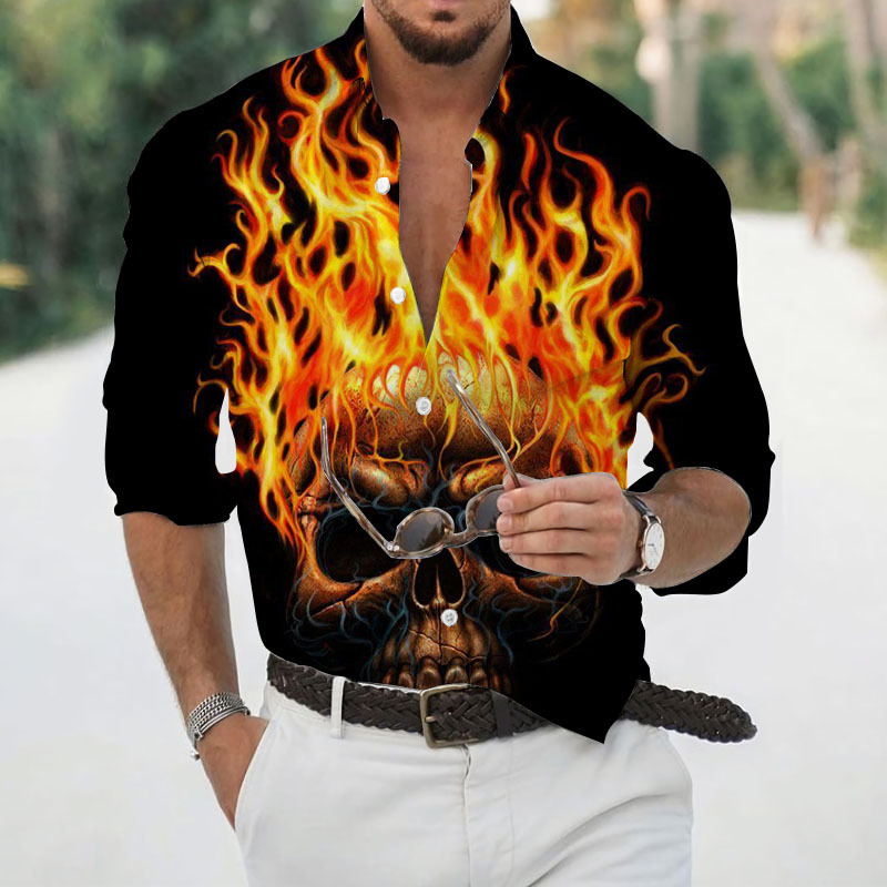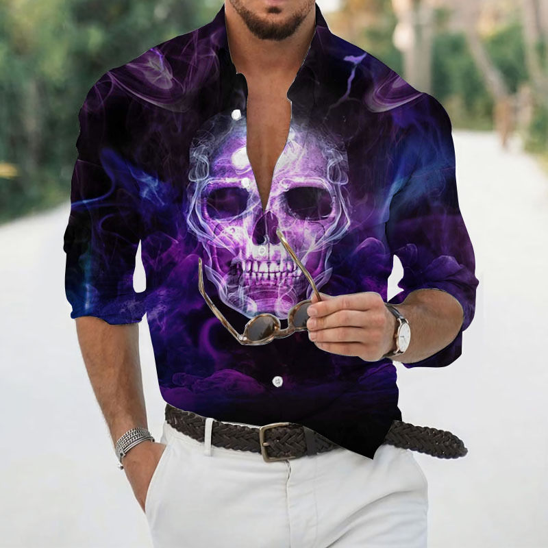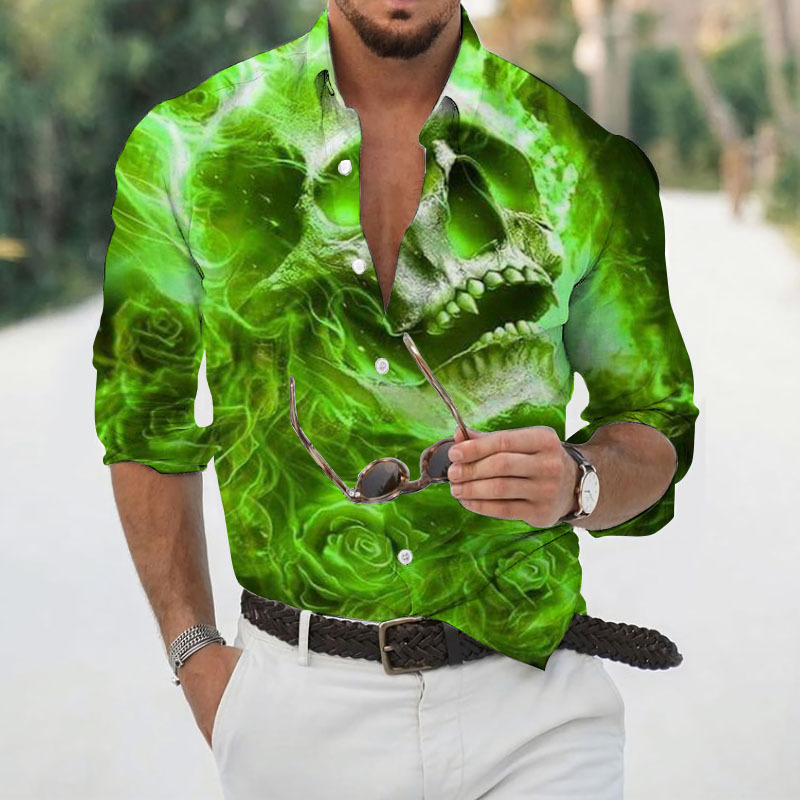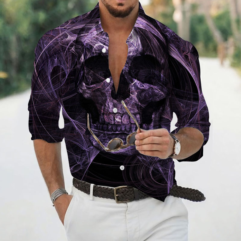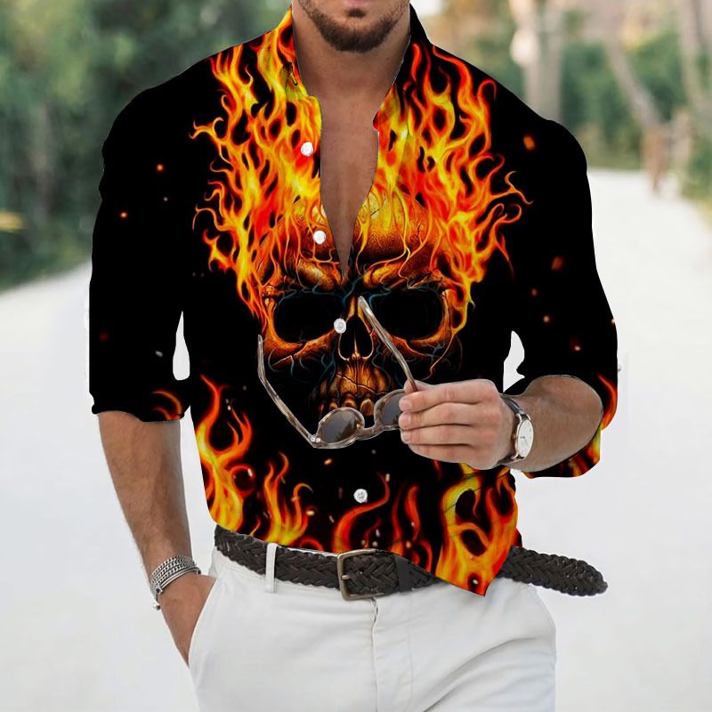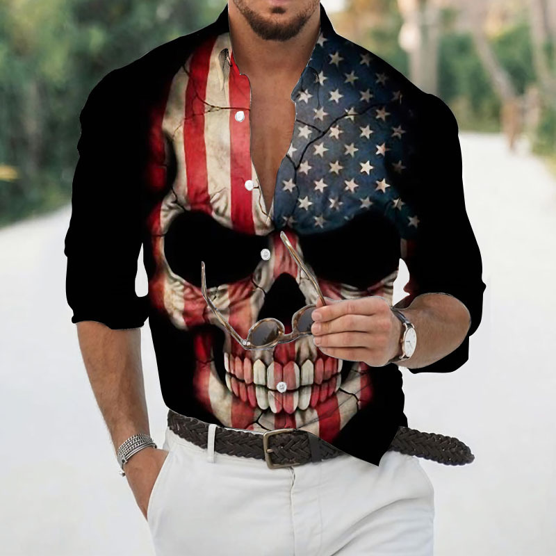 2024 크로스 국경 핫 세일 남자의 해골 셔츠 3D 프린트 긴 소매 하와이 셔츠 캐주얼 릴 긴 소매