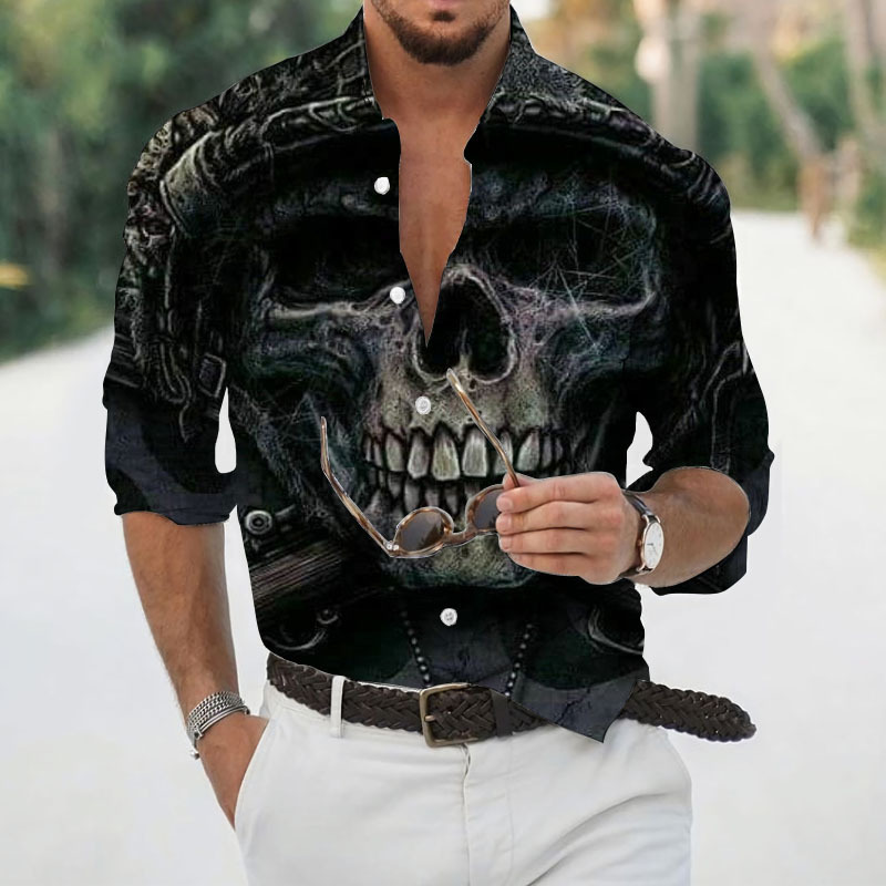 2024 크로스 국경 핫 세일 남자의 해골 셔츠 3D 프린트 긴 소매 하와이 셔츠 캐주얼 릴 긴 소매스토어 가기