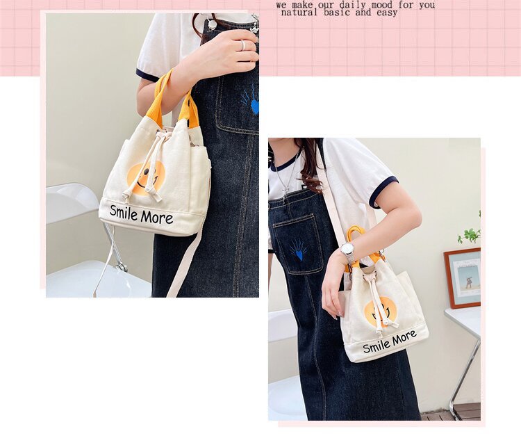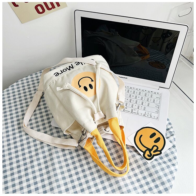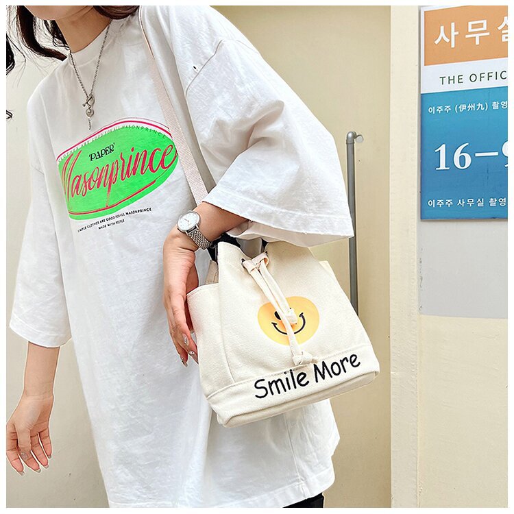 국경 간 틈새 디자인 귀여운 웃는 손 가방 학생 캔버스 크로스 바디 가방 원단 만화 휴대용 버킷