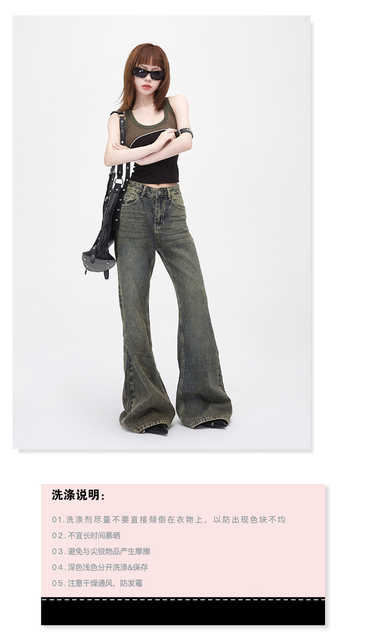 진흙 노란색 오래 된 Elasticless 느슨한 데님 걸레 바지 하이 스트리트 미국 스타일 다리가 아닌 청바지 긴 바지