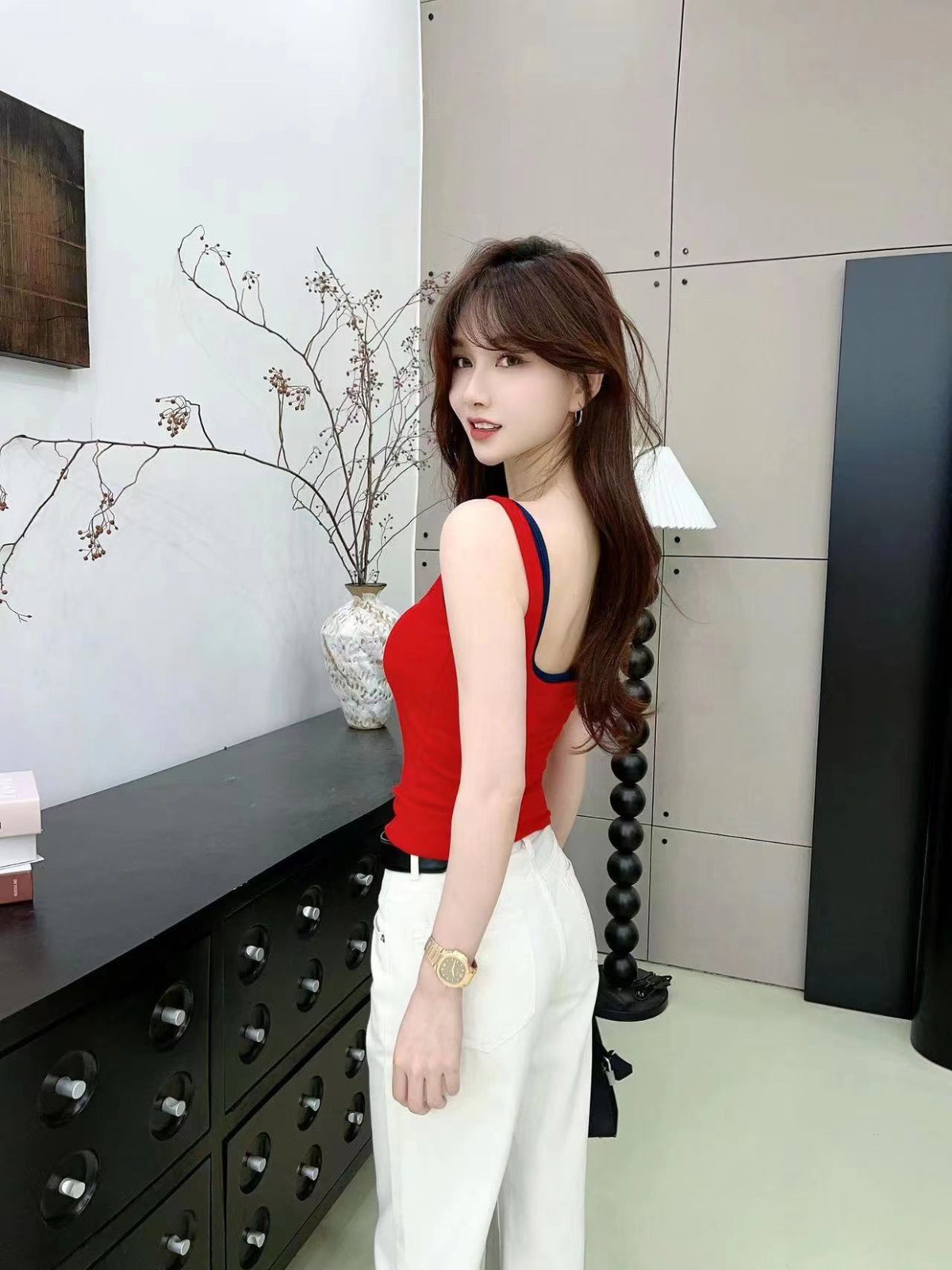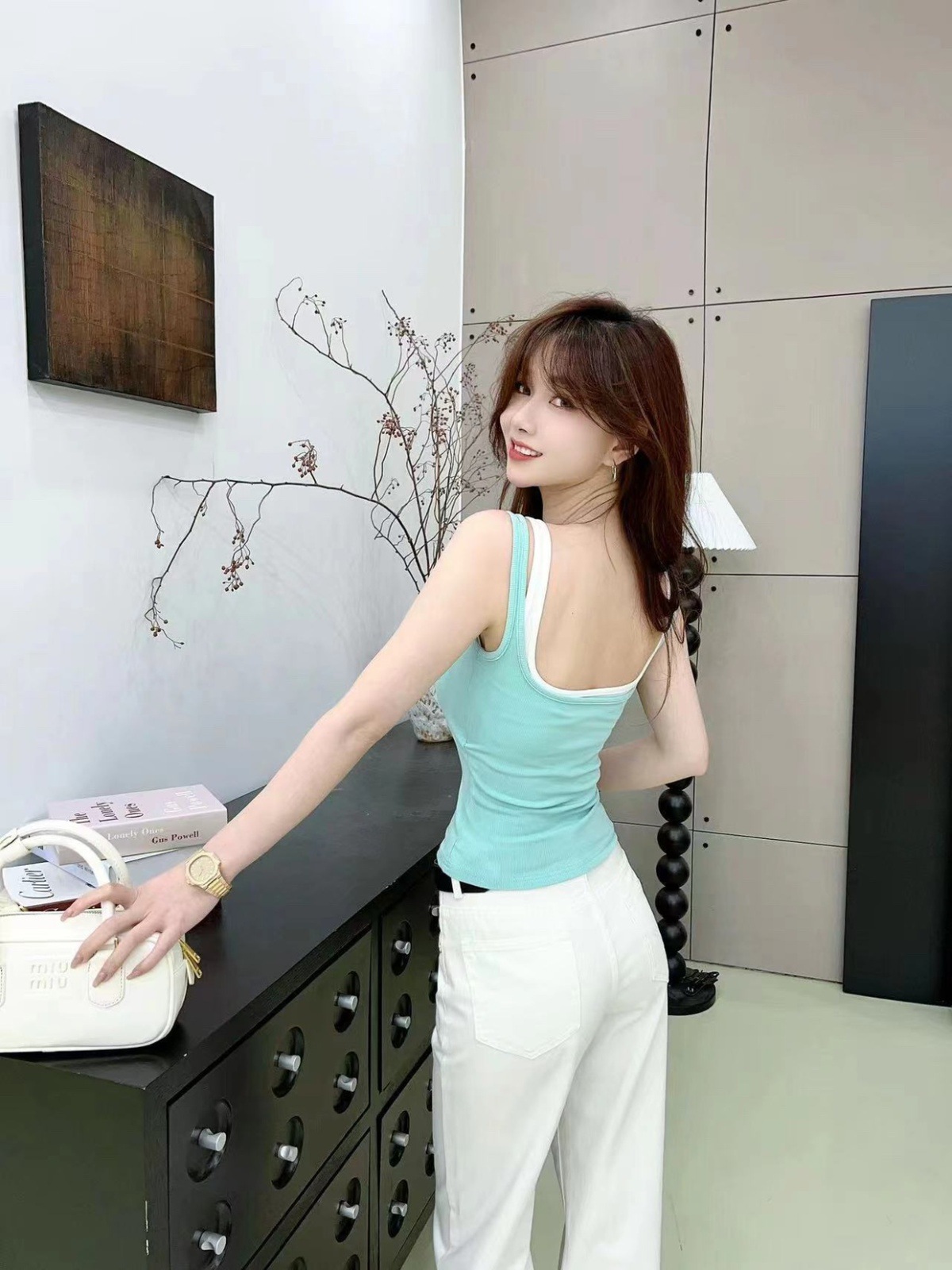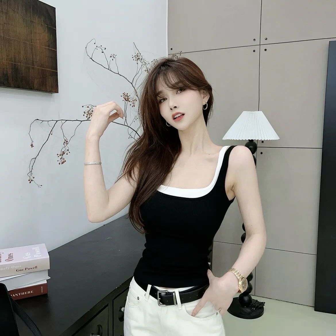 더블 무스 컬러 대비 가짜 2 피스 원피스 컵 카미 솔 조끼, 가슴 패드 여자 여름 아름다운 뒷면 슬림 핏 민소매 탑