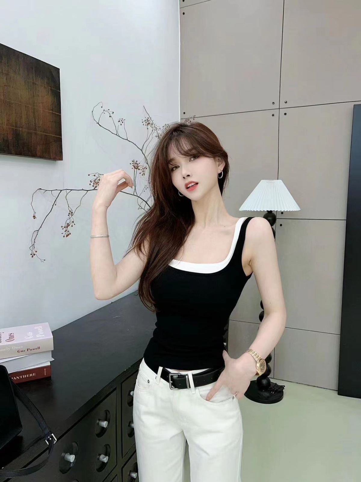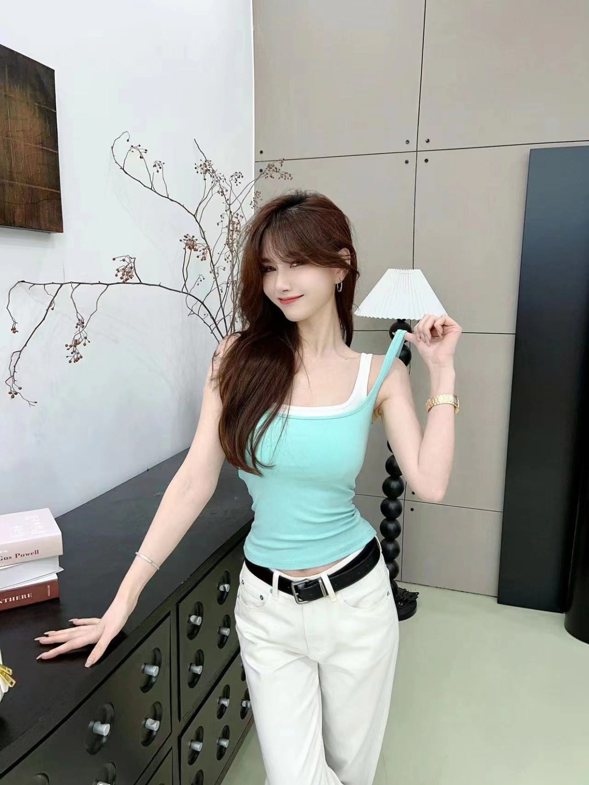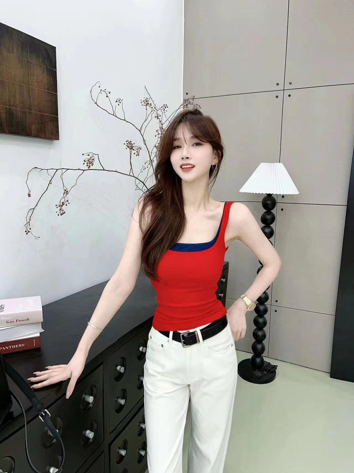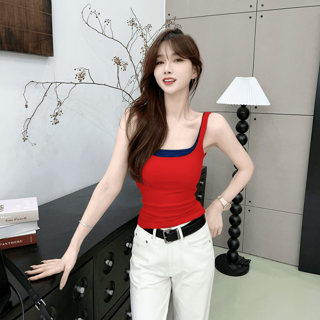 더블 무스 컬러 대비 가짜 2 피스 원피스 컵 카미 솔 조끼, 가슴 패드 여자 여름 아름다운 뒷면 슬림 핏 민소매 탑스토어 가기