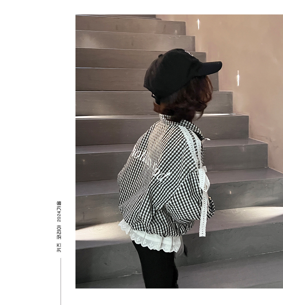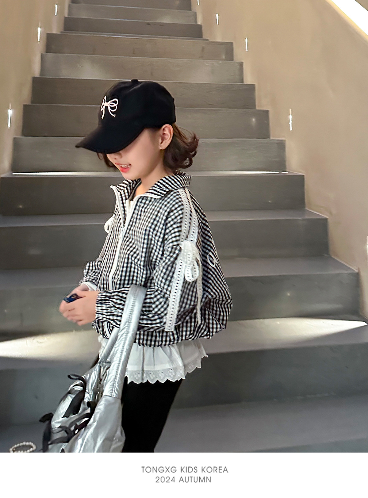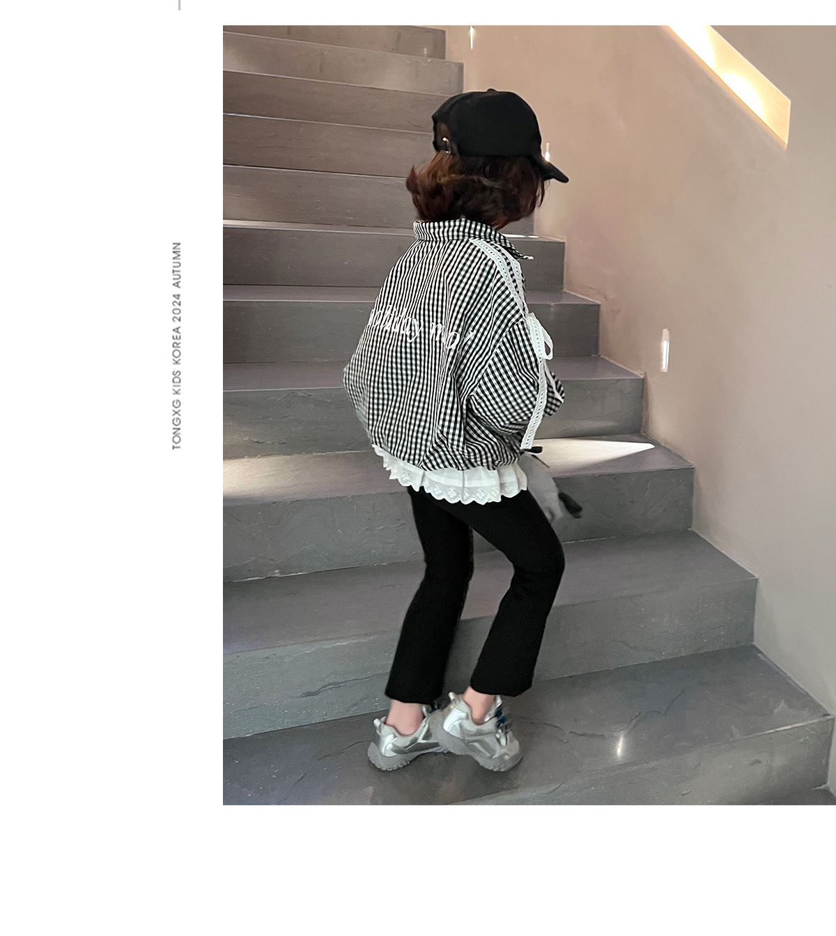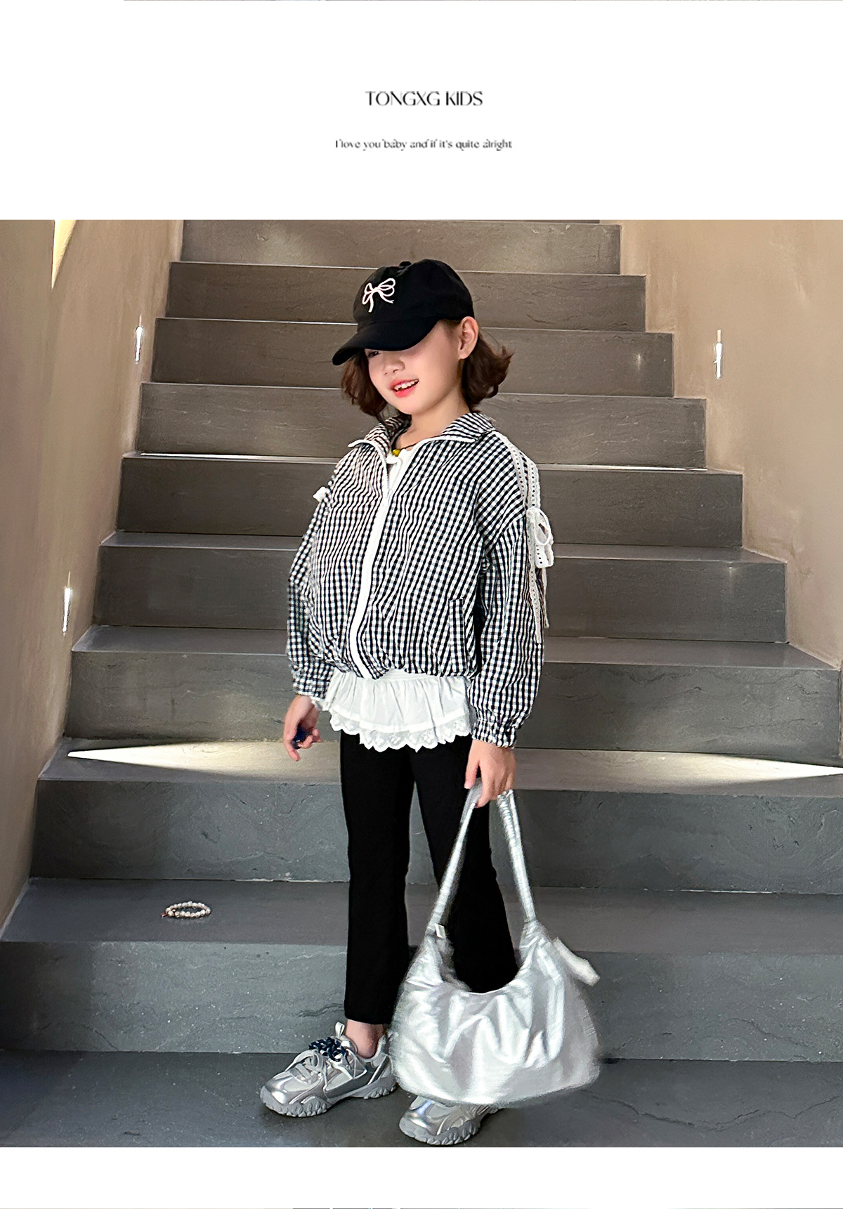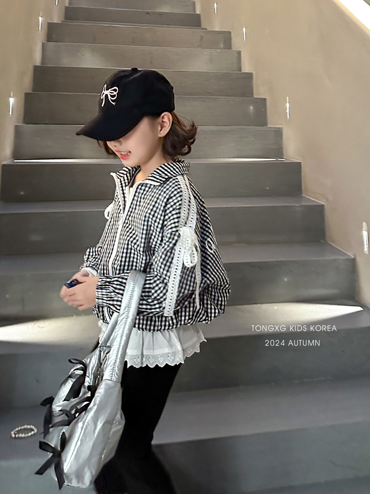 【재고 있음】2025 가을 신상 체크무늬 재킷, 중대형 여아용 스탠드 칼라 상의, 세련되고 넓은 짧은 스타일