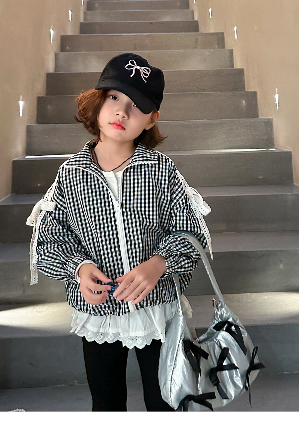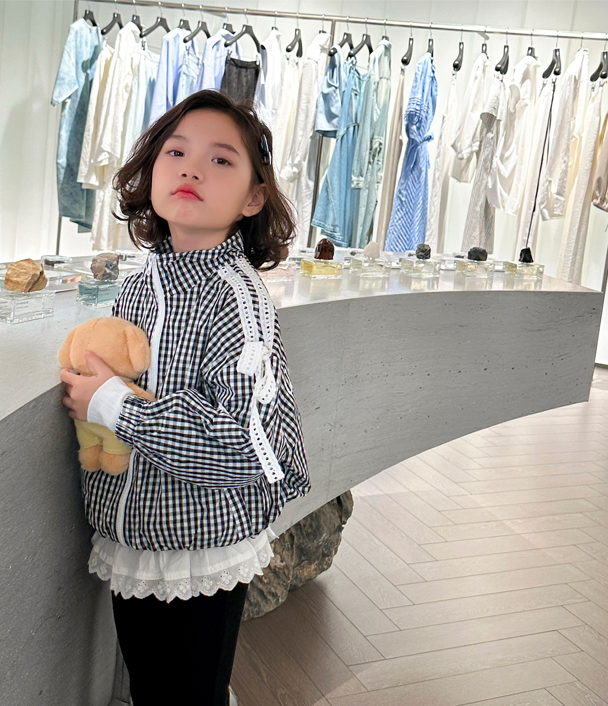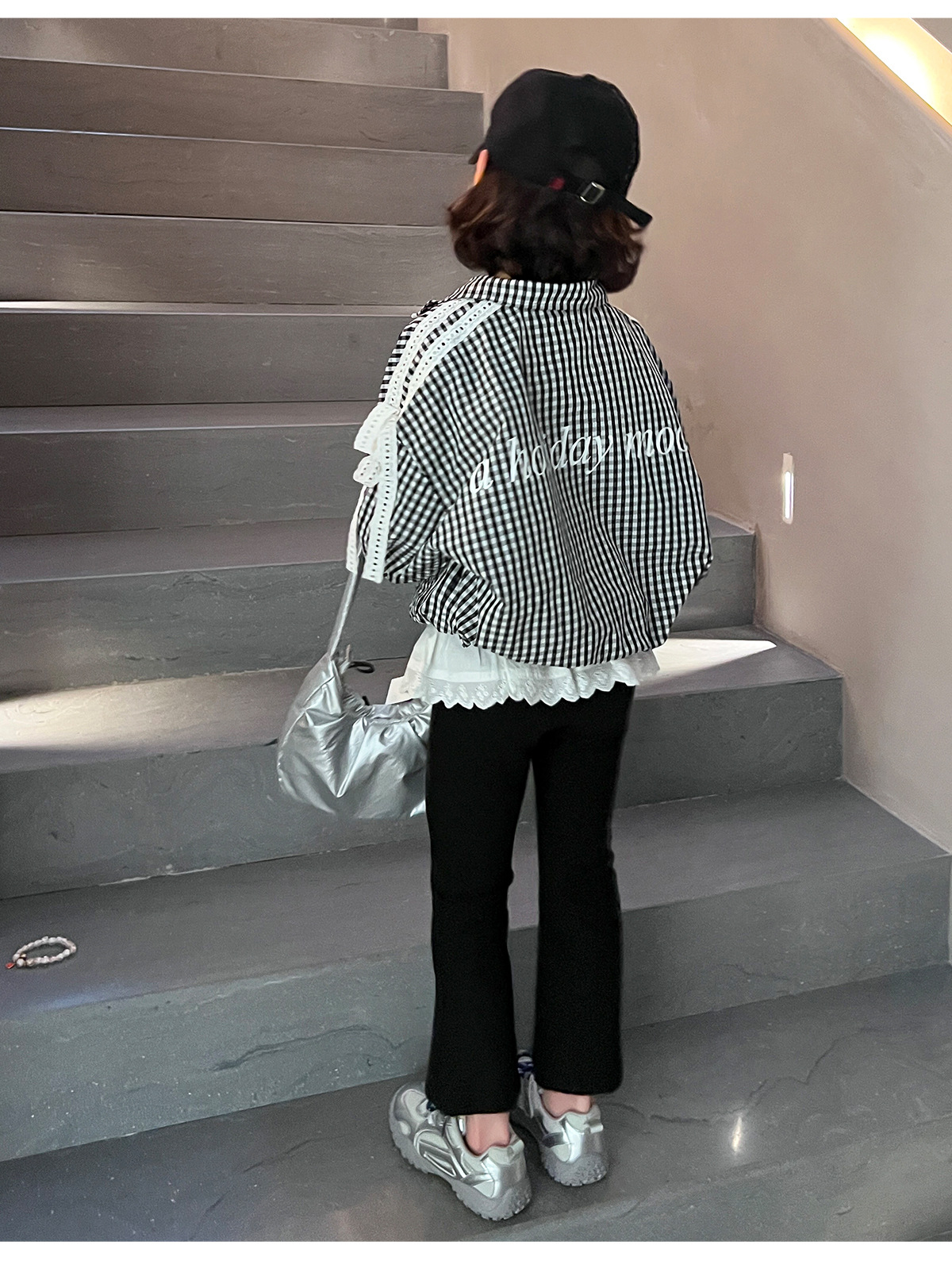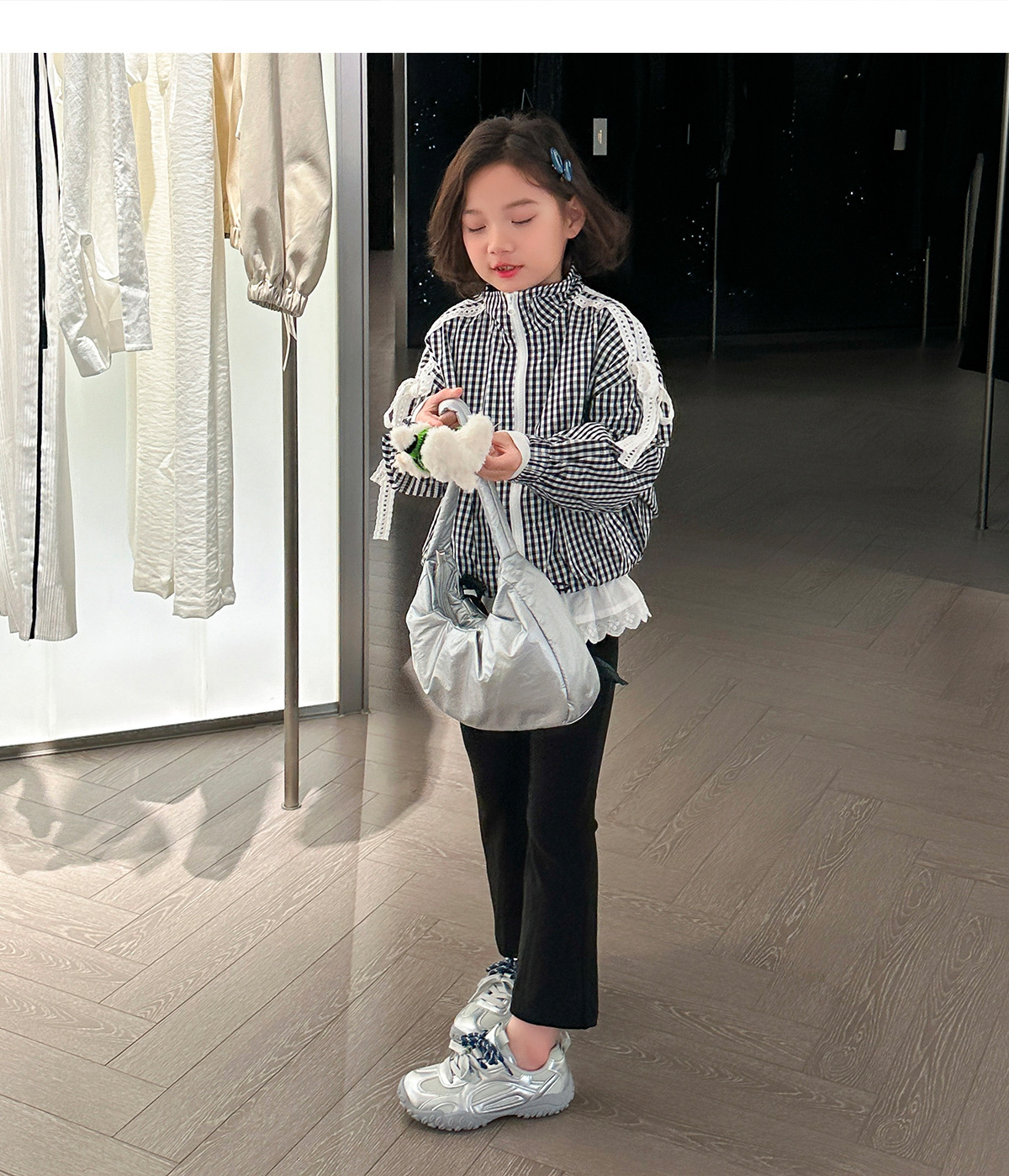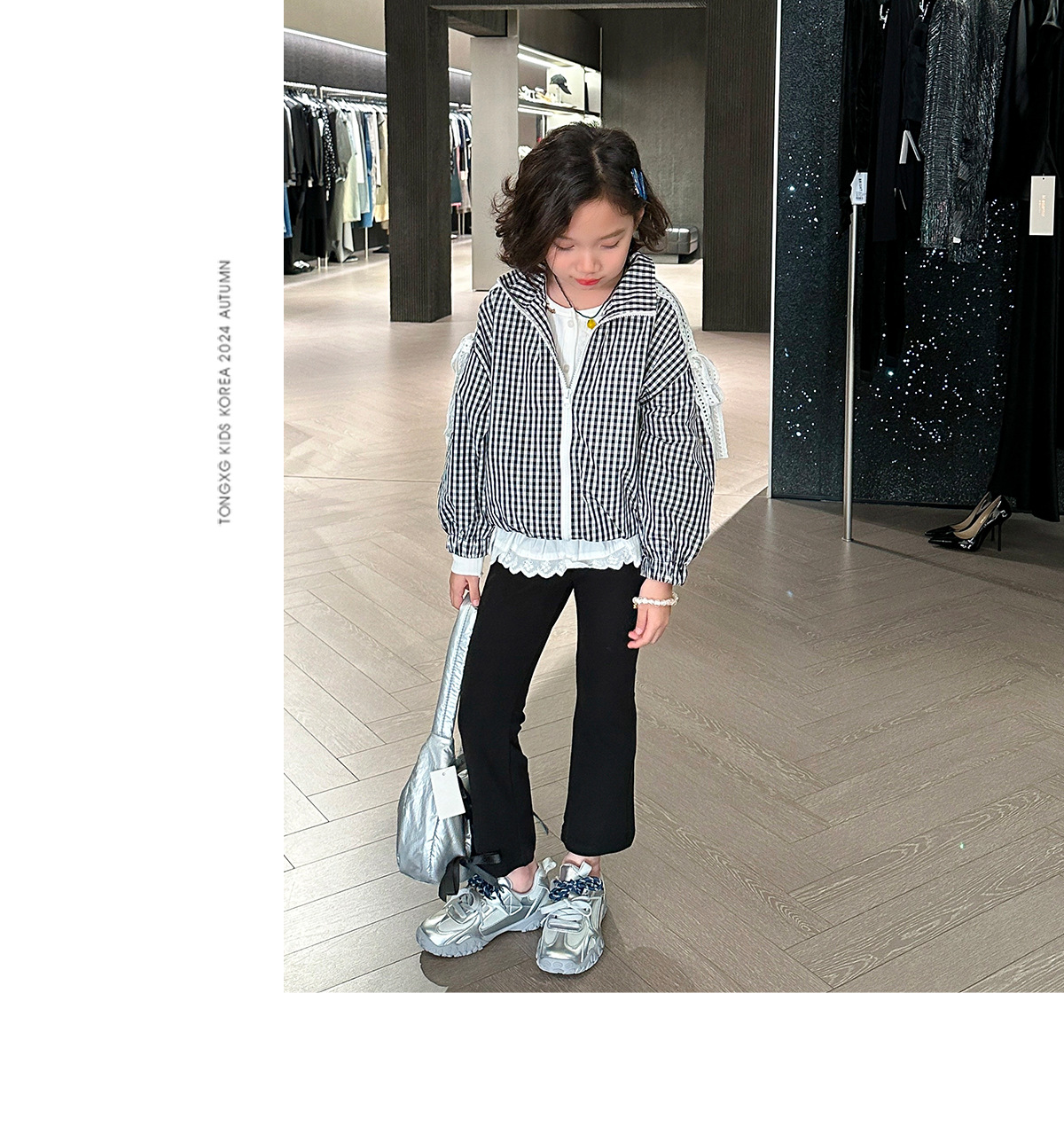 【재고 있음】2025 가을 신상 체크무늬 재킷, 중대형 여아용 스탠드 칼라 상의, 세련되고 넓은 짧은 스타일