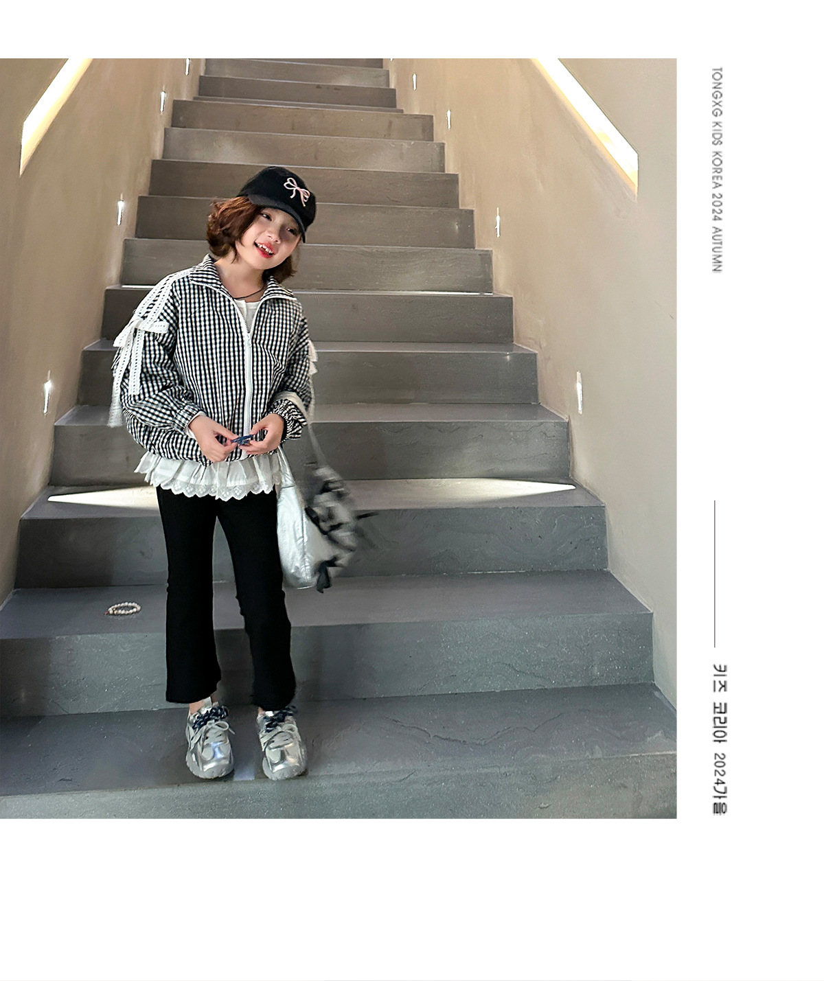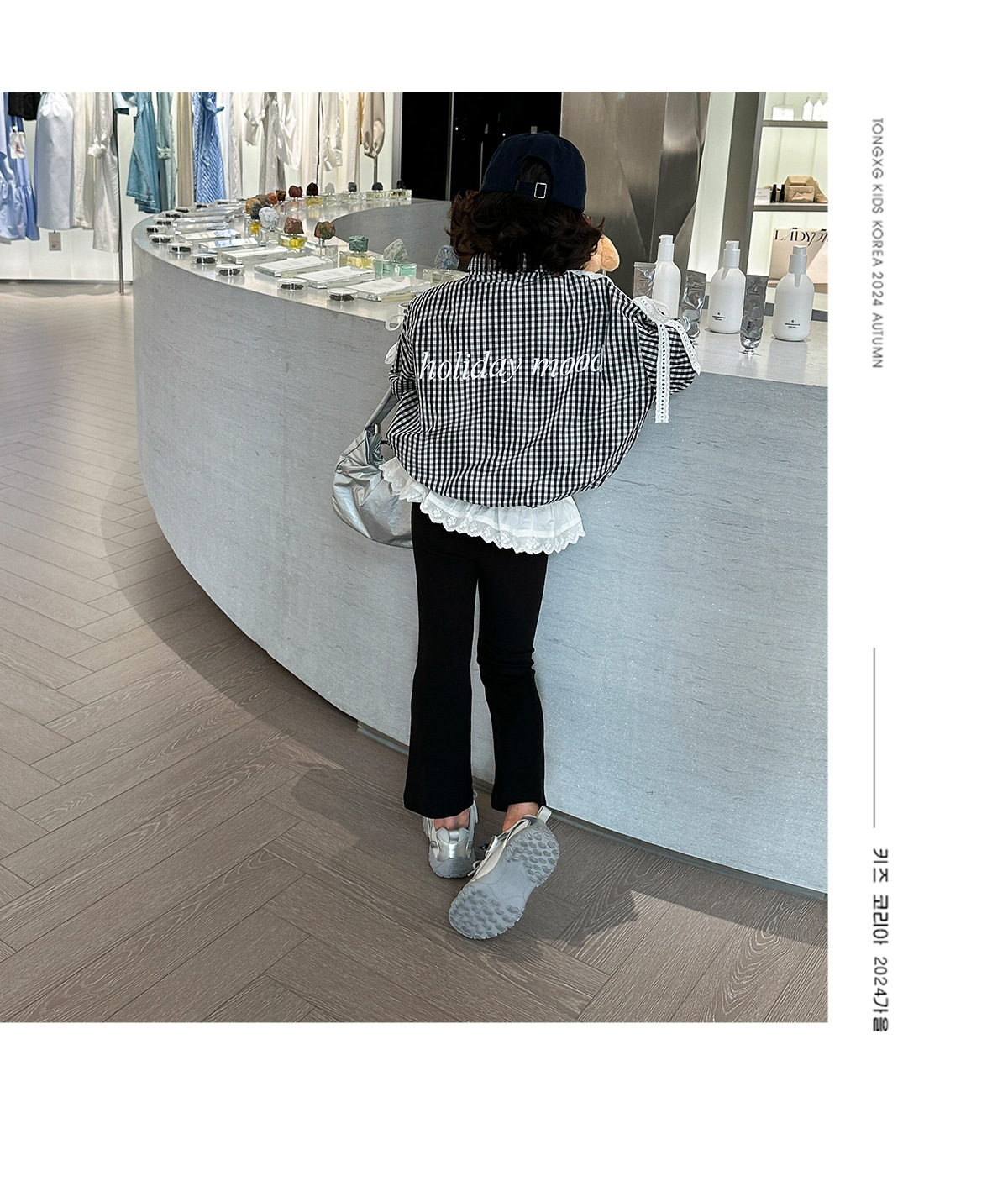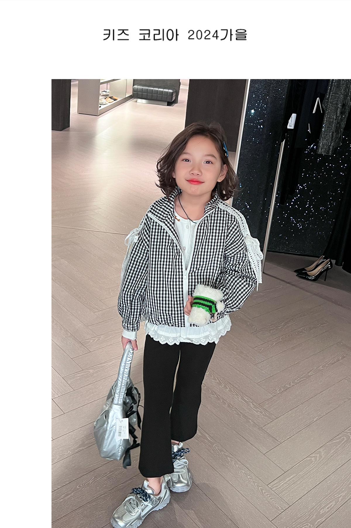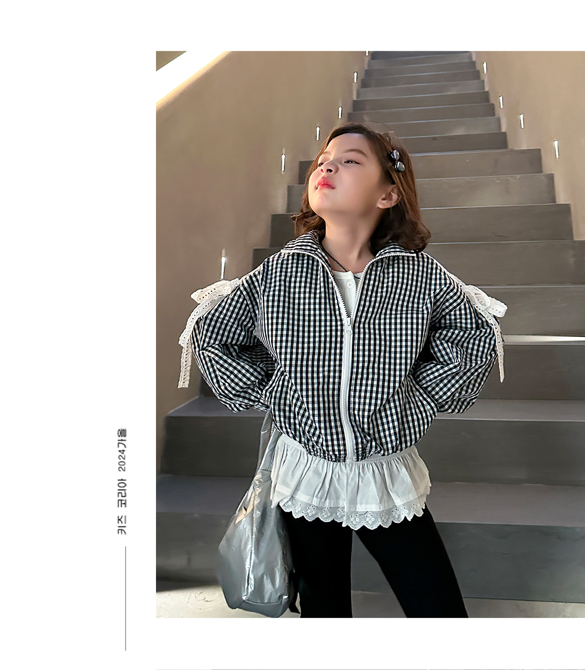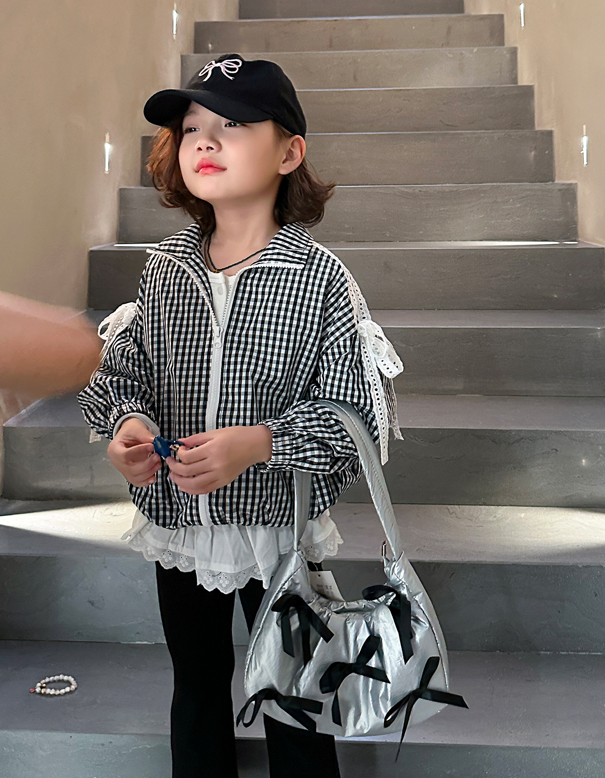 【재고 있음】2025 가을 신상 체크무늬 재킷, 중대형 여아용 스탠드 칼라 상의, 세련되고 넓은 짧은 스타일