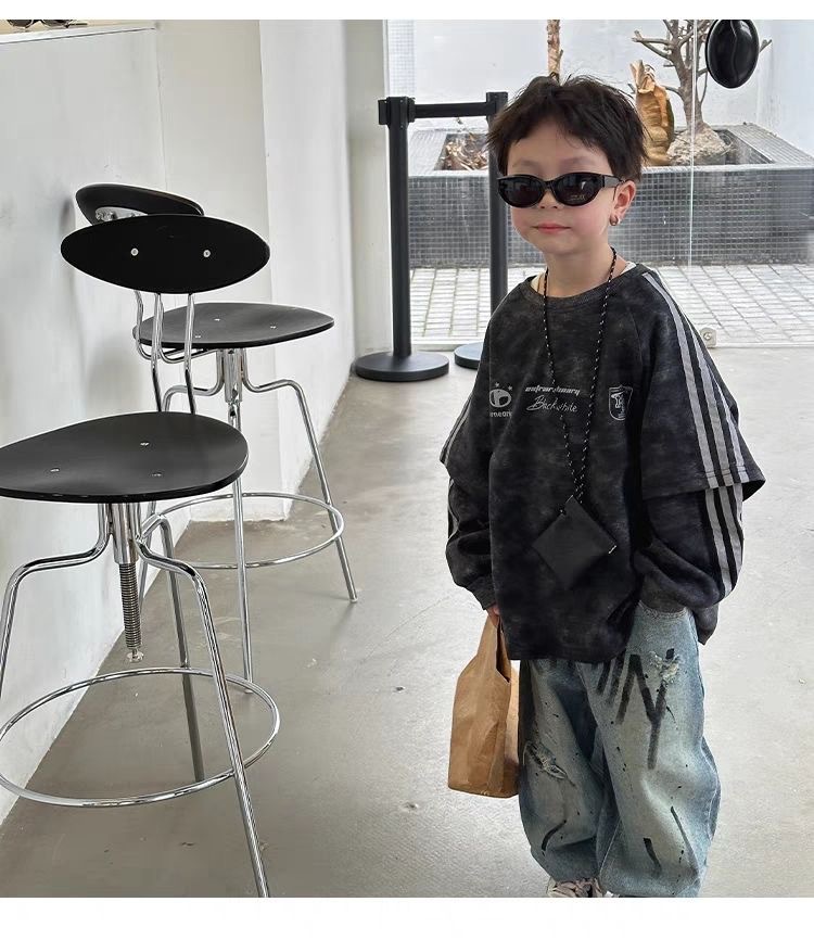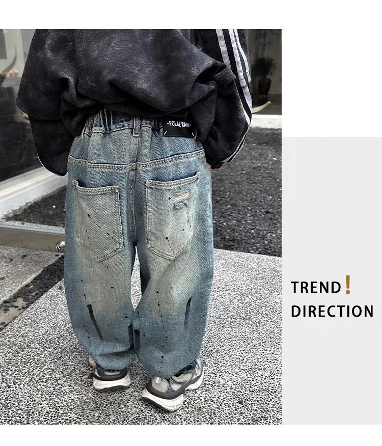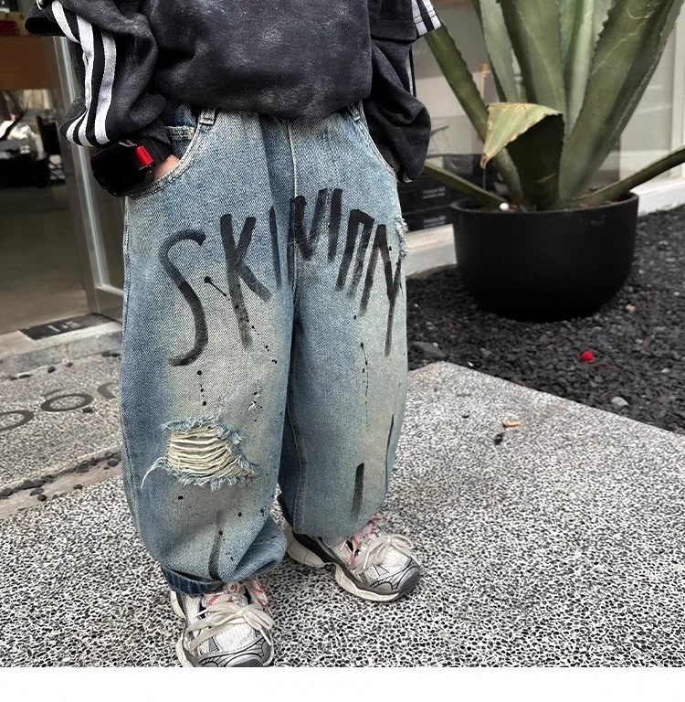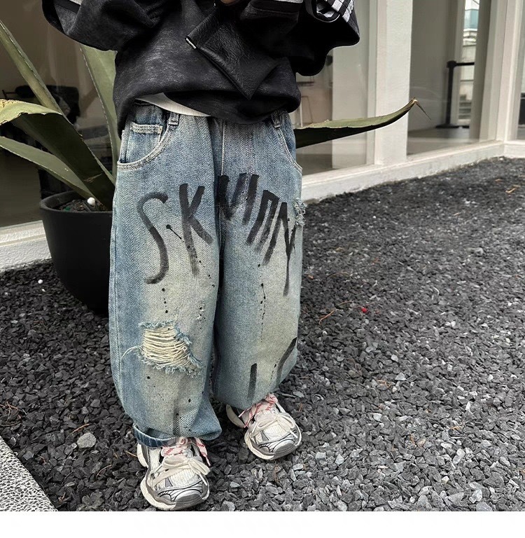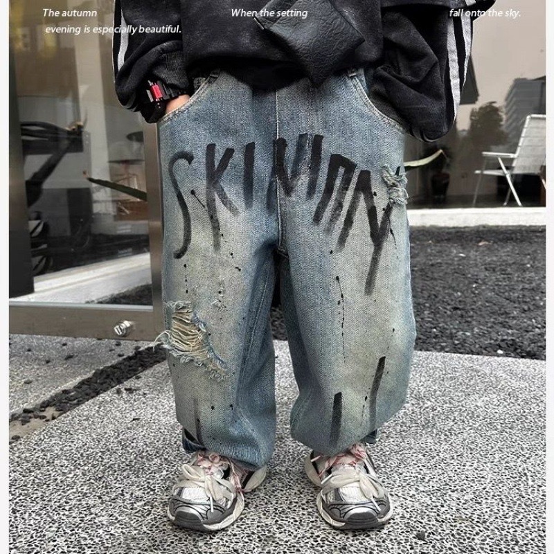 소년 가을 아동복 청바지 2025 새로운 느슨한 아동 바지 한국어 찢어진 편지 낙서 아빠 바지스토어 가기