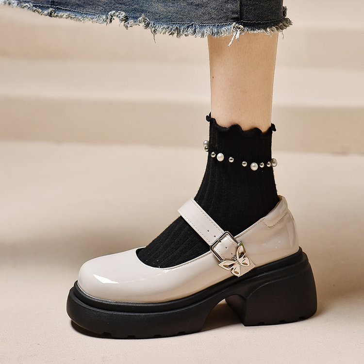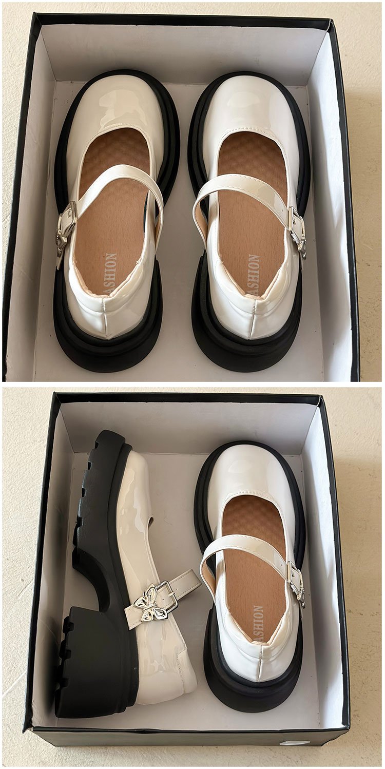 두꺼운 밑창 메리 제인 싱글 레이어 신발 여성 2024 가을 및 겨울 새로운 올 매치 대학 스타일 나비 버클 로퍼, 특허 가죽