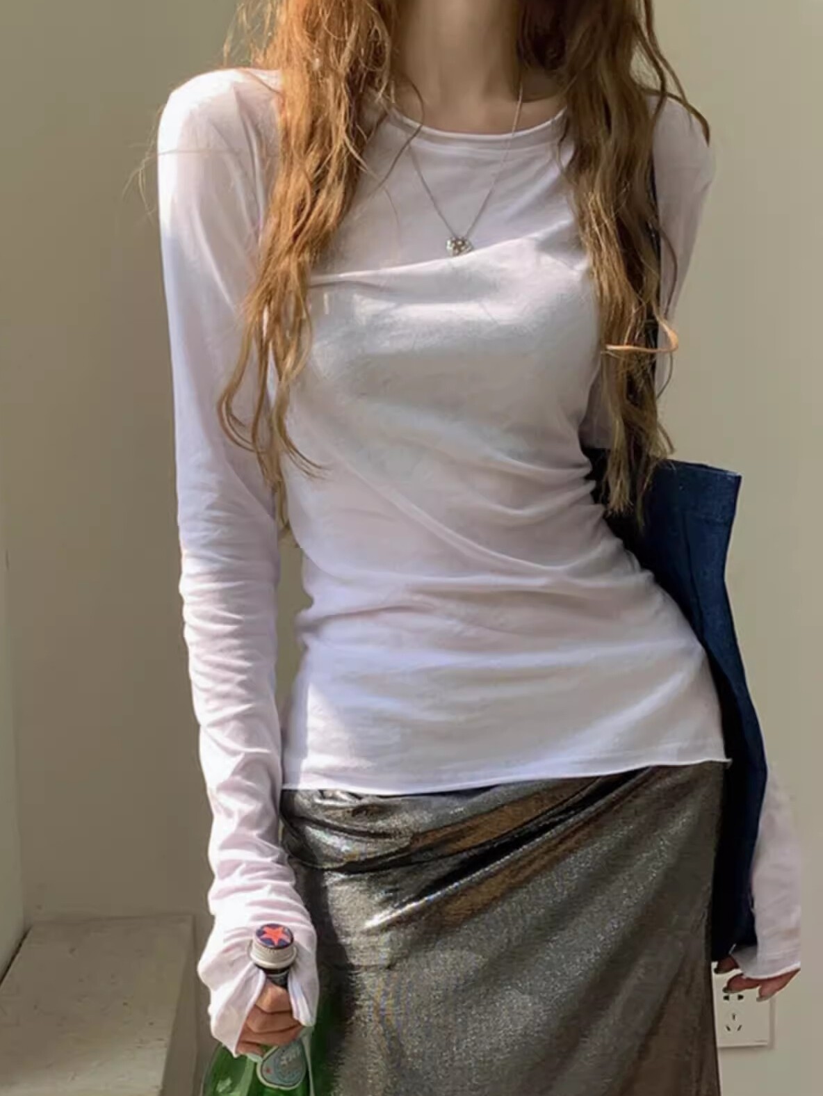 여성용 화이트 바텀 셔츠, 얇고 살짝 비치는 긴팔 티셔츠, 자외선 차단 블라우스, 봄 2025 슬림핏 심플 탑